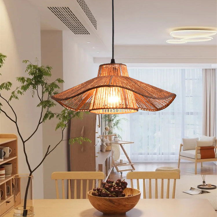Traditional Vintage Weaving Iron Paper Rope Hat Cylinder 1-Light Pendant Light For Dining Room