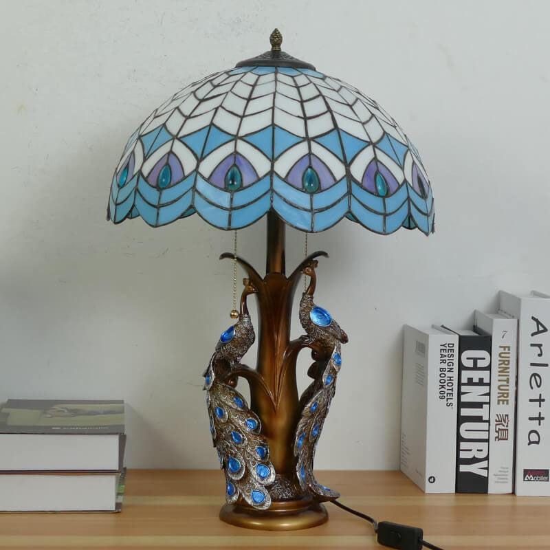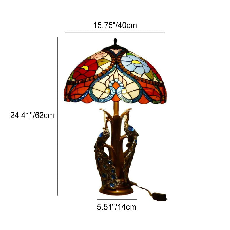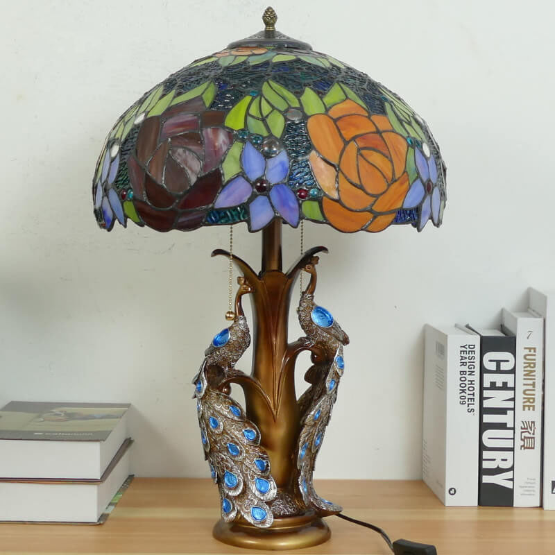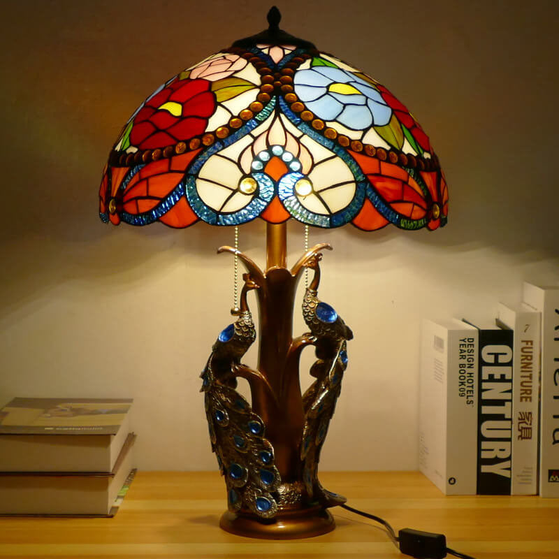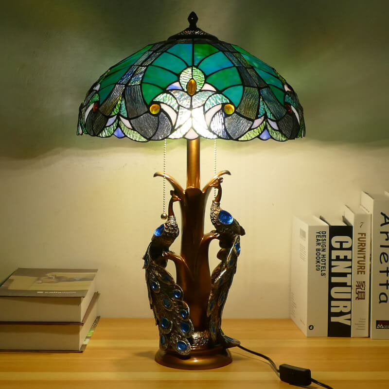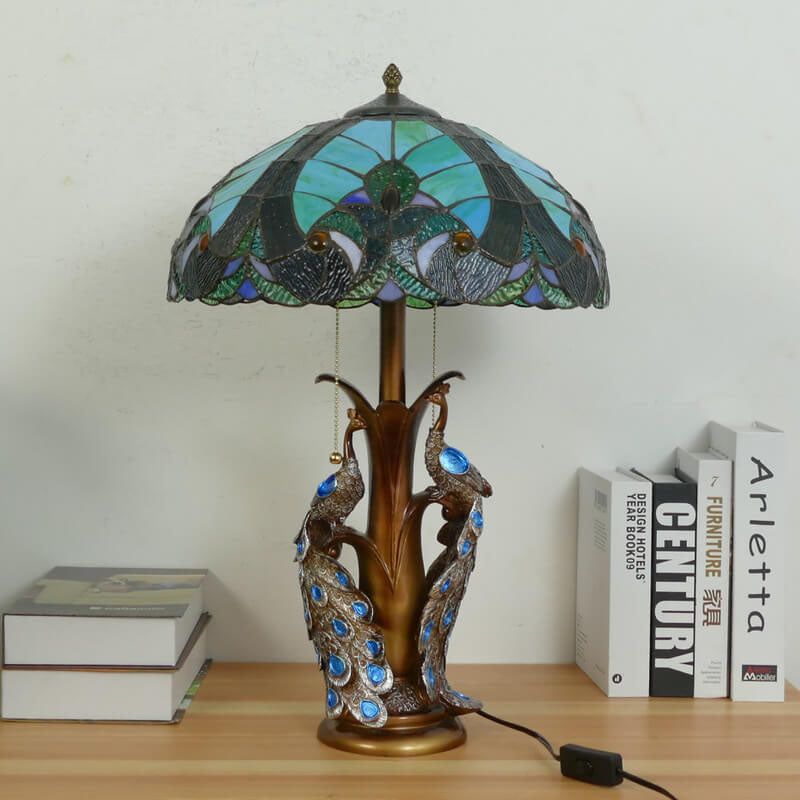 Vintage Tiffany Stained Glass Dome Peacock Base 2-Light Table Lamp