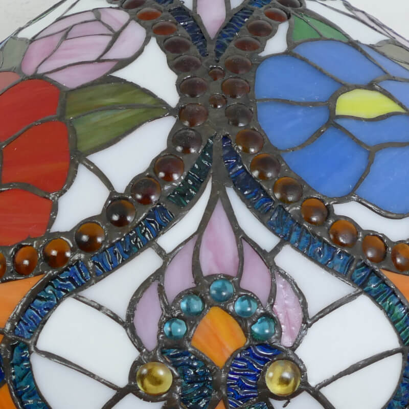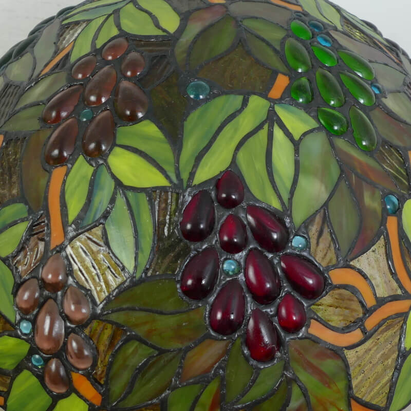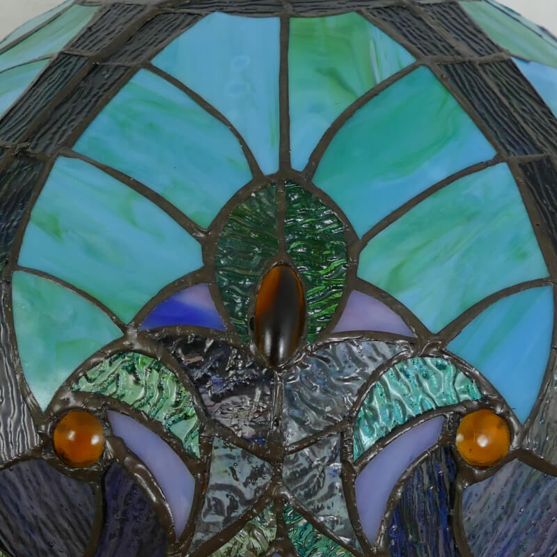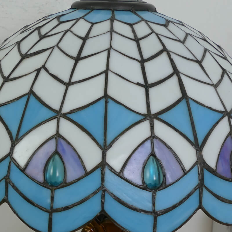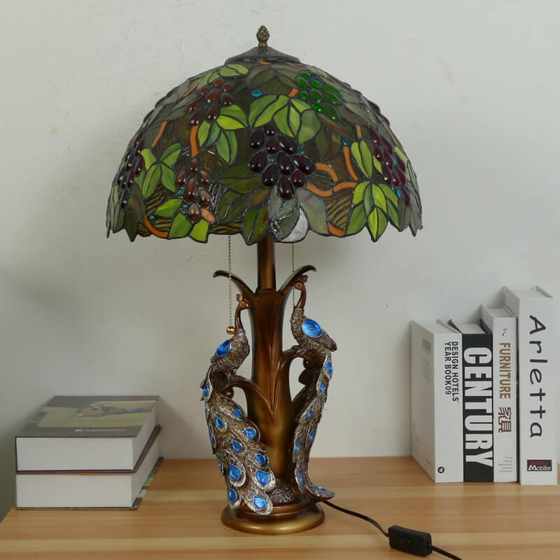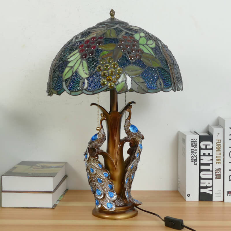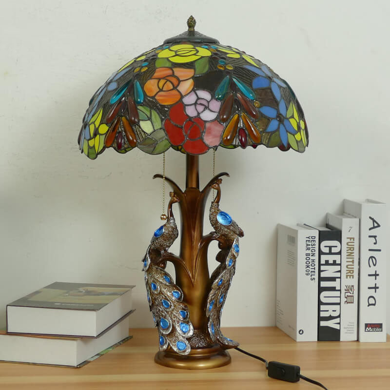 Vintage Tiffany Stained Glass Dome Peacock Base 2-Light Table Lamp