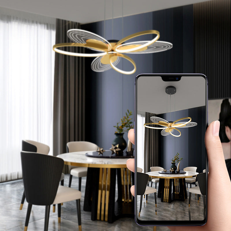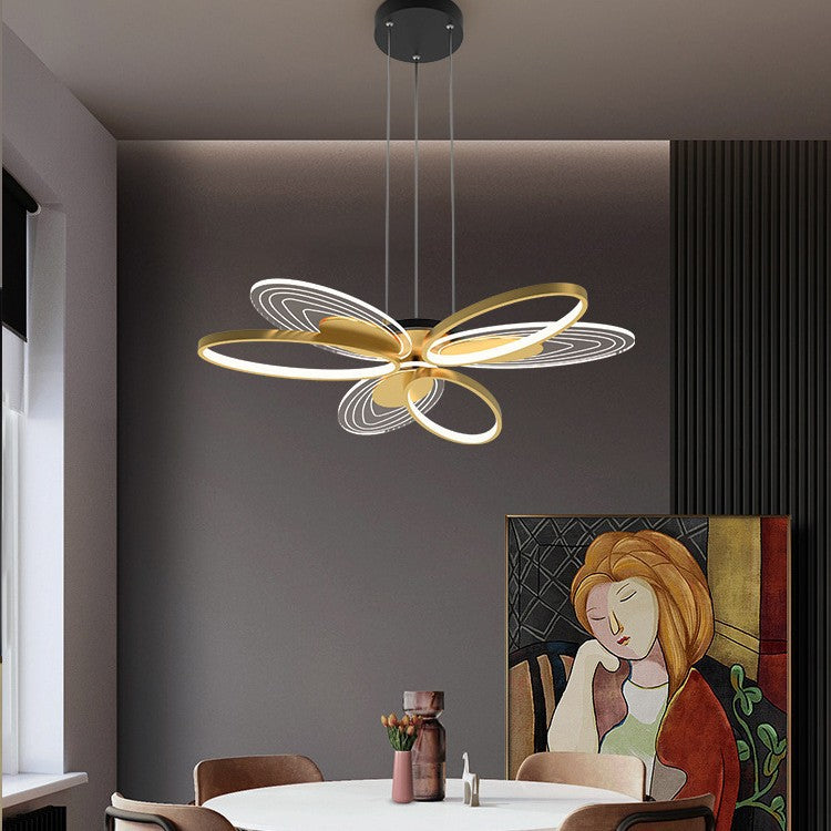 Featuring a unique floral and oval-shaped design in an elegant gold finish, this chandelier combines iron, aluminum, and acrylic for a modern yet refined look. The LED light source emits soft, even illumination—perfect for adding creative flair to dining areas, bedrooms, or living rooms.