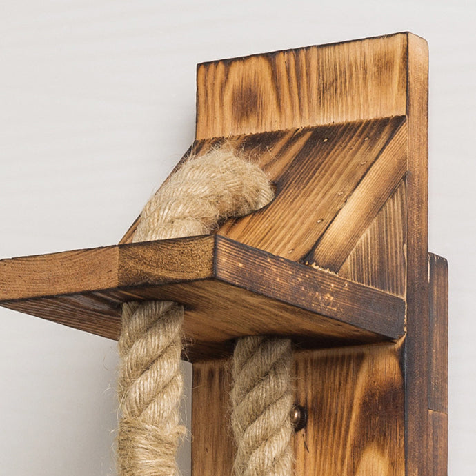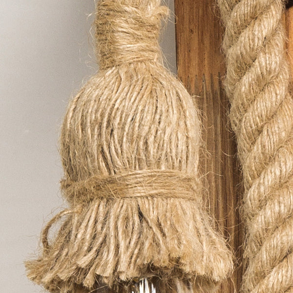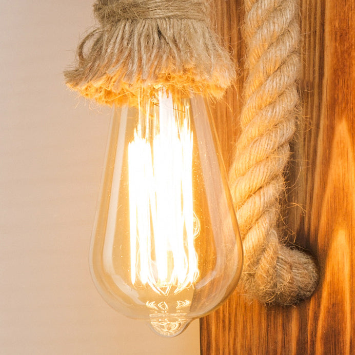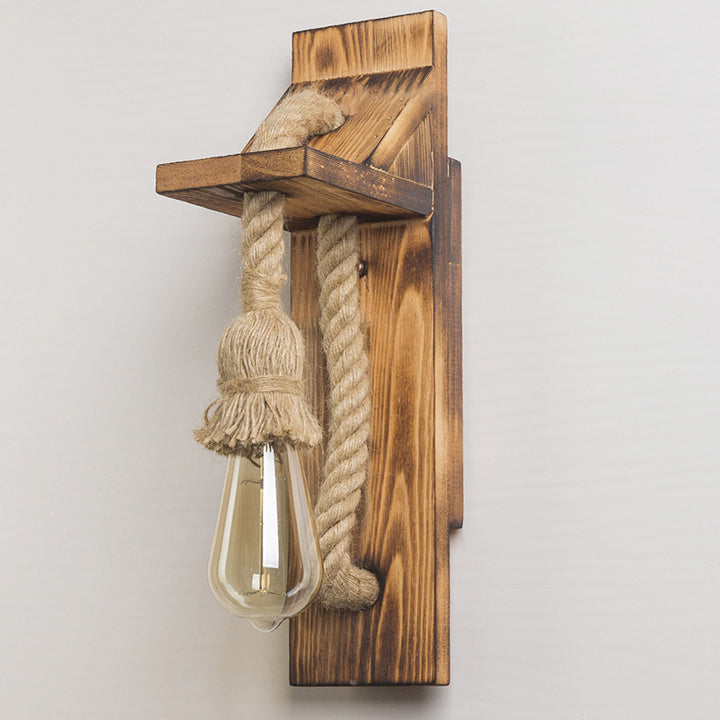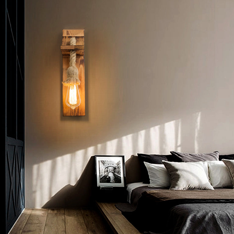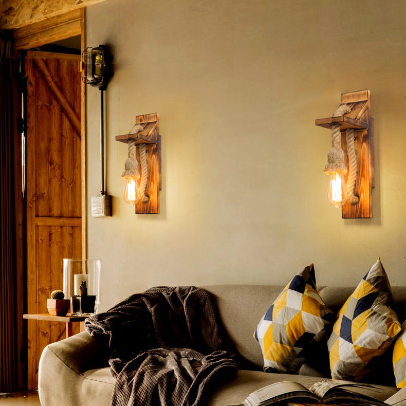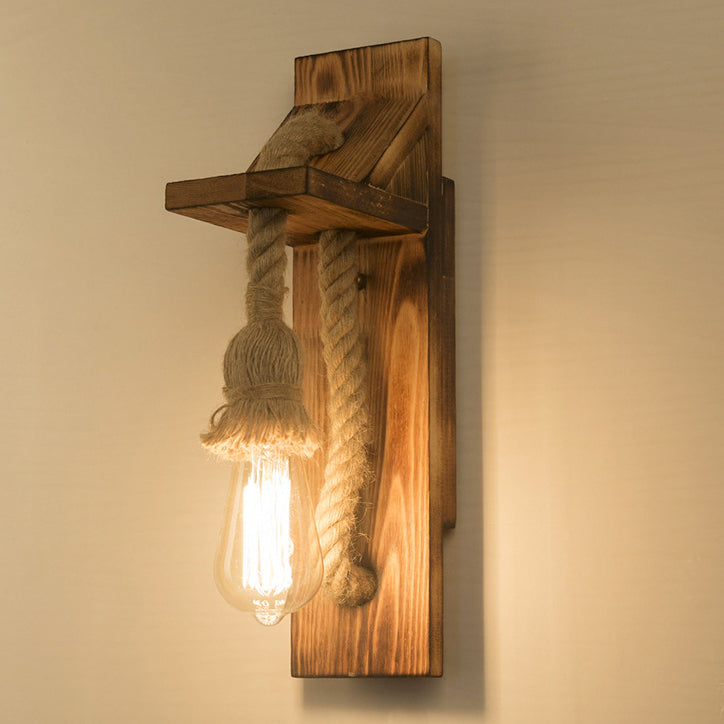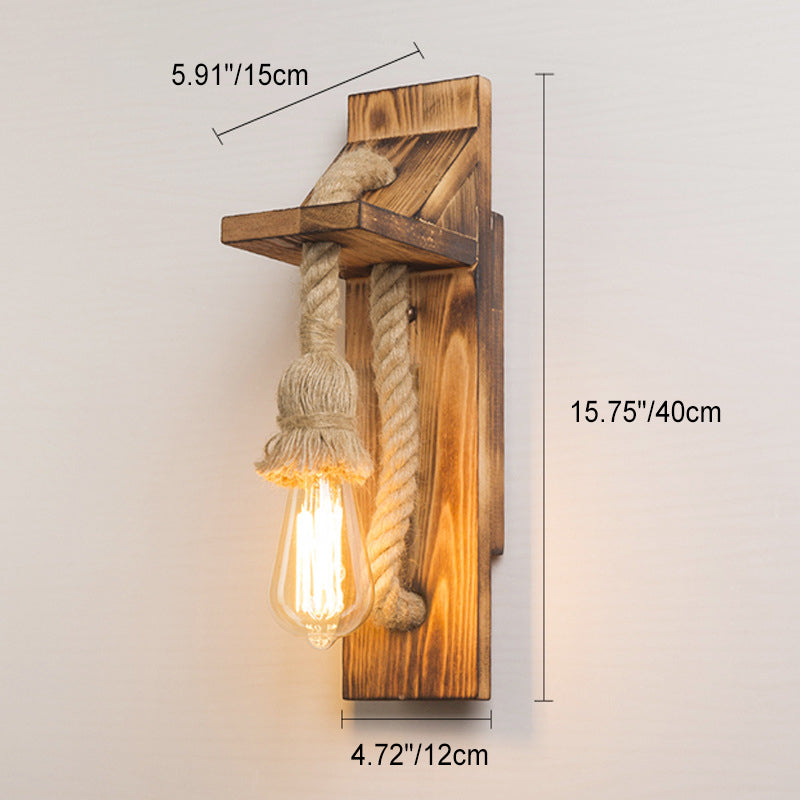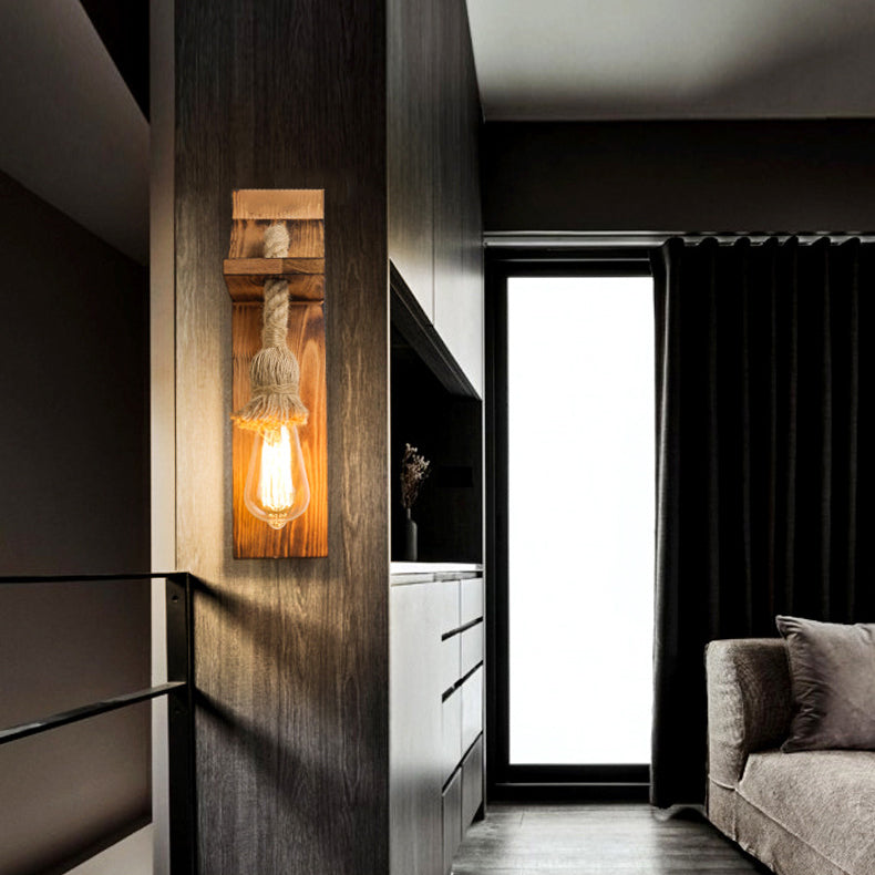 Contemporary Industrial Rectangular Wood Hemp Rope 1-Light Wall Sconce Lamp For Living Room