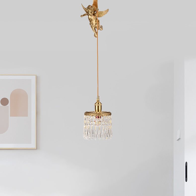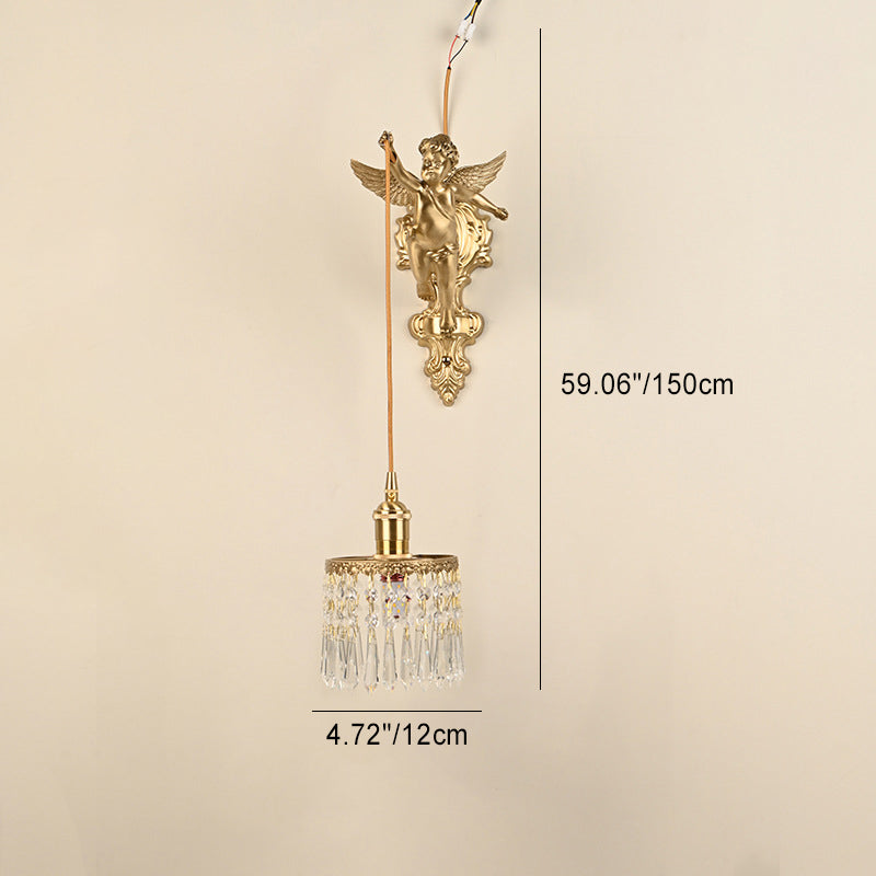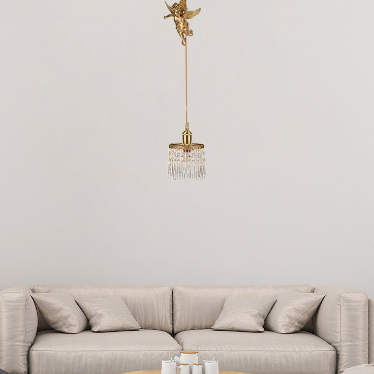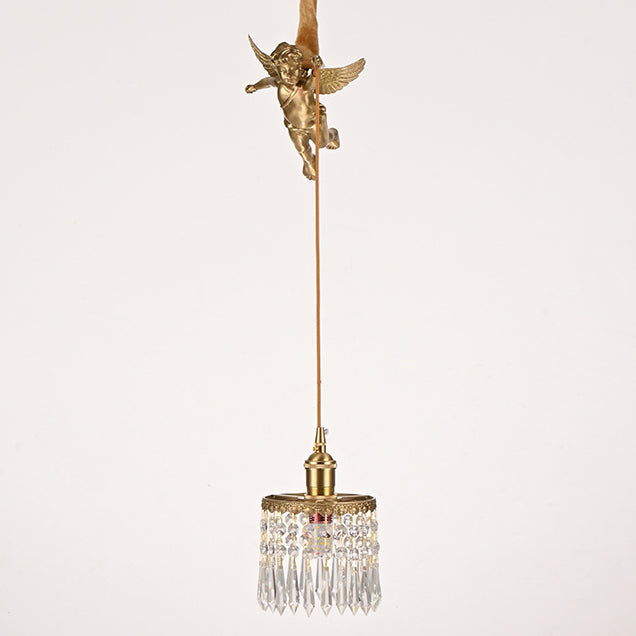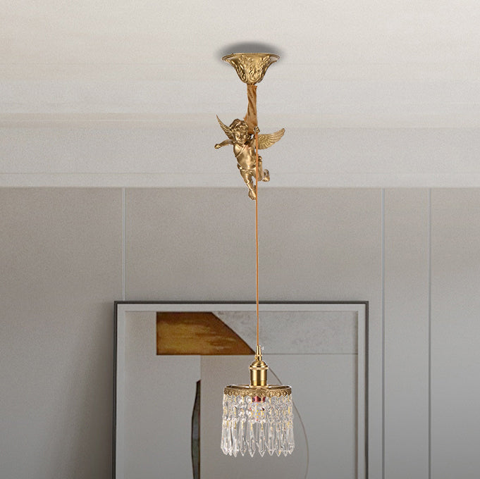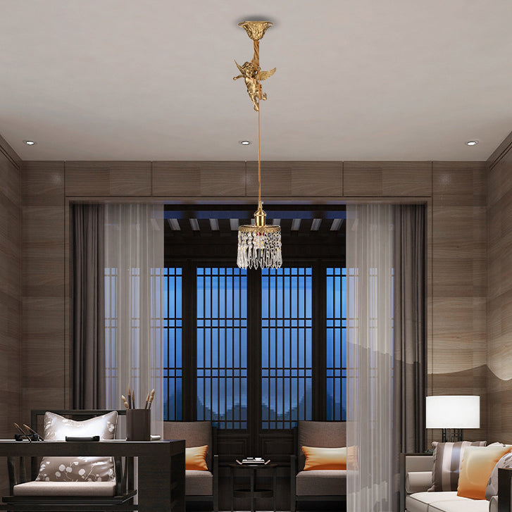 Contemporary Luxury Carved Brass Angel Crystal Round Shade 1-Light Pendant Light For Living Room