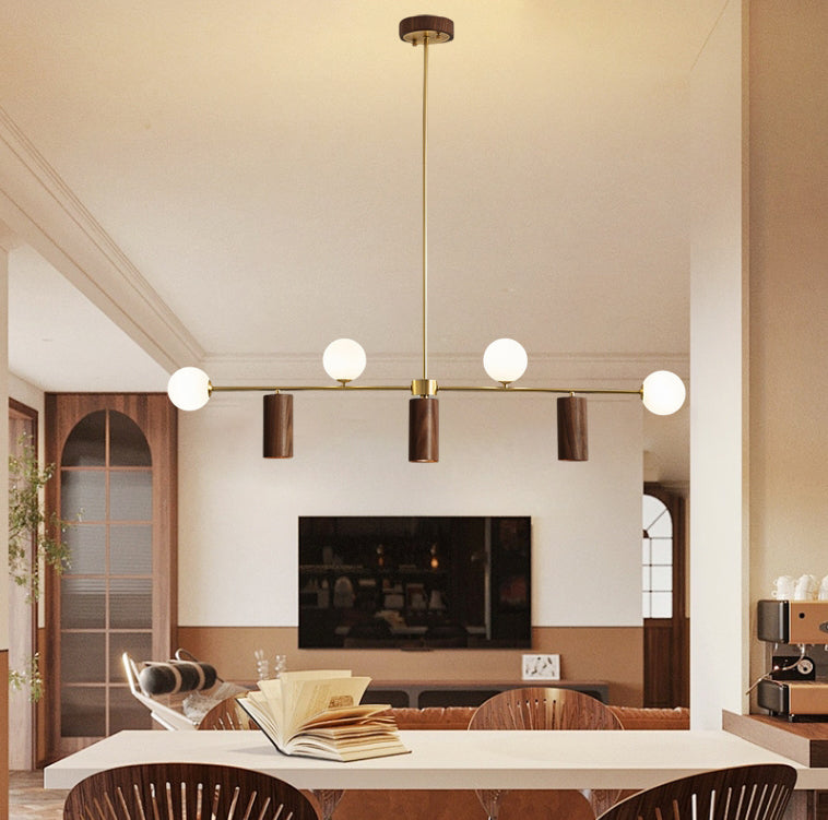 This Nordic island chandelier blends natural walnut wood with brass accents and features a refined mix of glass ball and cylinder shapes. The four upper globes house G9 bulbs for warm lighting, while three downward-facing LED spotlights provide functional brightness. With its minimalist form and preserved wood grain, it's a stylish lighting solution for modern dining spaces.