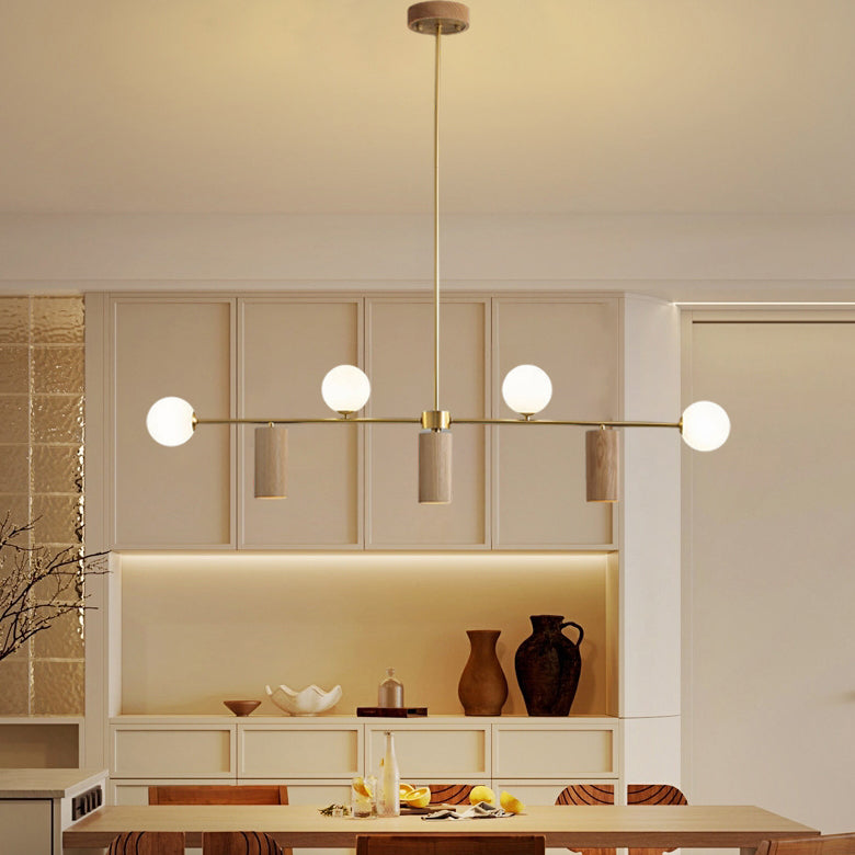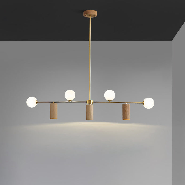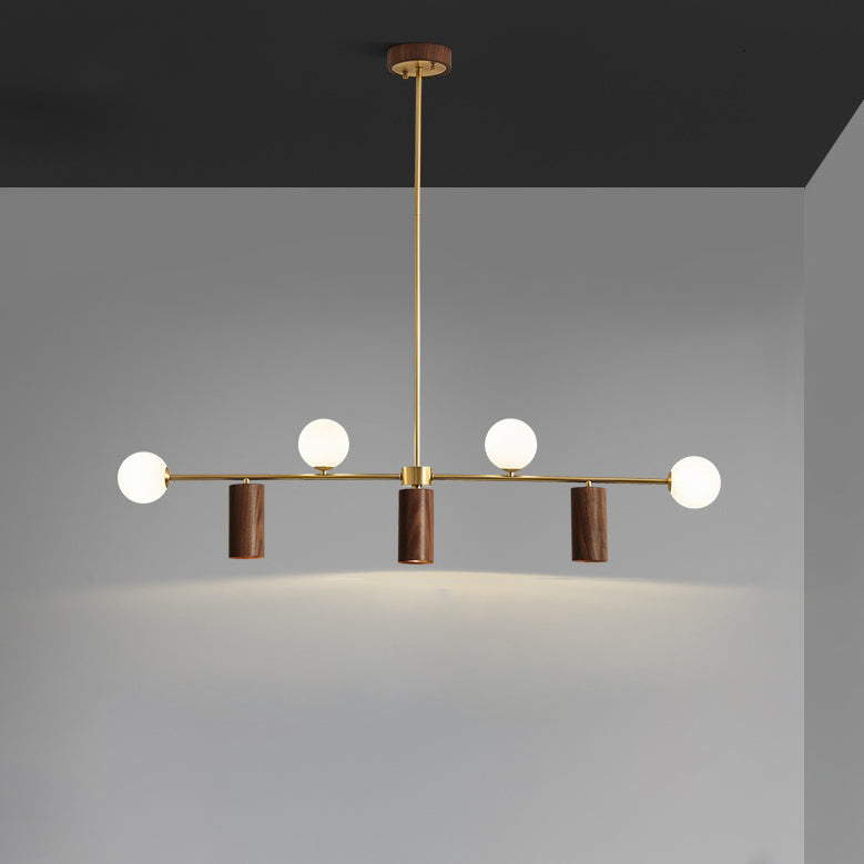 Contemporary Nordic Walnut Brass Glass Ball & Cylinder Spotlight 4-Light LED Chandelier Island Light For Dining Room
