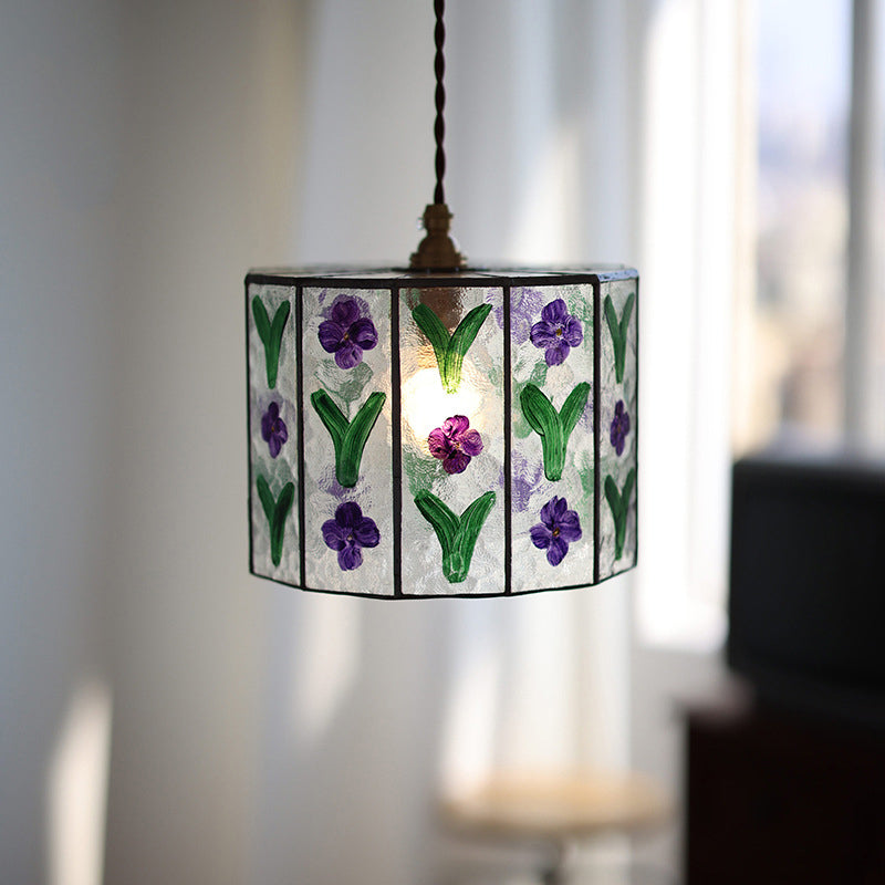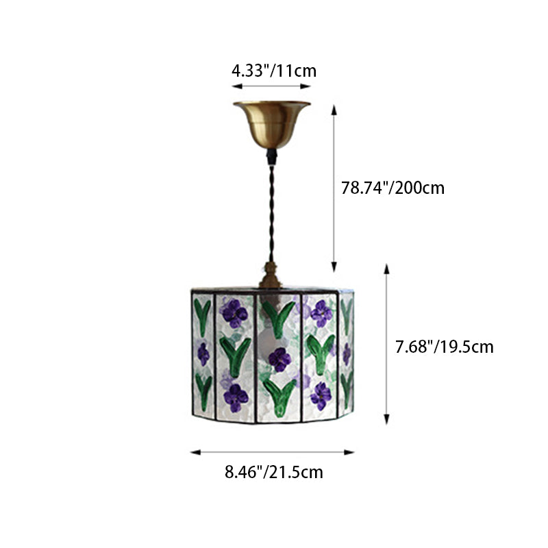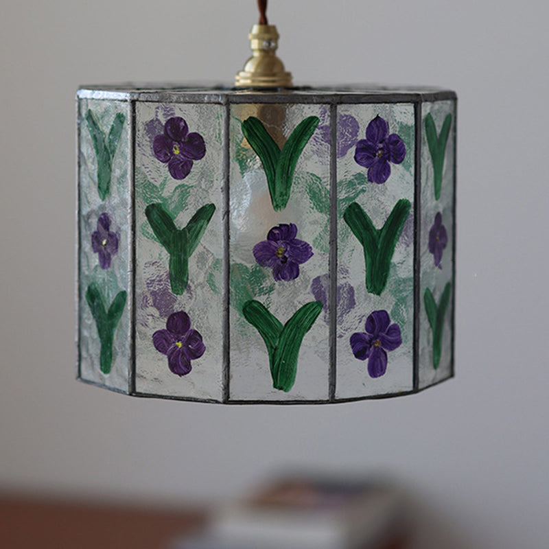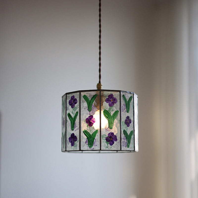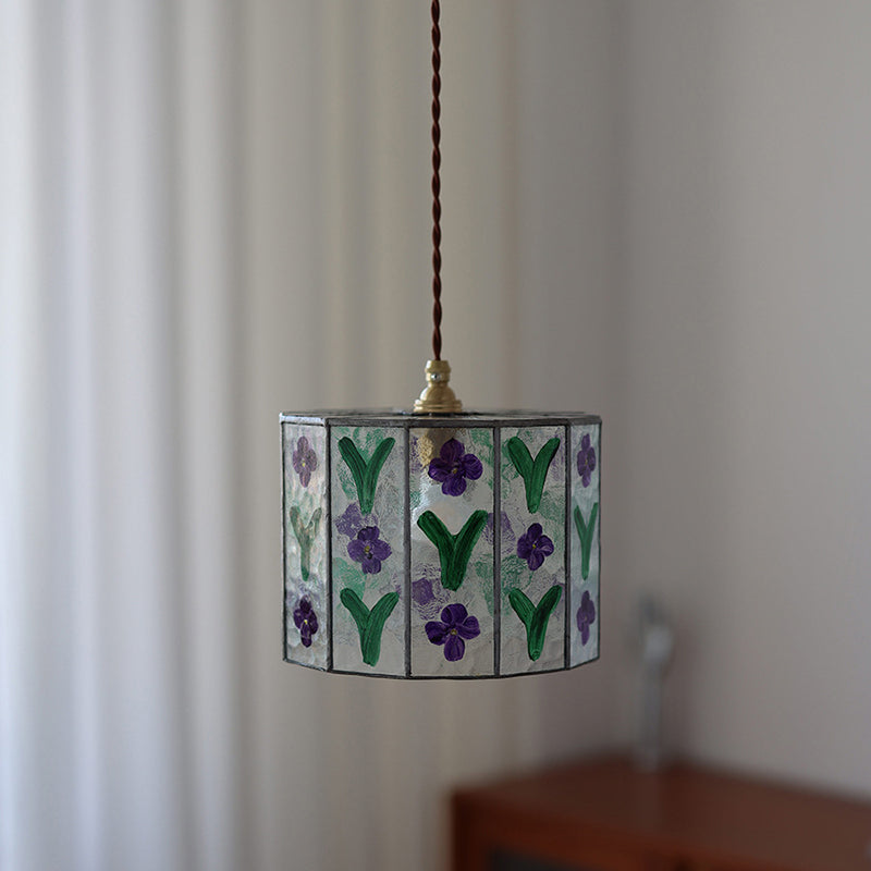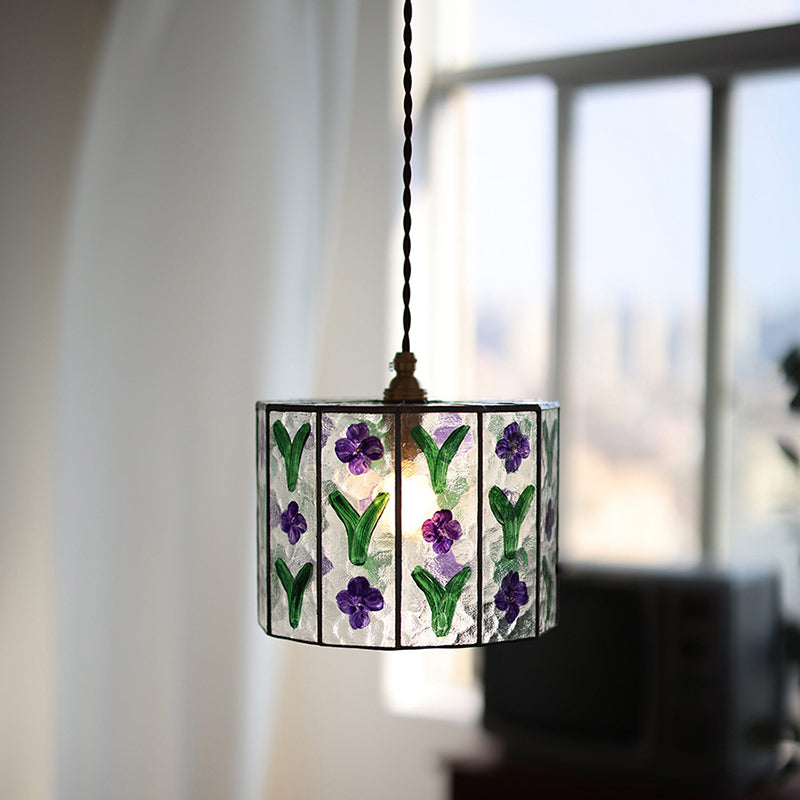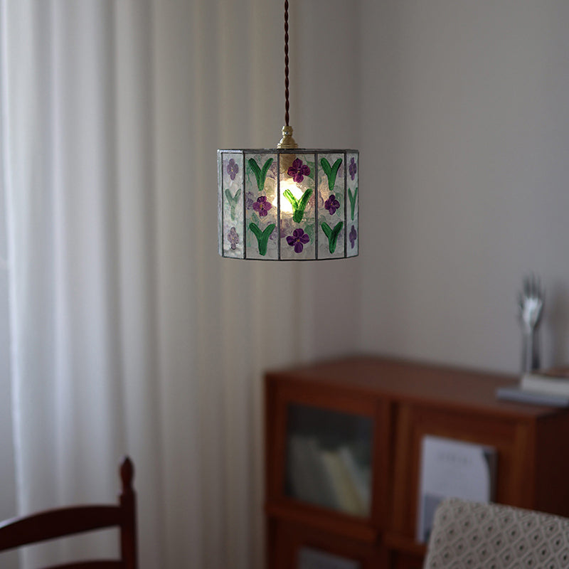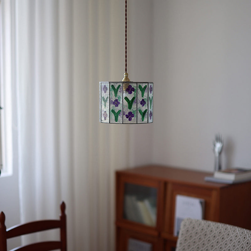 Contemporary Retro Brass Glass Cylinder Hand Painted Flower Leaf 1-Light Pendant Light For Dining Room