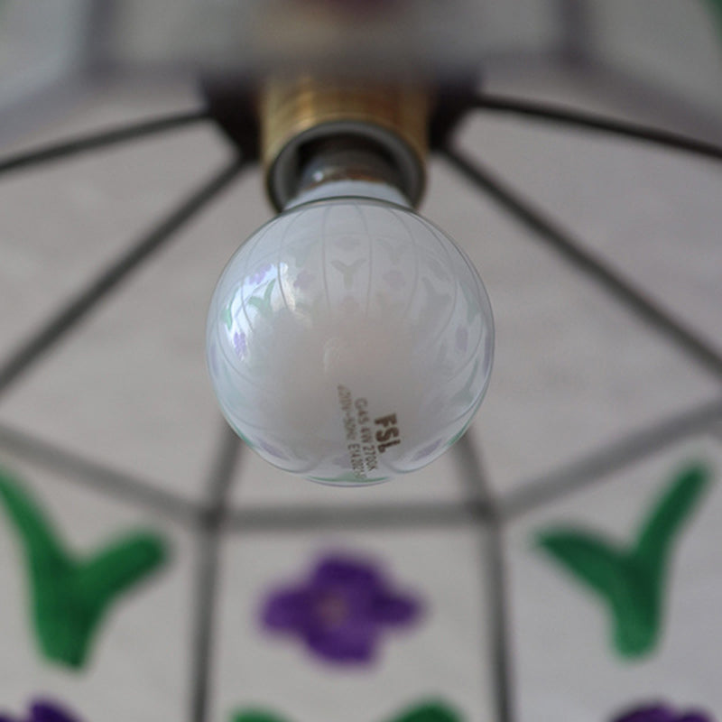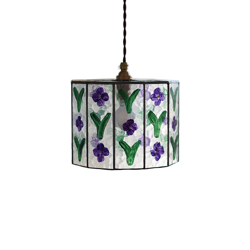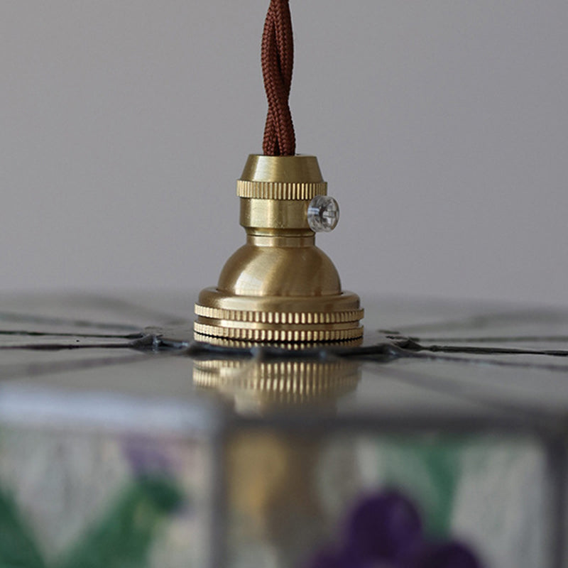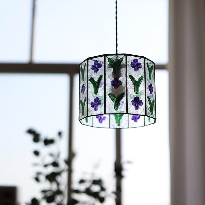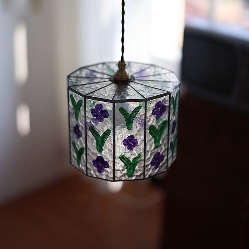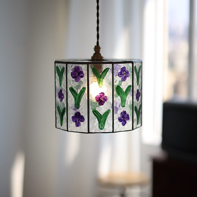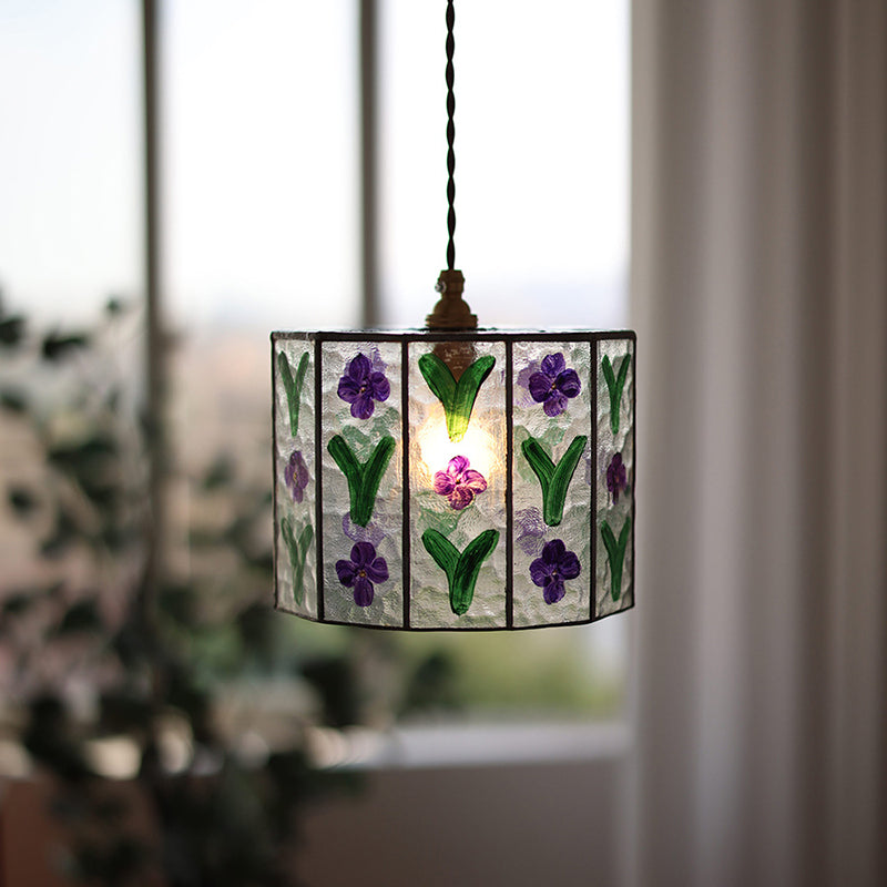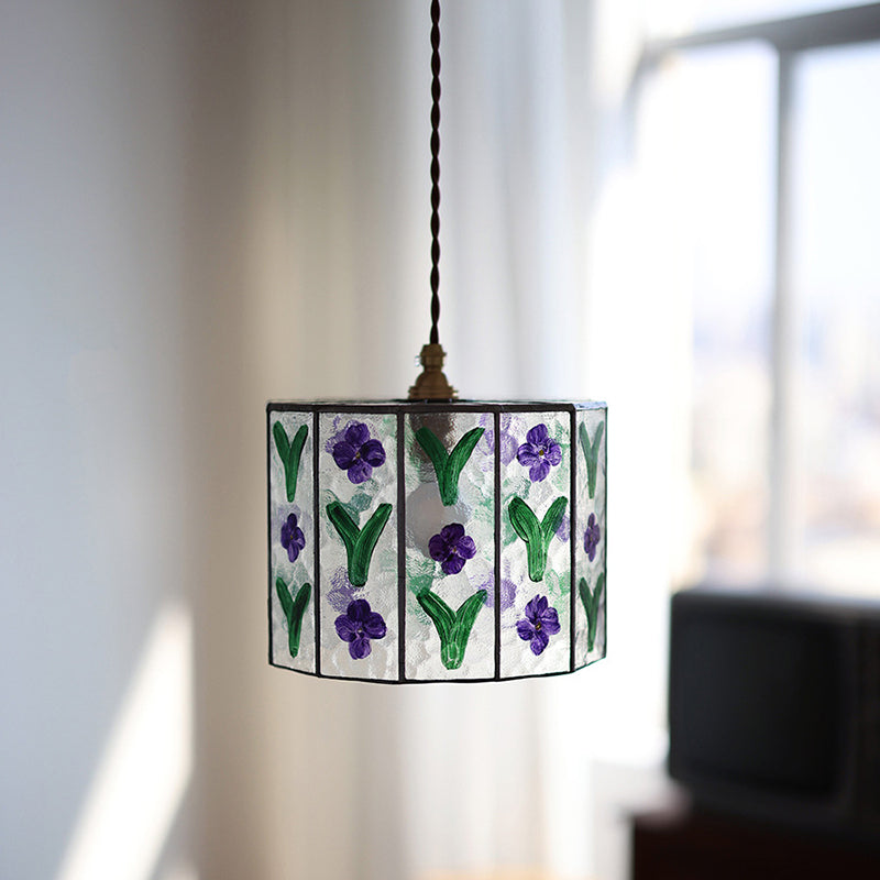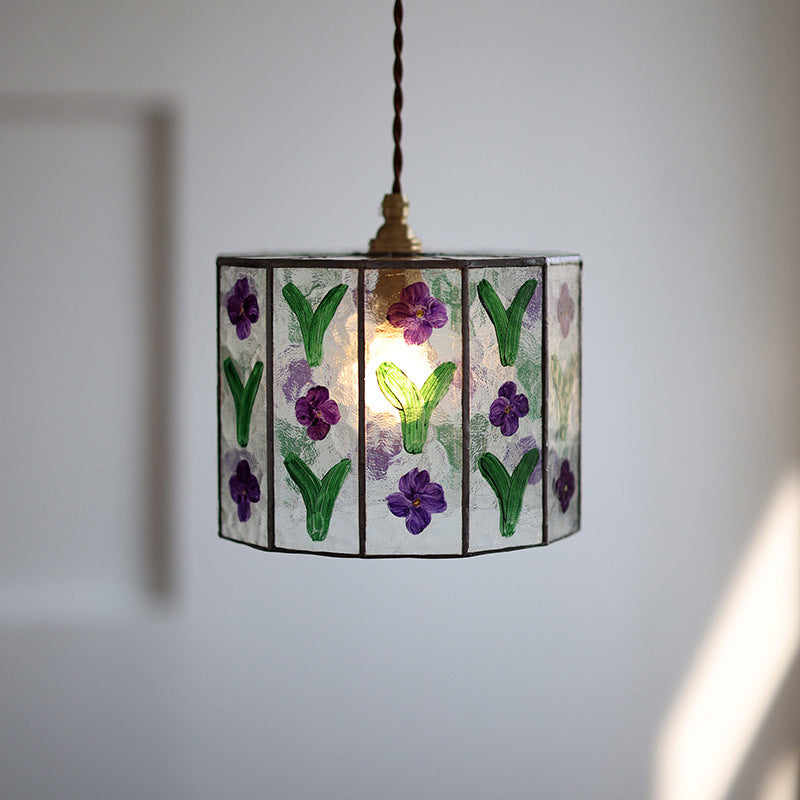 Contemporary Retro Brass Glass Cylinder Hand Painted Flower Leaf 1-Light Pendant Light For Dining Room
