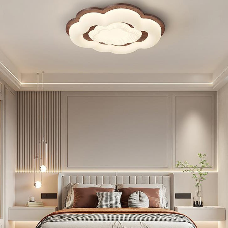 Contemporary Retro Cloud Shape Rubber Wood PE Lampshade LED Flush Mount Ceiling Light For Bedroom