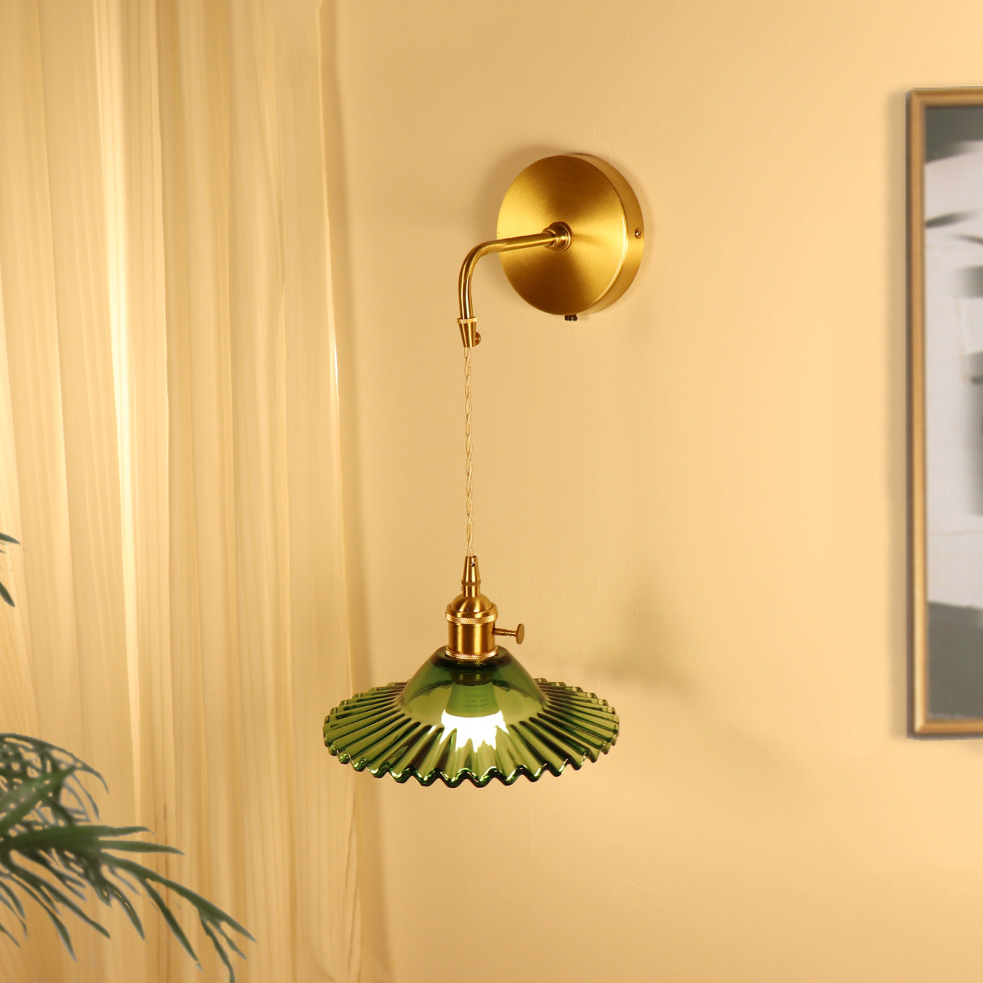 Contemporary Retro Rechargeable Brass Glass Scalloped Skirt 1-Light Wall Sconce Lamp For Bedside