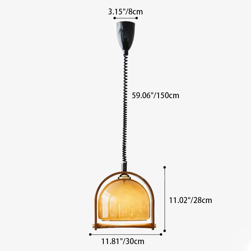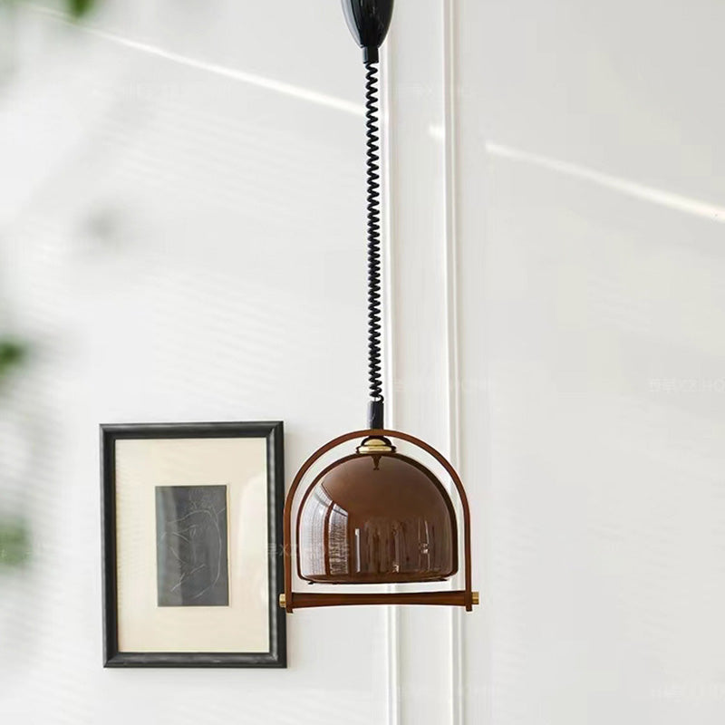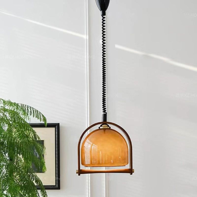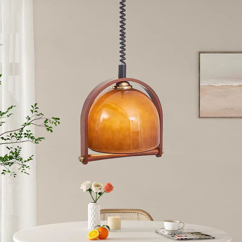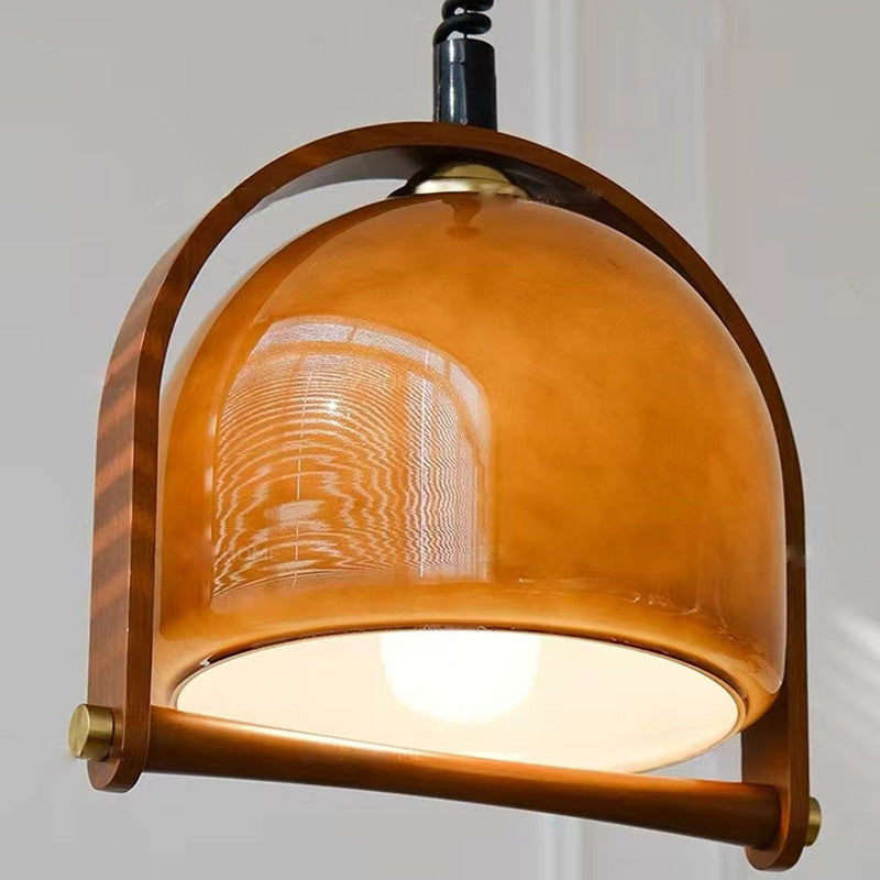 Contemporary Retro Stretchable Round Arch Solid Wood Frame Glass Shade 1-Light Pendant Light For Living Room