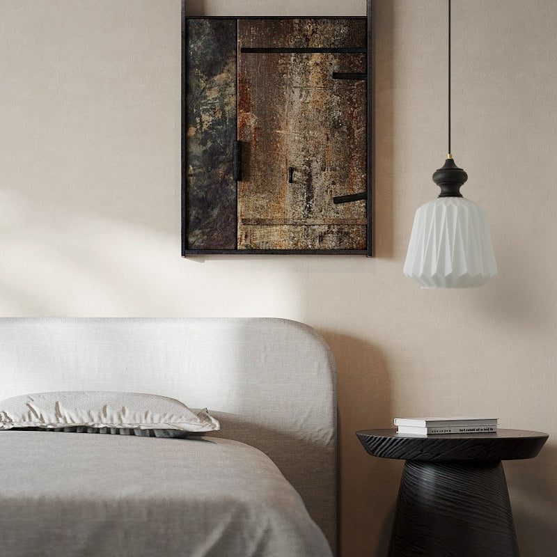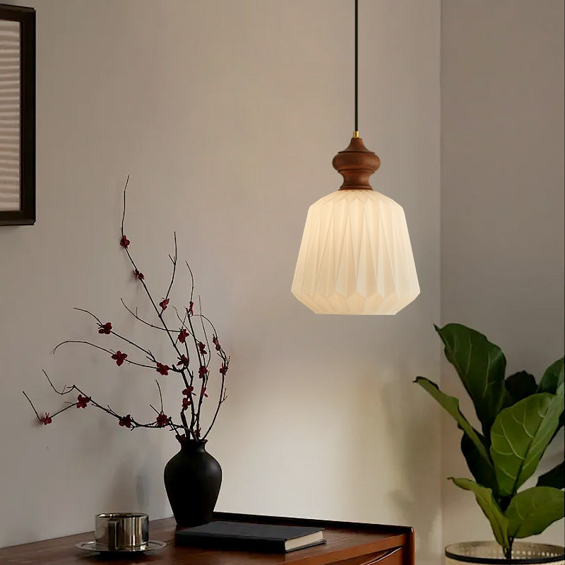 Contemporary Retro Walnut Brass Glass Origami Texture Lantern 1-Light Pendant Light For Dining Room