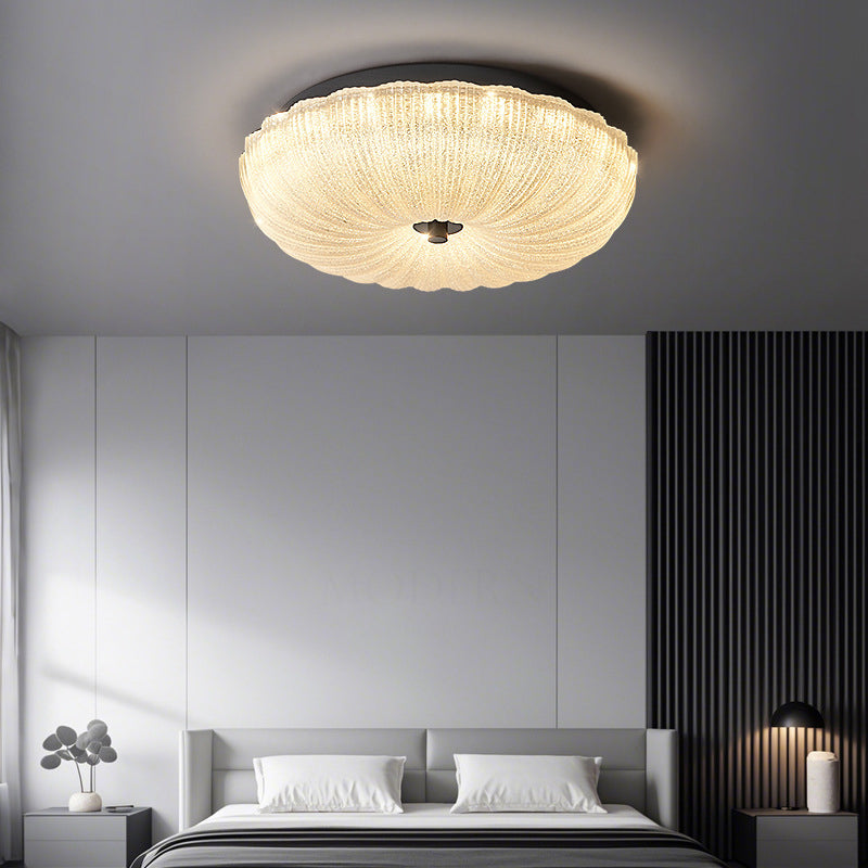 Elevate your bedroom with this textured round LED flush mount light, crafted from brass, stainless steel, and high-transparency acrylic for uniform diffusion. Its sleek gold finish and modern Scandinavian style add a touch of elegance to any space.