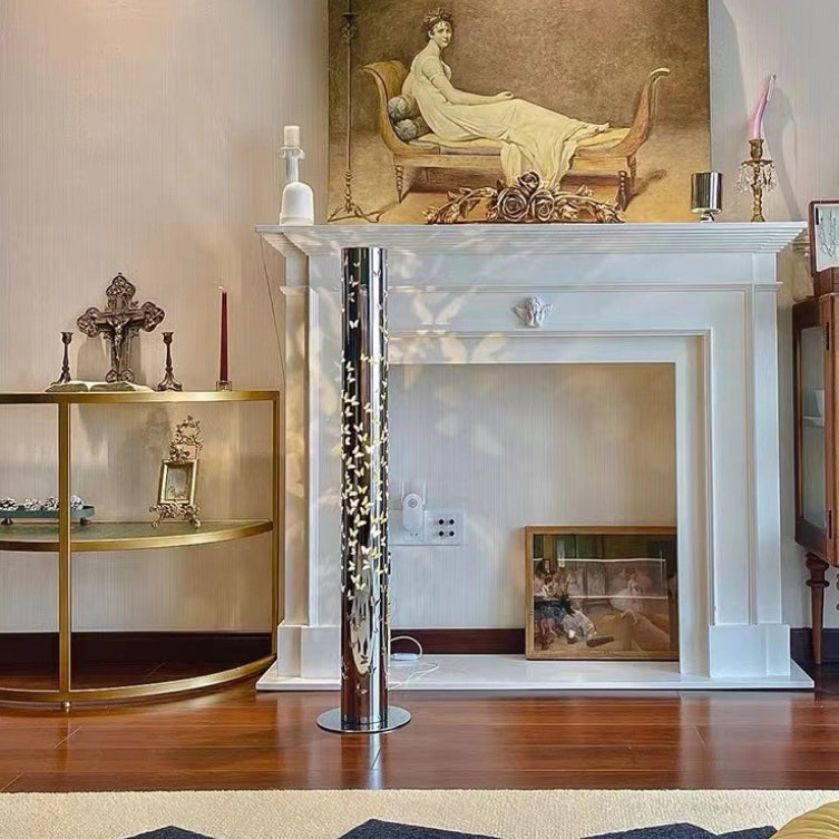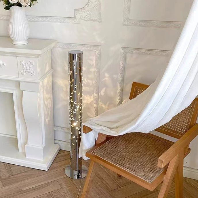 Contemporary Scandinavian Cylinder Disc Base Butterfly Textured Stainless Steel LED Standing Floor Lamp For Living Room