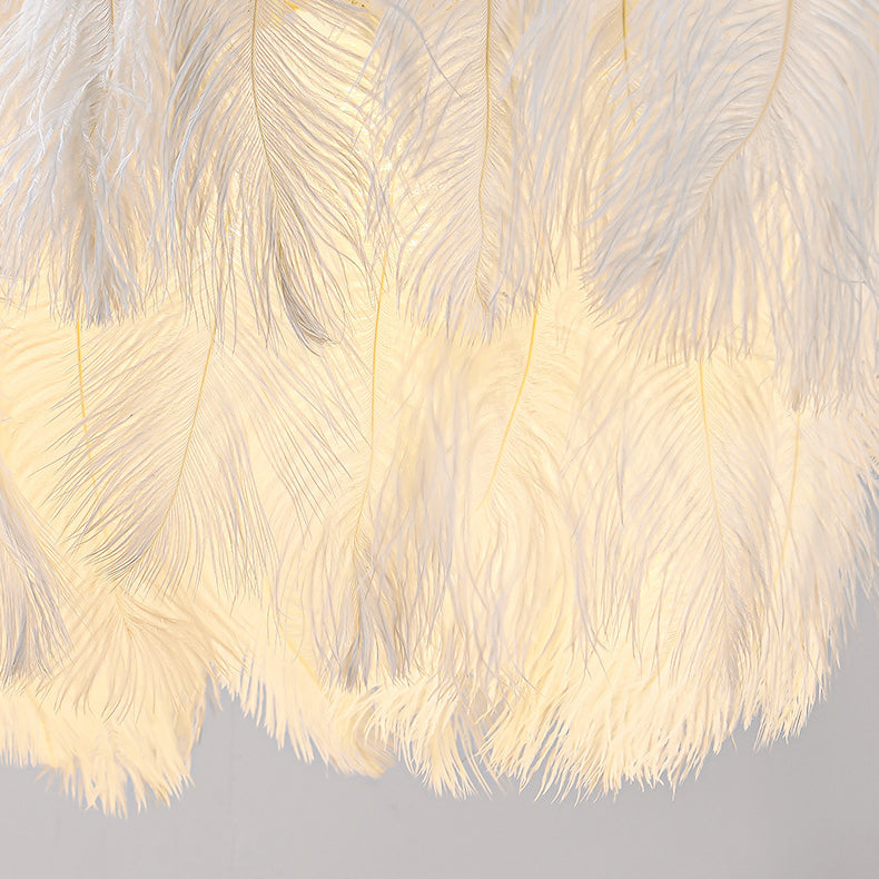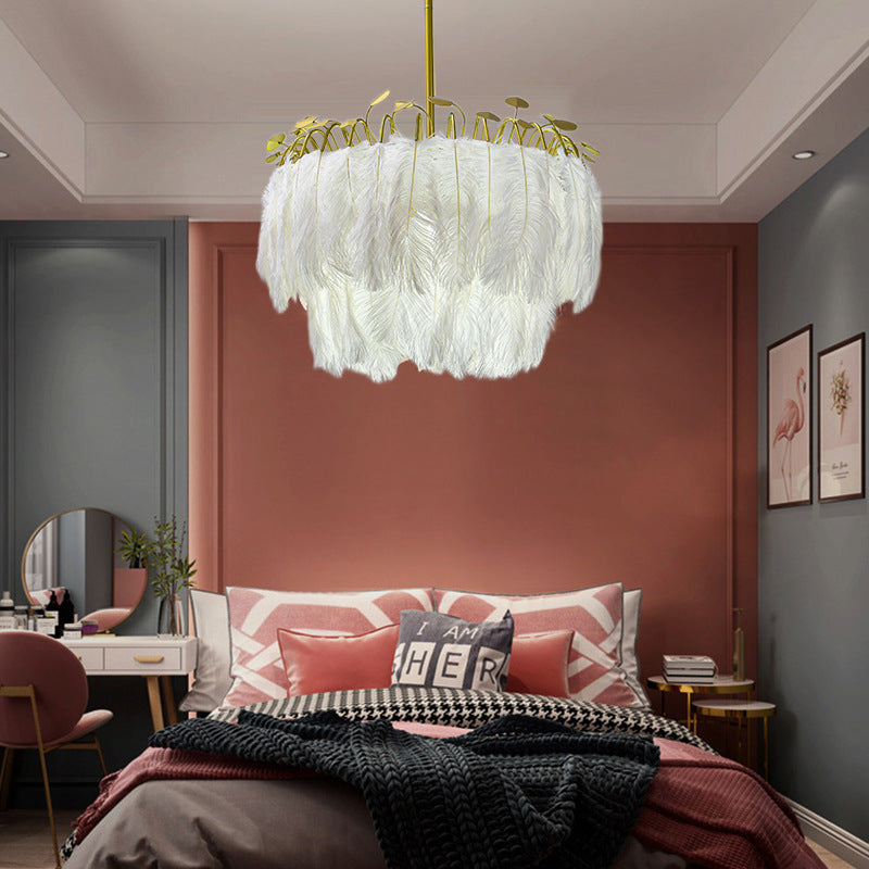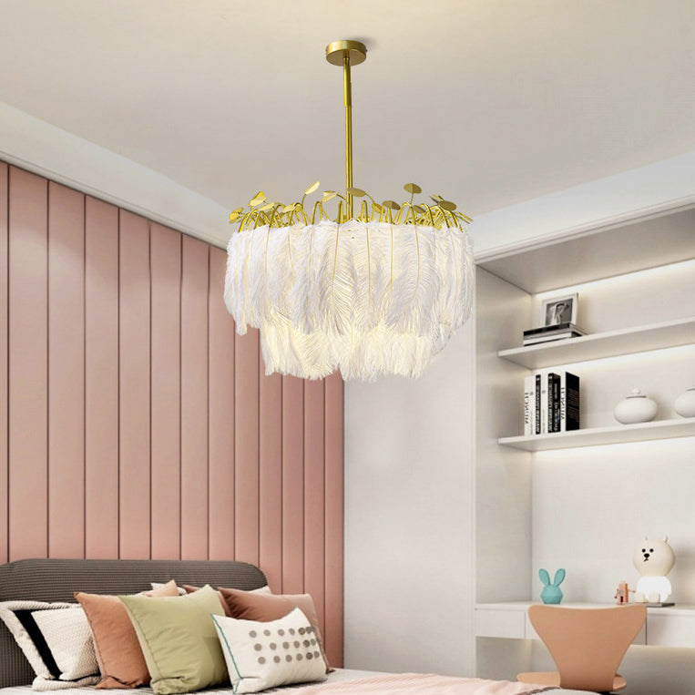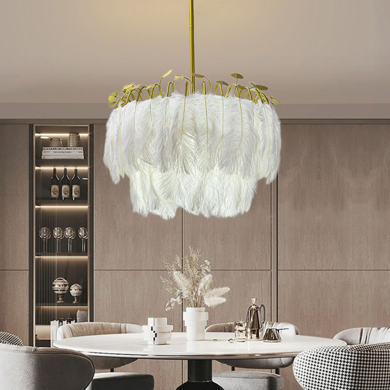 Contemporary Scandinavian Double Round Branch Feather Iron 3-Light Chandelier For Living Room