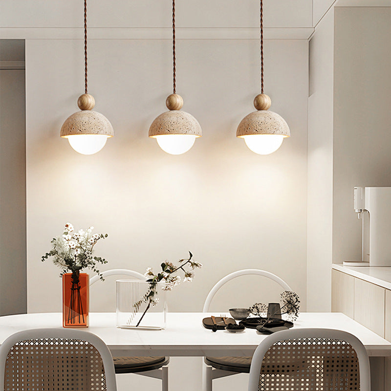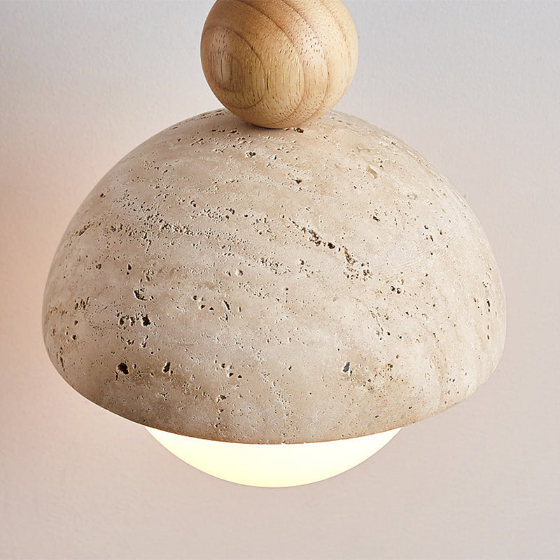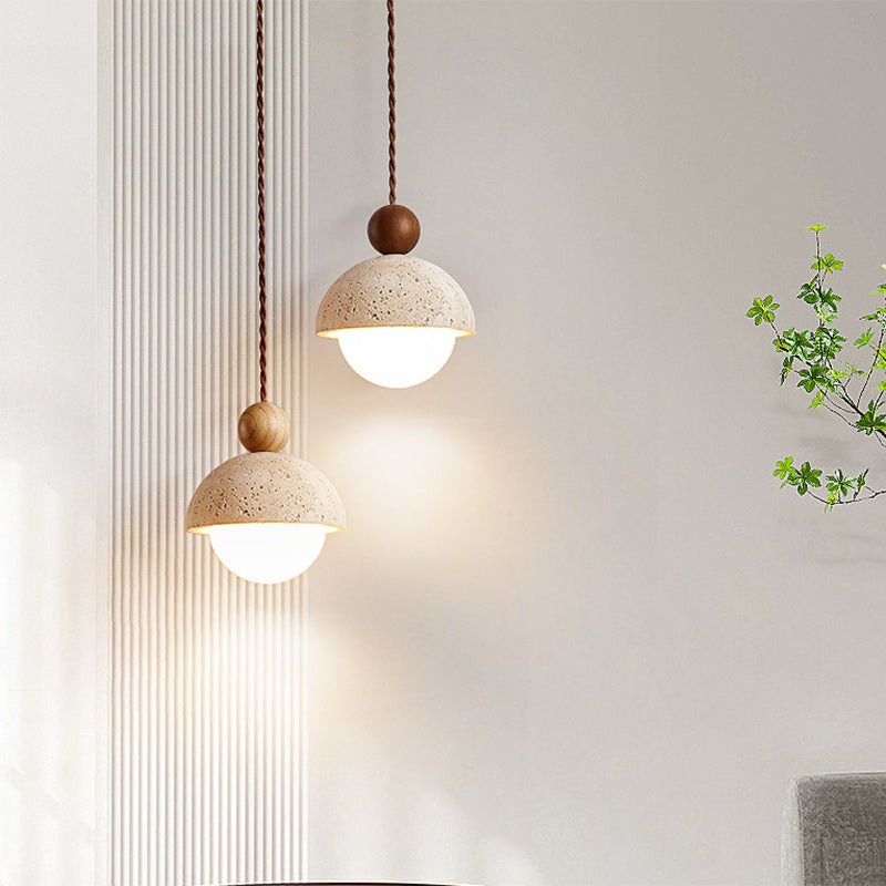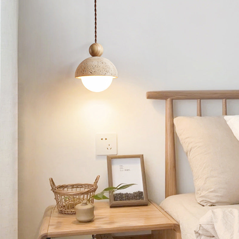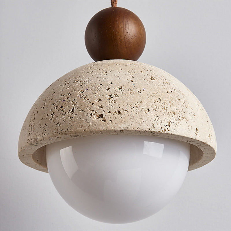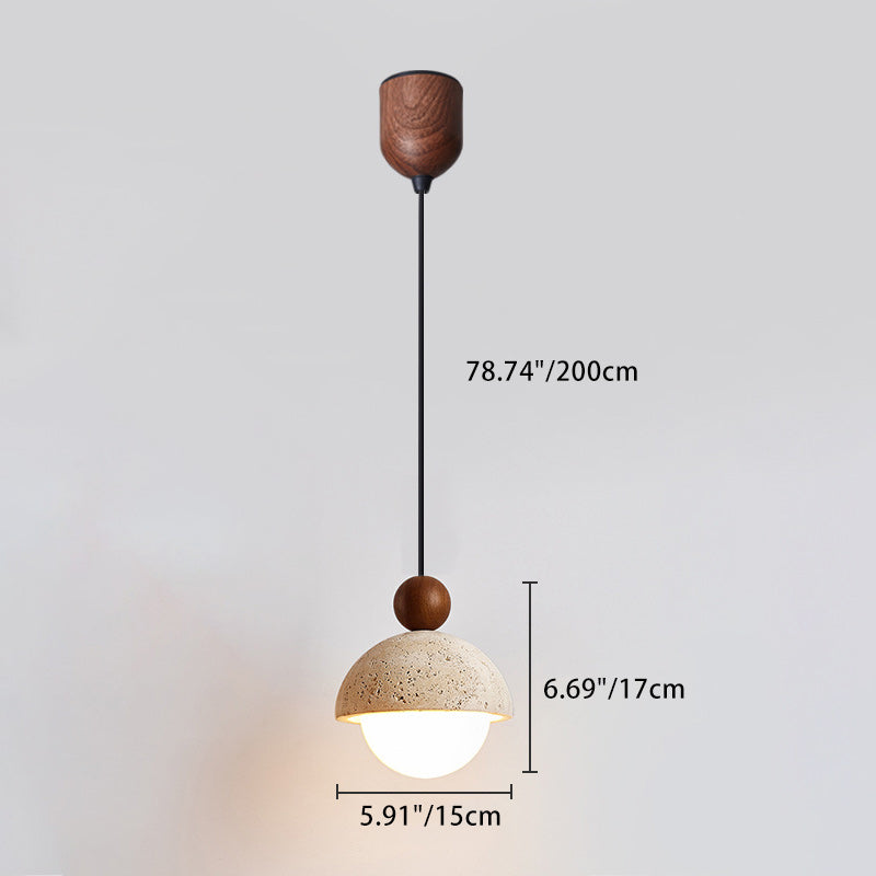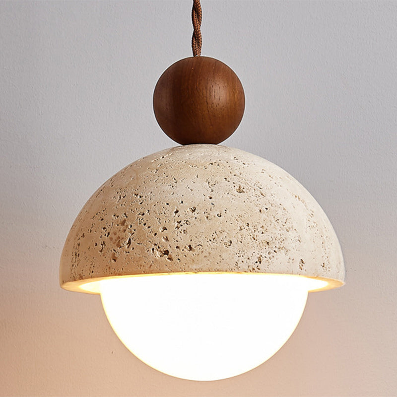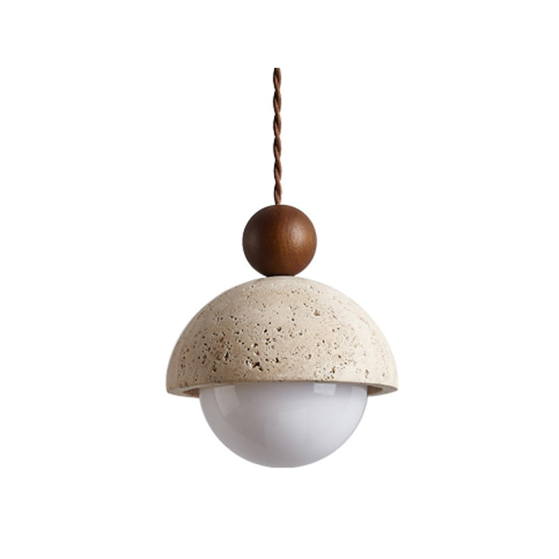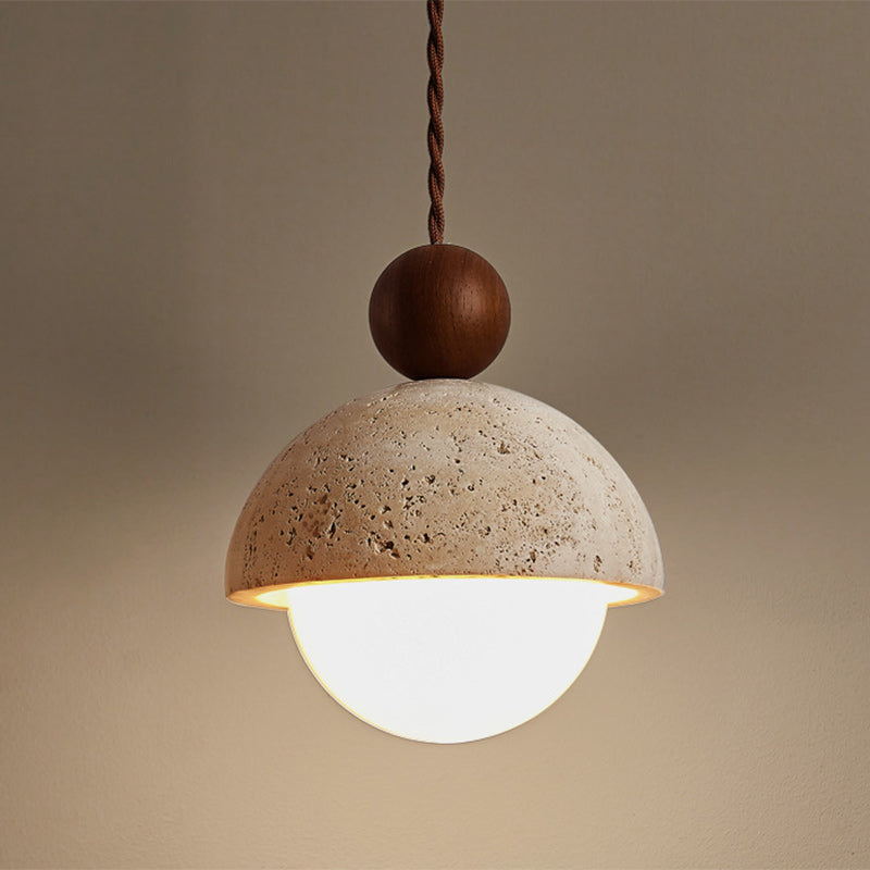 Contemporary Scandinavian Half Round Sphere Wood Travertine Glass 1-Light Pendant Light For Bedroom