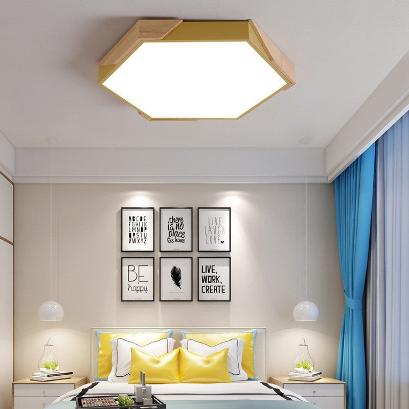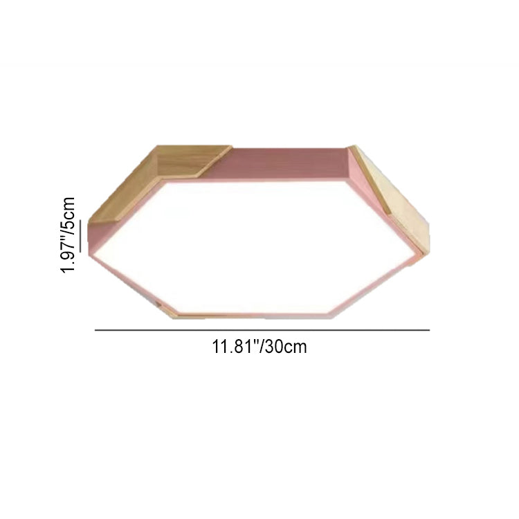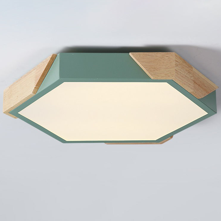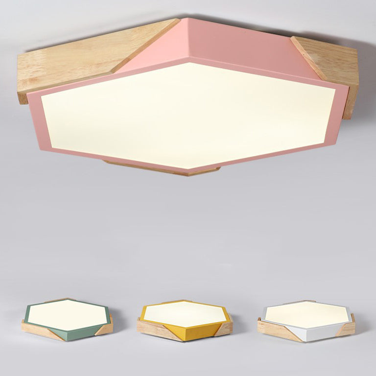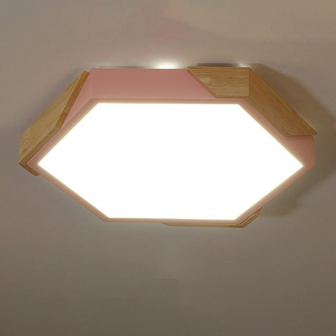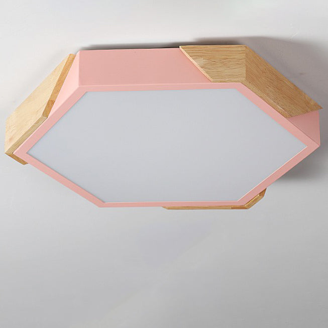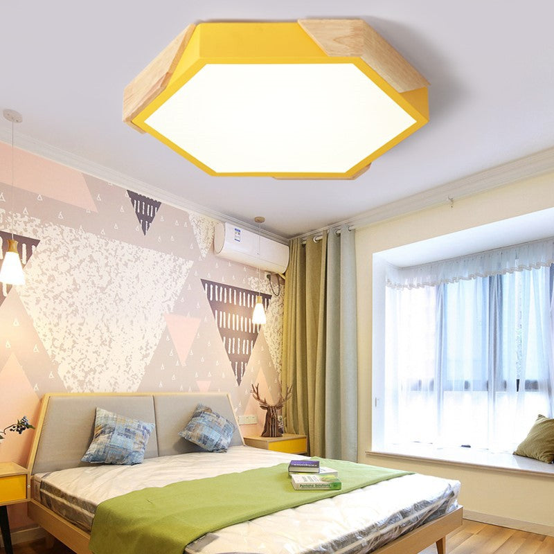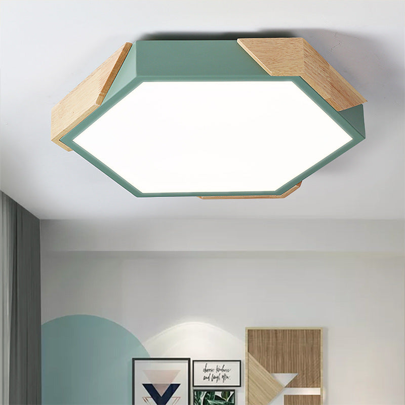 Contemporary Scandinavian Hexagonal Iron Wood Macaron LED Flush Mount Ceiling Light For Bedroom