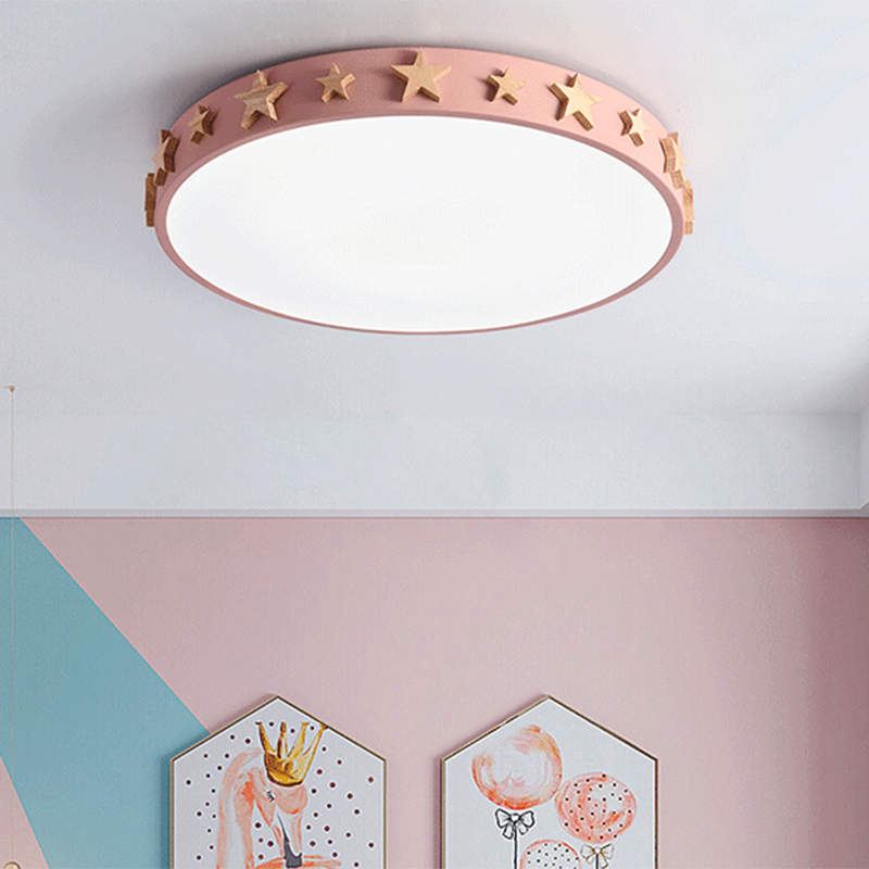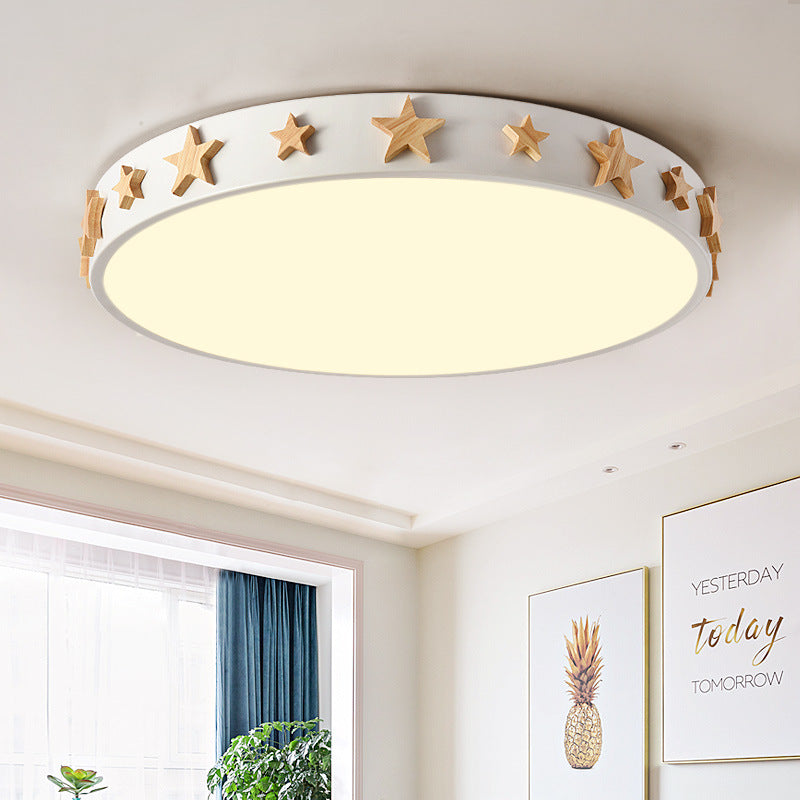 Contemporary Scandinavian Iron Wood Acrylic Round Star LED Flush Mount Ceiling Light For Bedroom