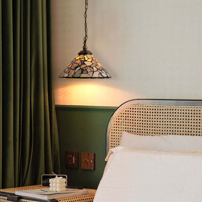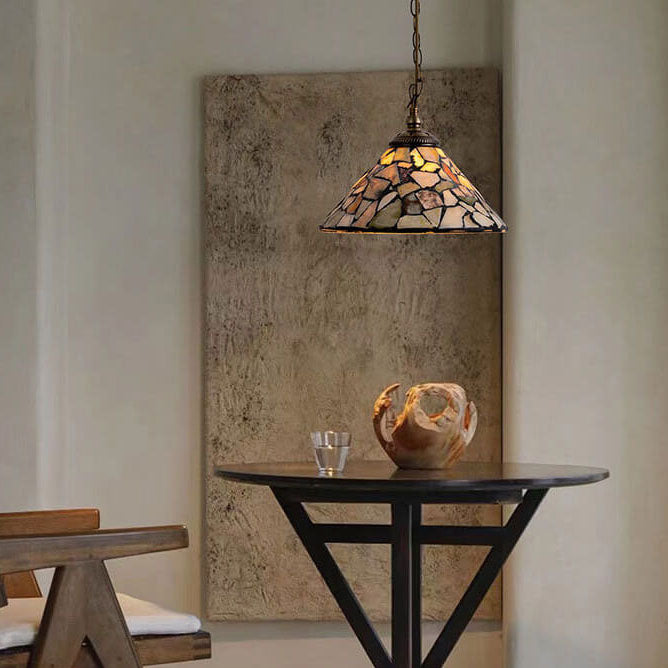 European Vintage Jade Stained Glass Cone Brass 1-Light Pendant Light