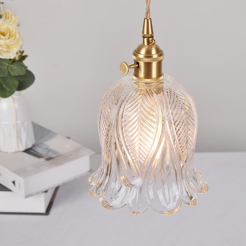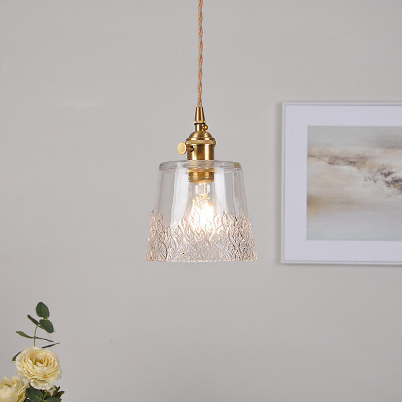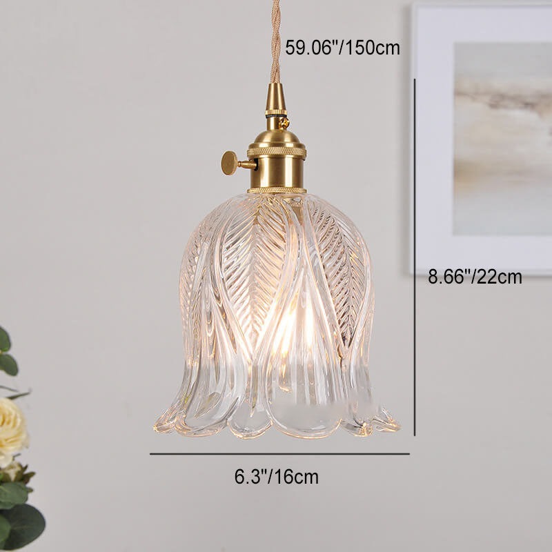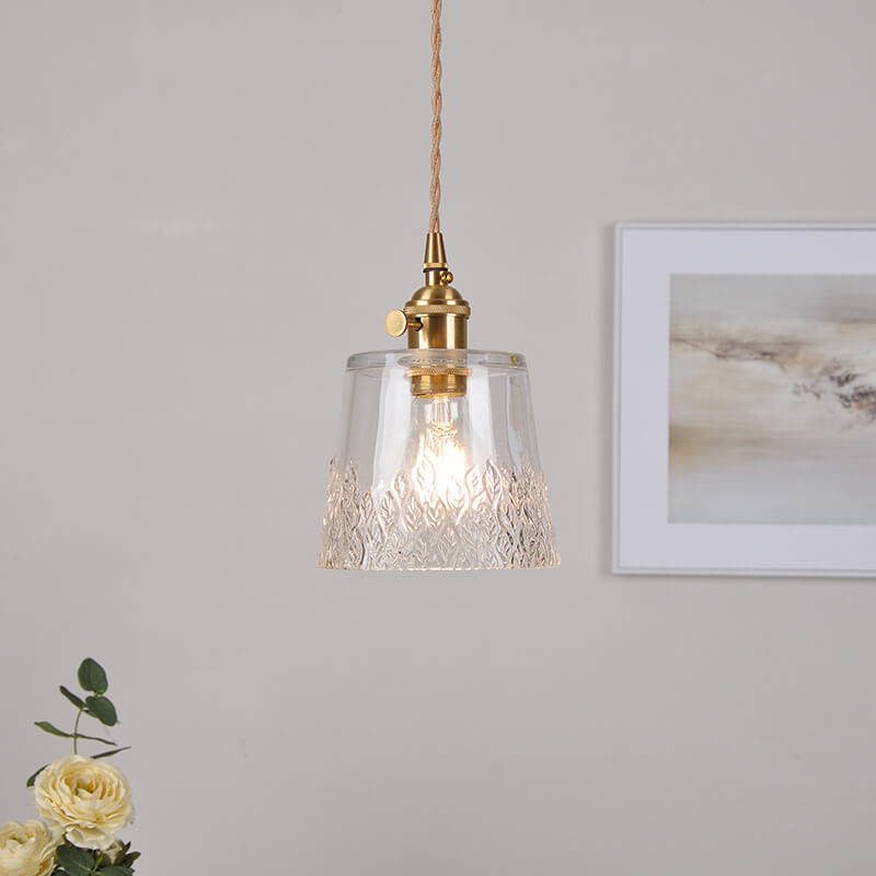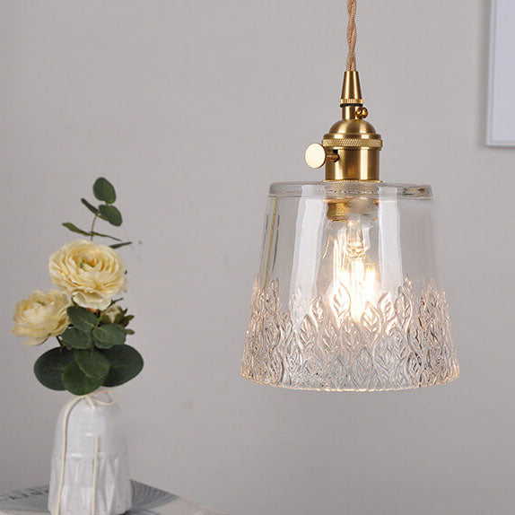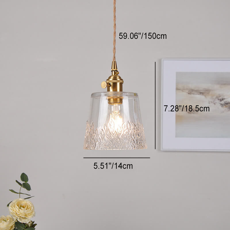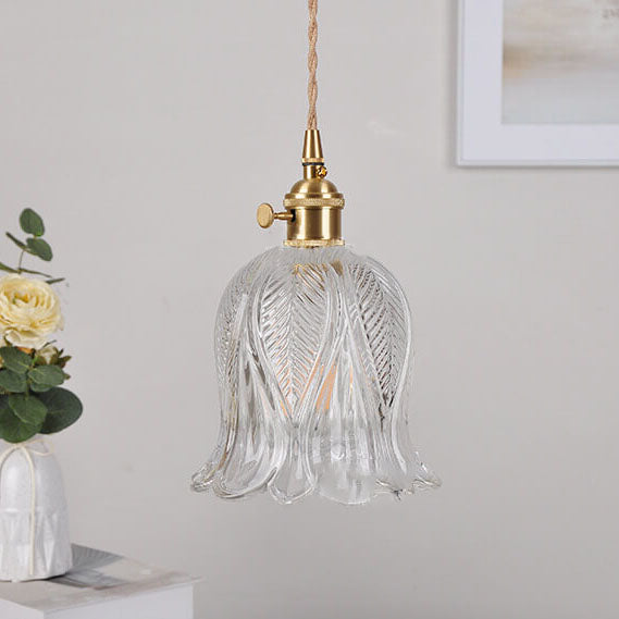 Japanese Vintage Floral Glass Cone Brass 1-Light Pendant Light
