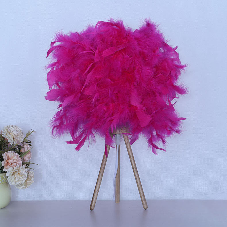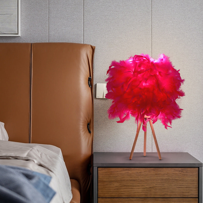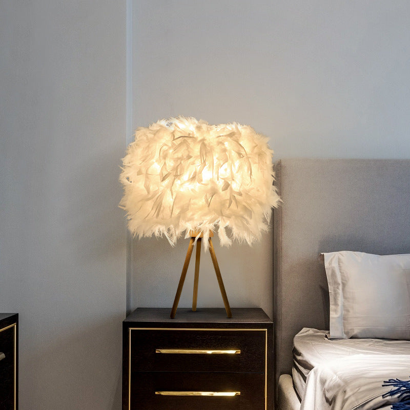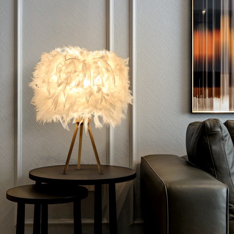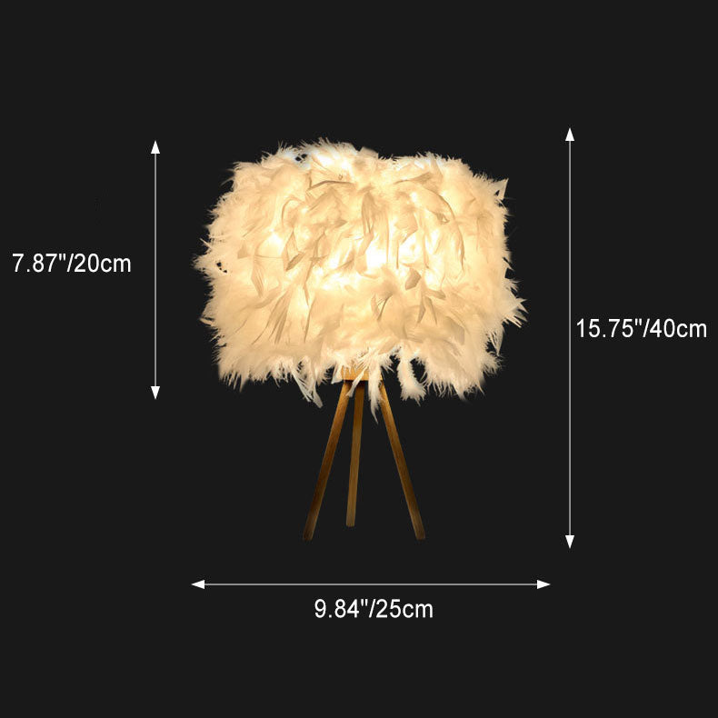Modern Art Deco Feather Wood Cylinder Triangle Base 1-Light Table Lamp For Bedside