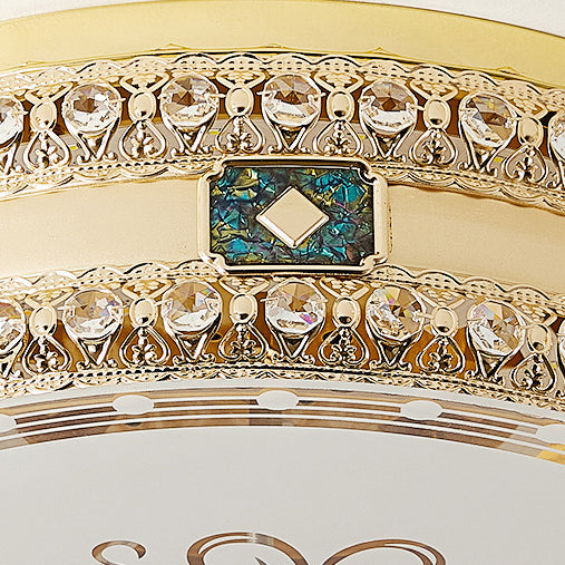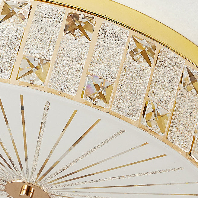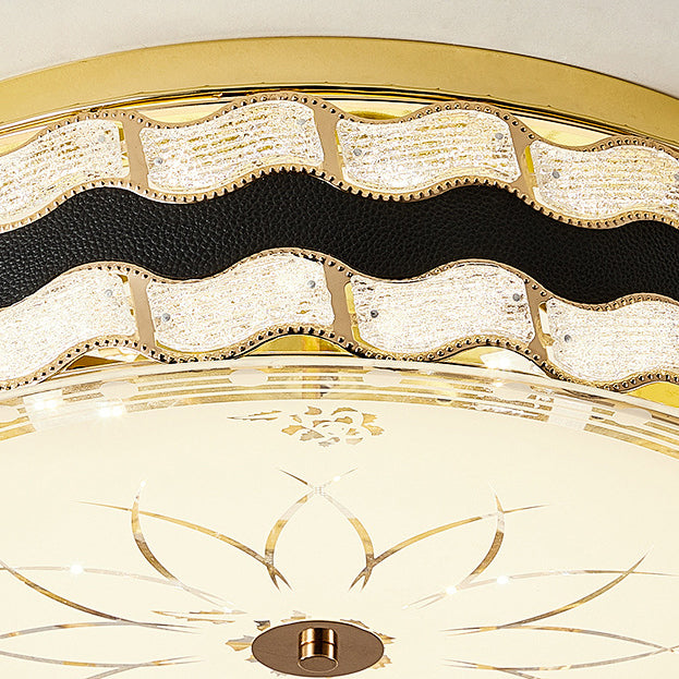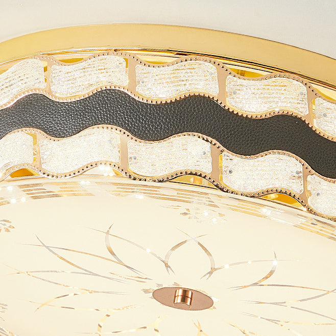 Modern Luxury Round Crystal Square Beads Flower Wave Pattern Hardware Leather Shell Glass LED Flush Mount Ceiling Light For Bedroom