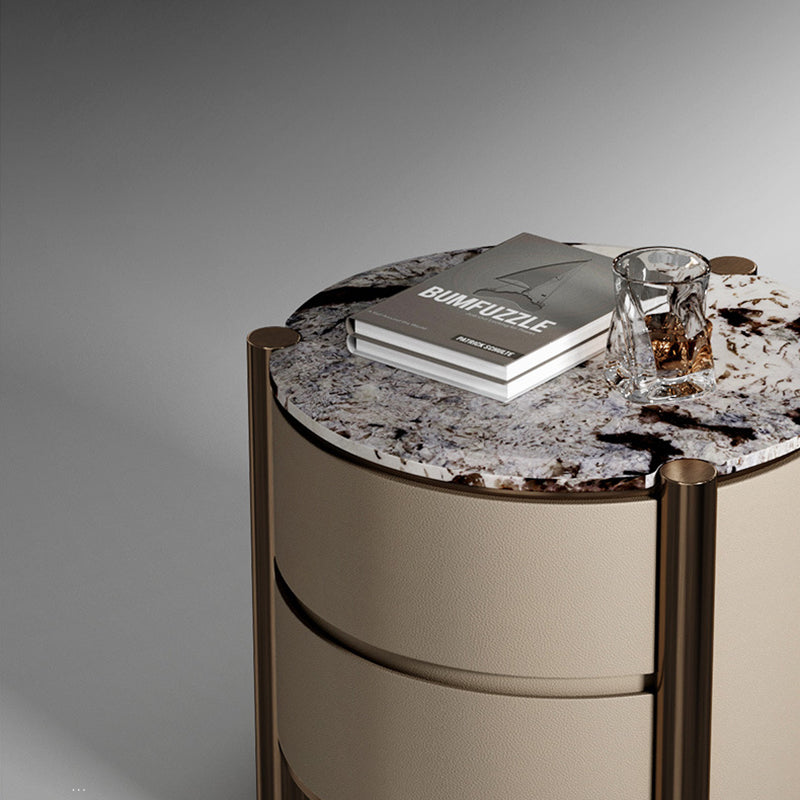 Modern Luxury Round Tabletop Marble Solid Wood Stainless Steel Microfiber Leather Nightstand 2-Drawer For Bedroom