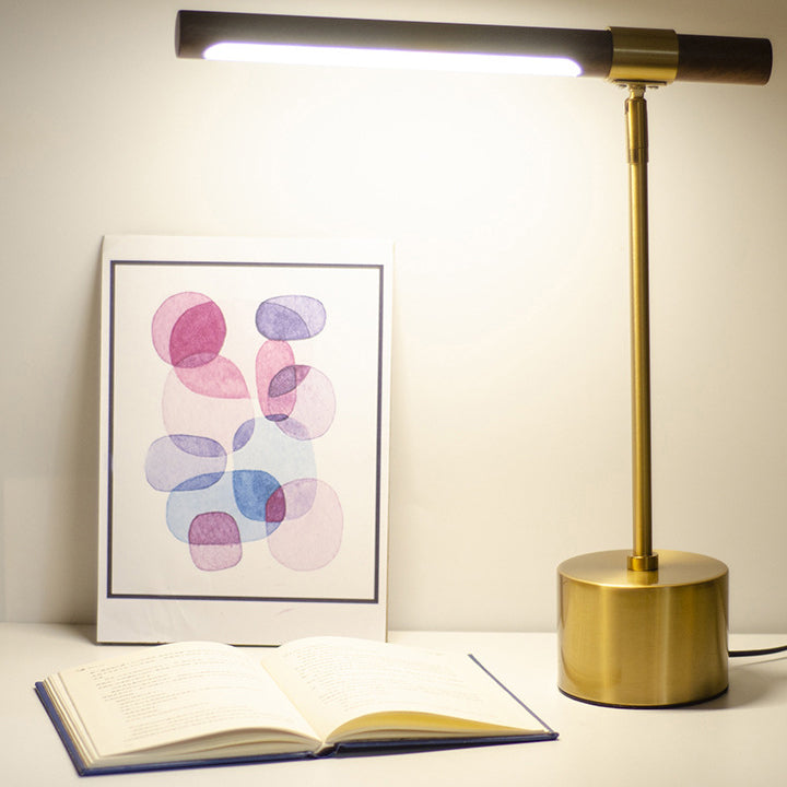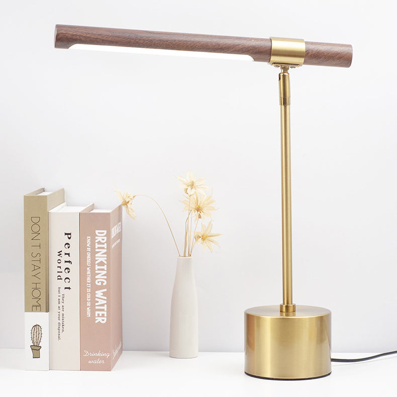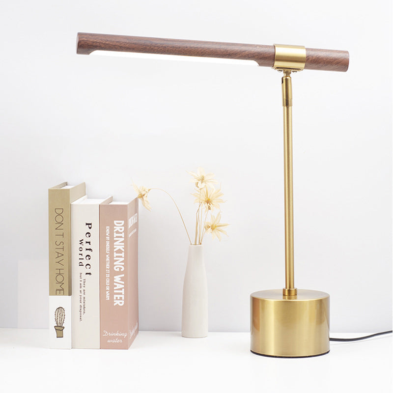 Add a refined touch to your bedroom with this modern minimalist LED table lamp featuring a golden iron body and realistic wood grain texture. The cylindrical shape and adjustable rotation make it both stylish and functional for bedside or office use.