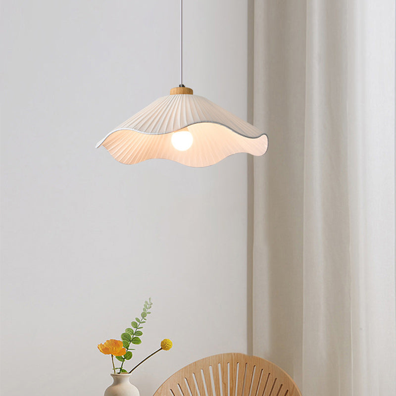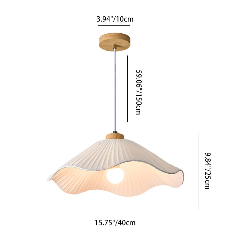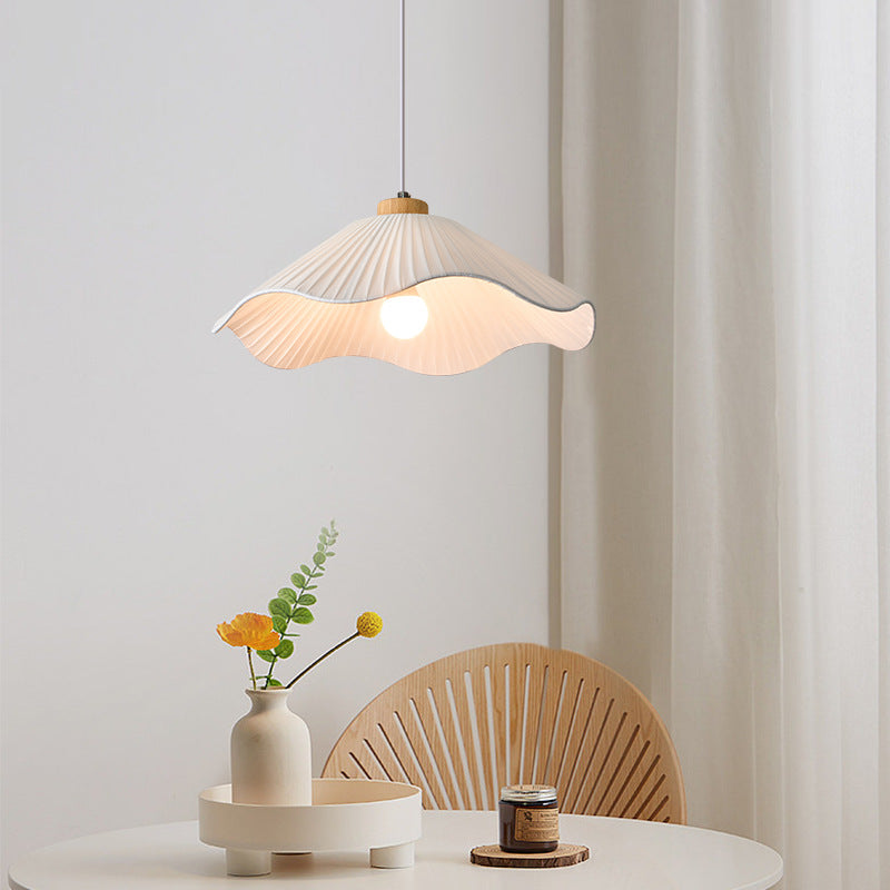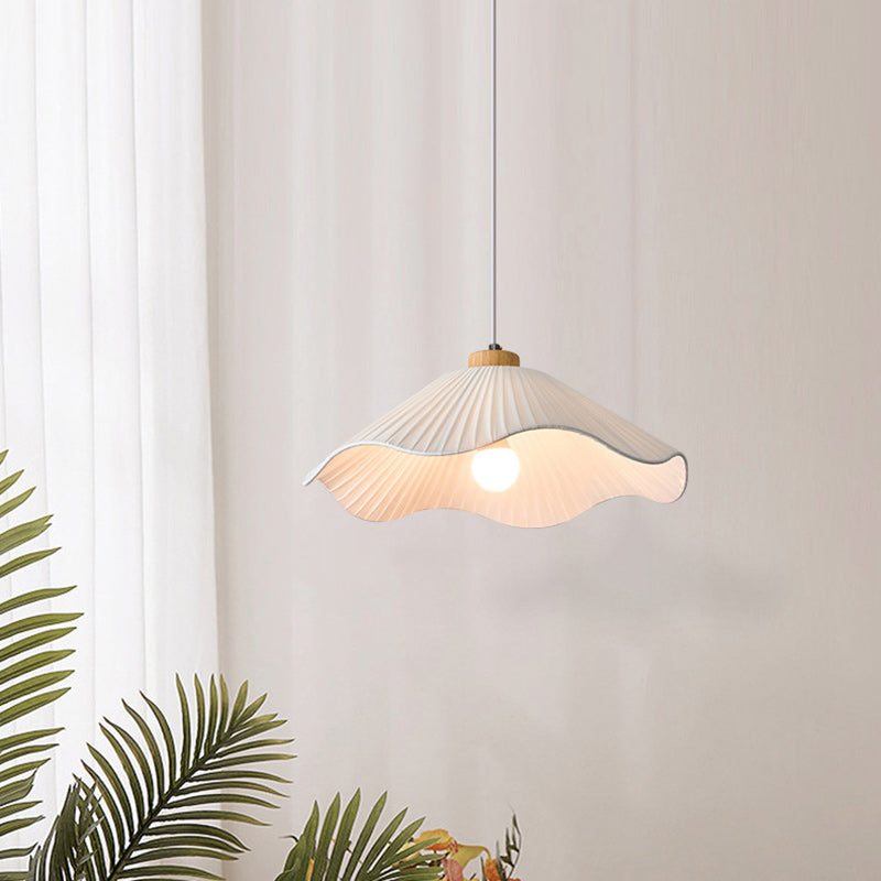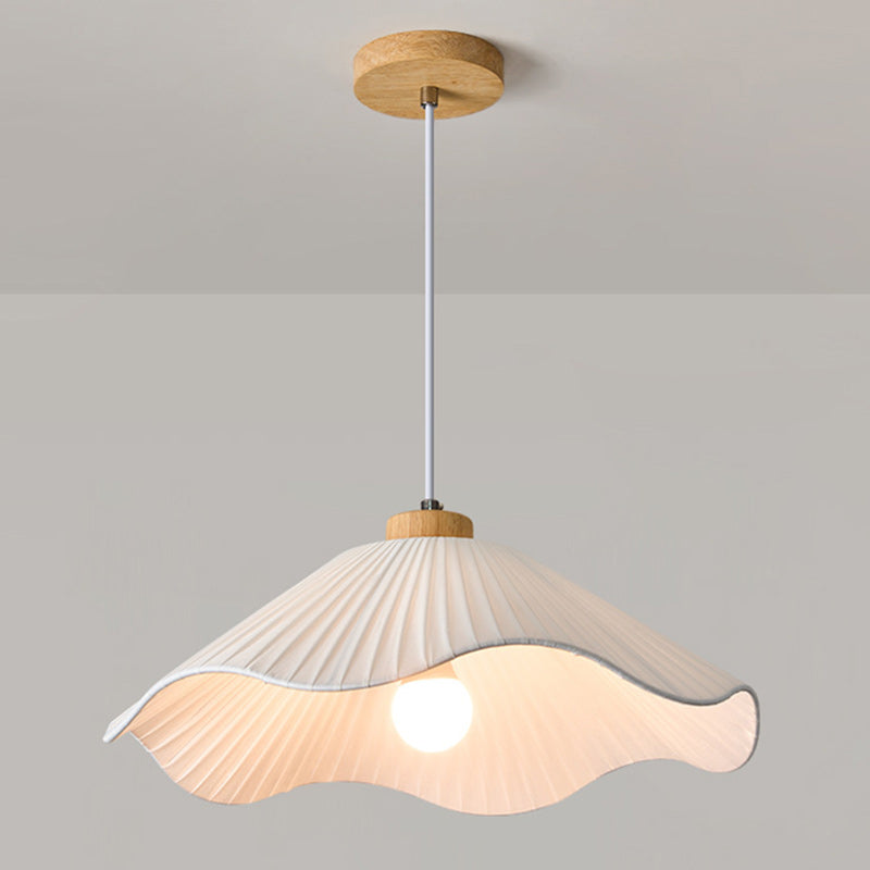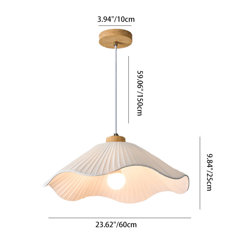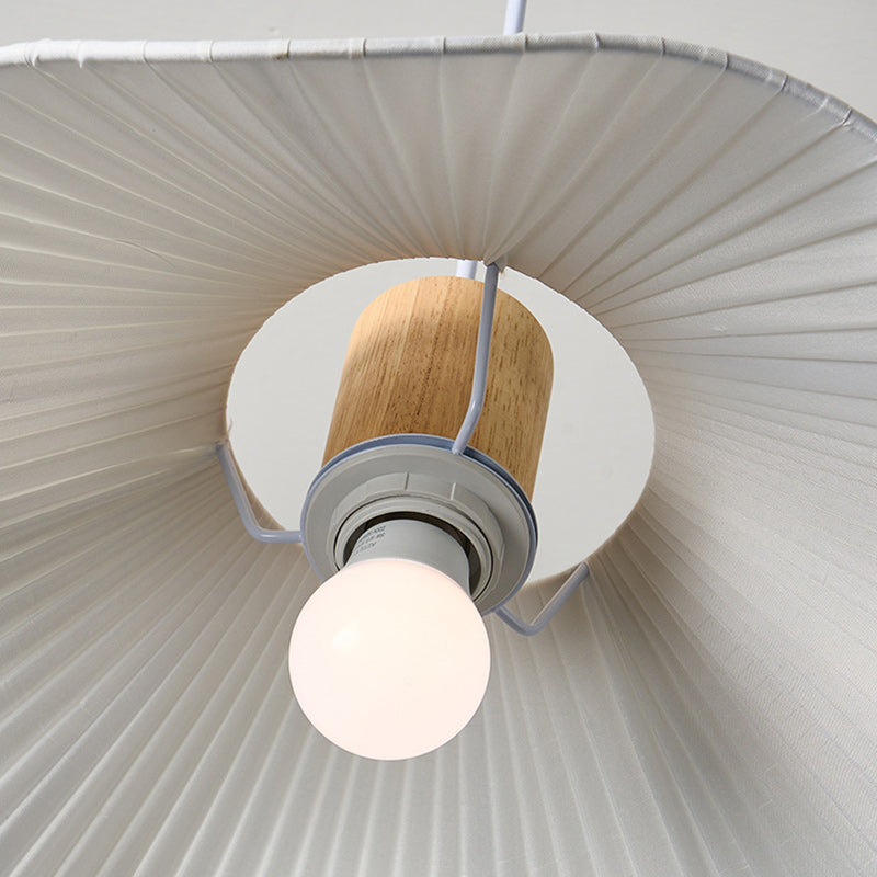 This white 1-light pendant features a graceful curved cone shape with a soft fabric shade, natural wood accents, and sturdy iron base—perfect for bedrooms, hallways, or living rooms. Its clean modern minimalist design brings warmth and charm to any space.
