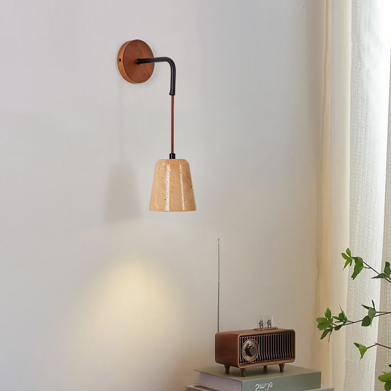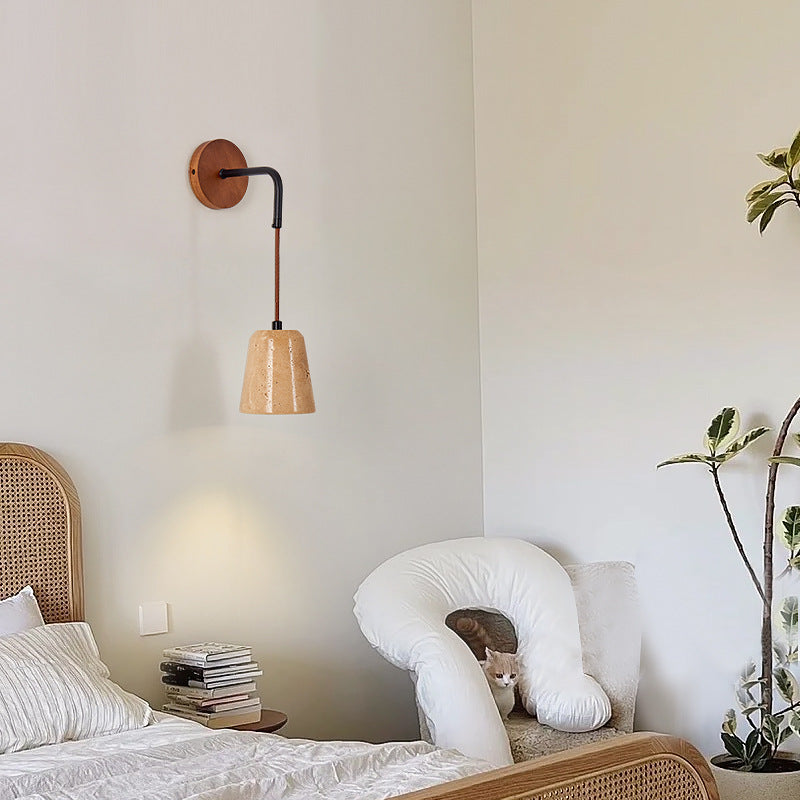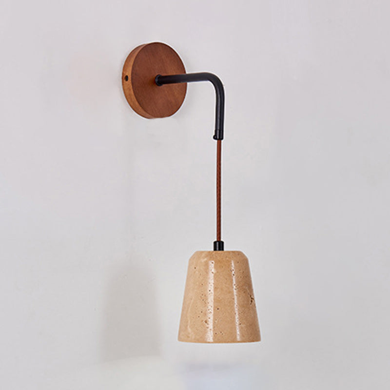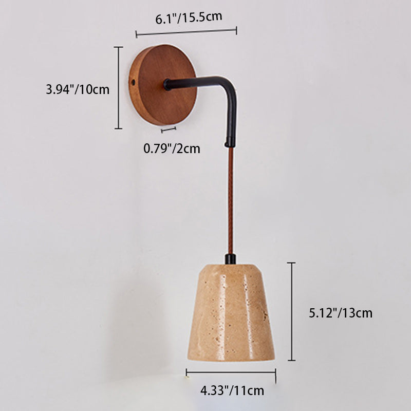 Modern Minimalist Round Table Disc Base Yellow Travertine Wood Iron 1-Light Wall Sconce Lamp For Bedroom