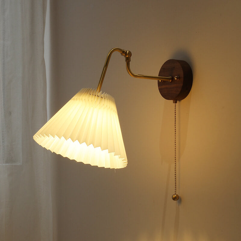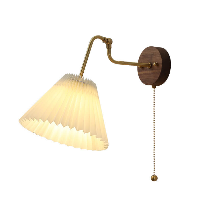 Nordic Vintage Walnut Brass Pleated Shade 1-Light Wall Sconce Lamp