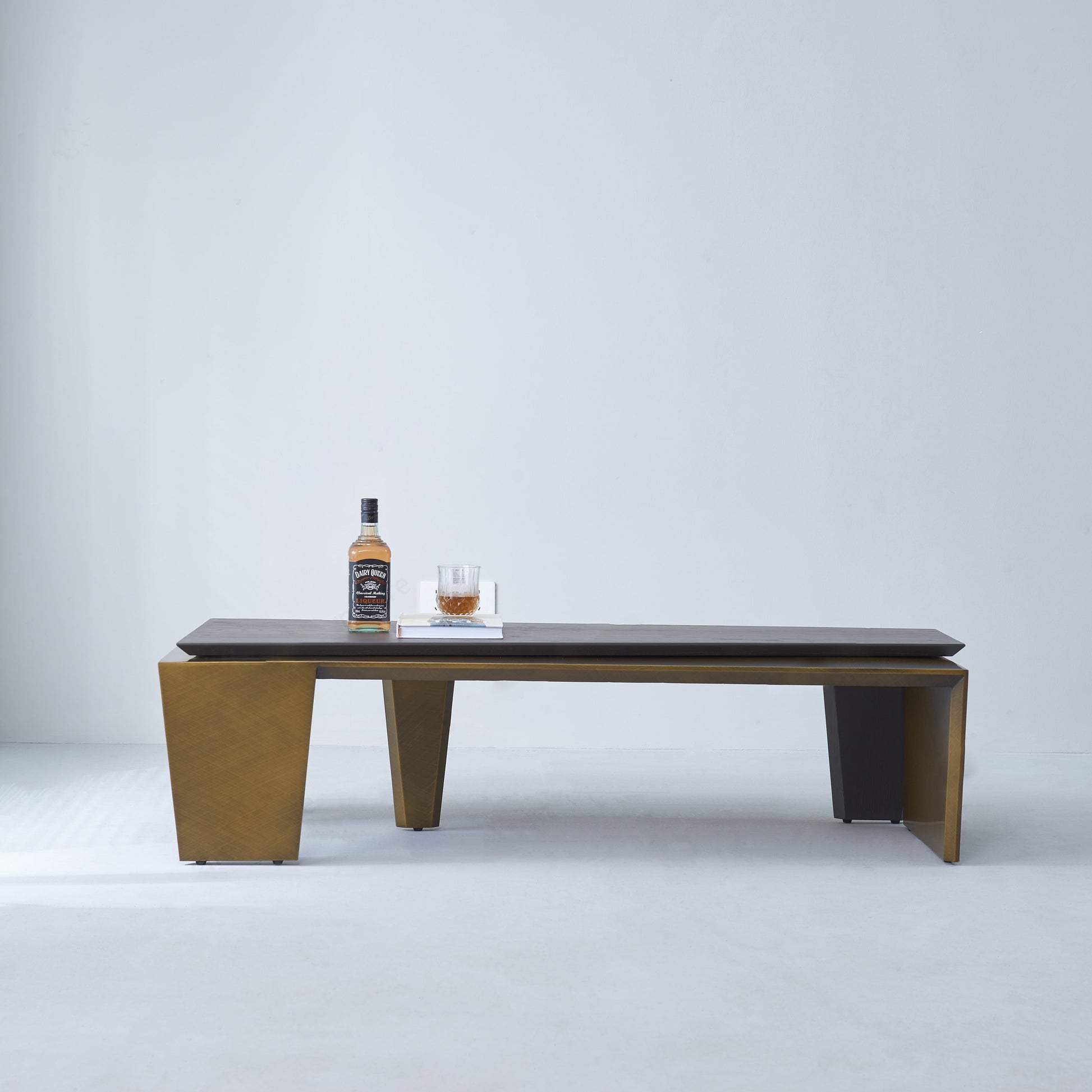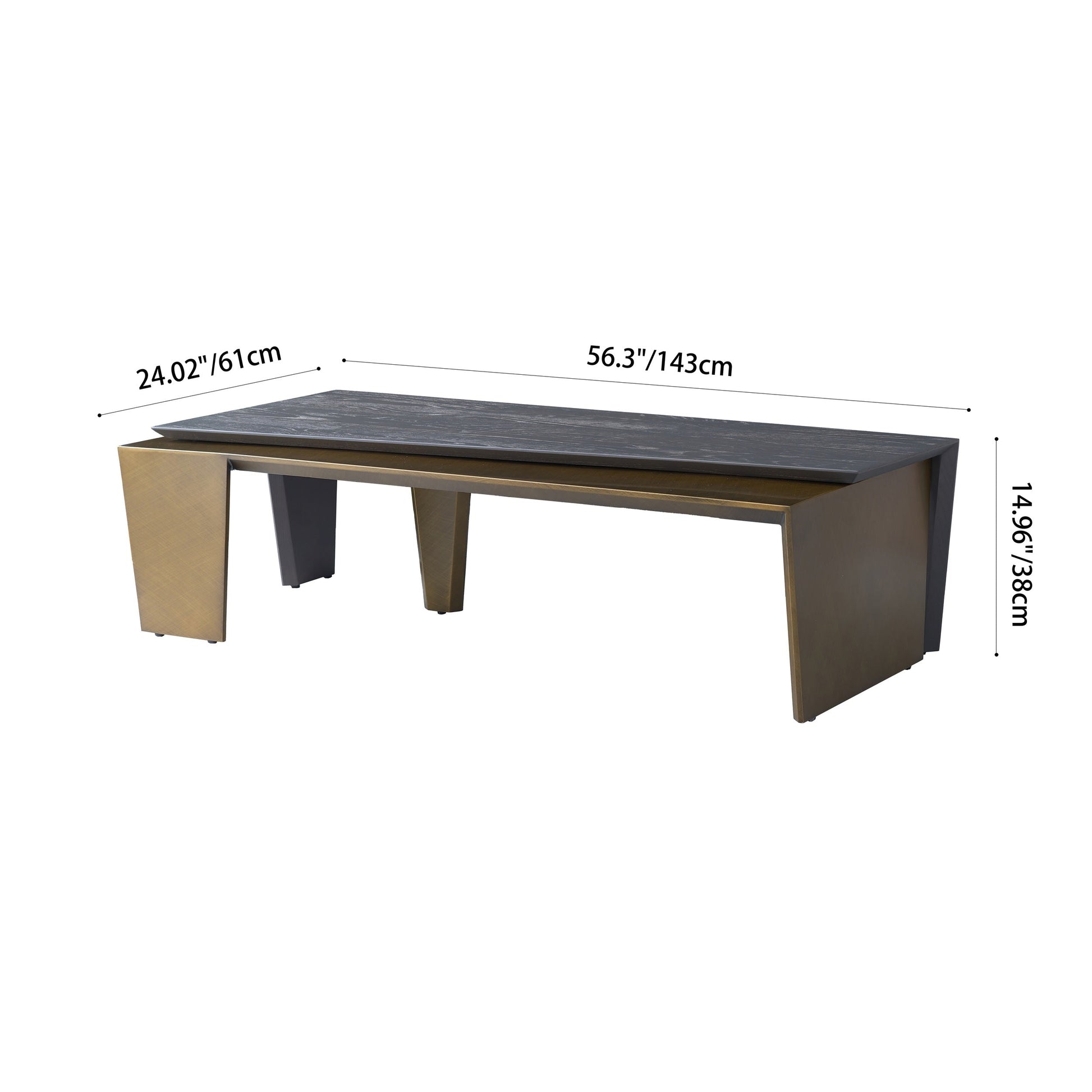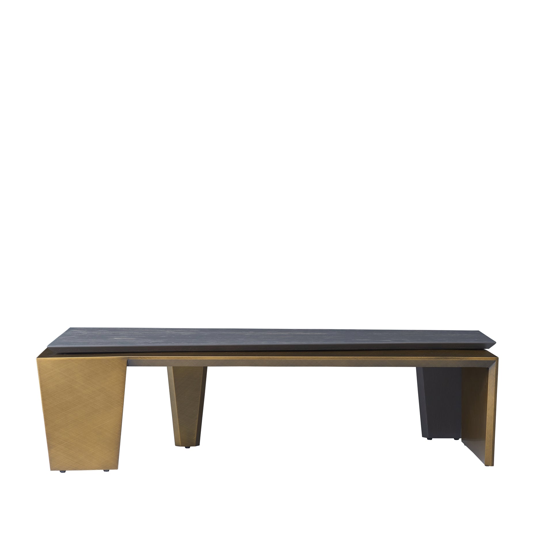 The side panels connect to the top in a folded, wraparound structure, enhancing visual cohesion and structural stability. This unique design fuses the warmth of wood with the cool elegance of metal, creating a balanced piece that works beautifully in modern, industrial, and luxe living spaces.