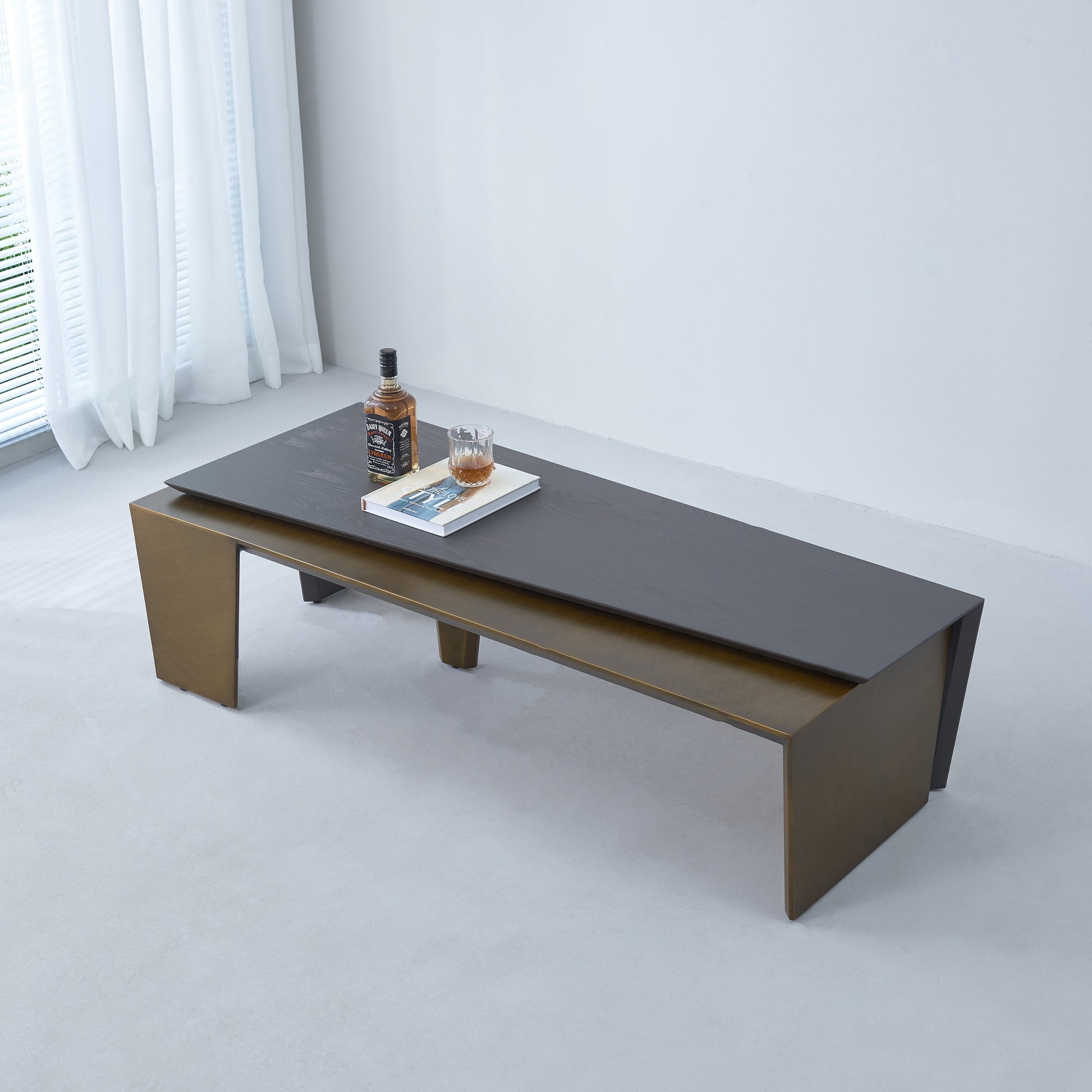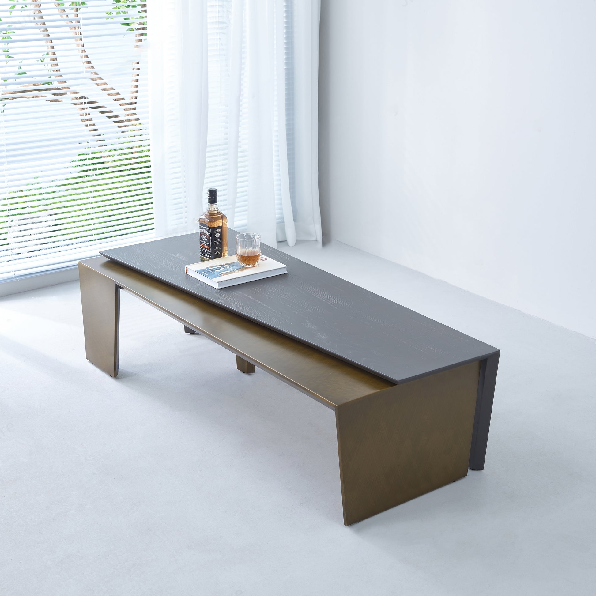 This modern coffee table combines clean, architectural lines with a sophisticated material mix, making it a striking focal point for contemporary interiors. Its elongated rectangular form and sharp-edged silhouette deliver a crisp, minimalist presence, perfect for pairing with a range of décor styles.