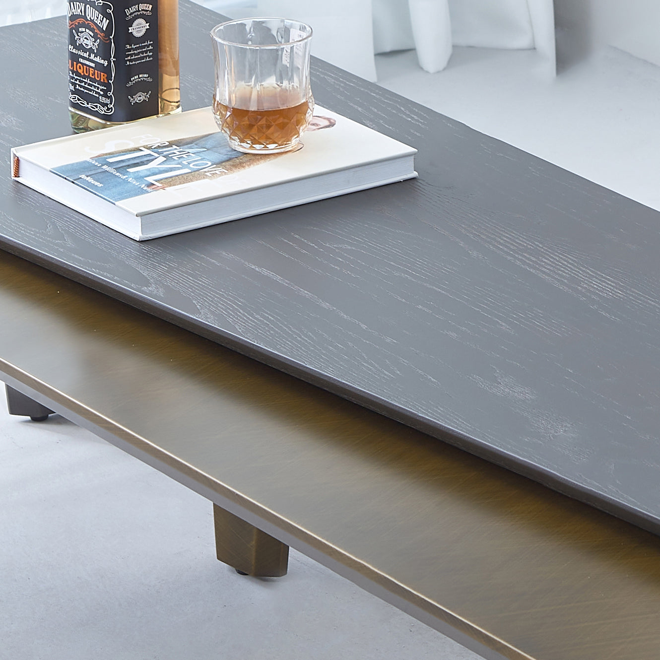 Premium Finish: Natural wood grain surface with a rich, smooth texture; antique brass panels with soft metallic sheen.