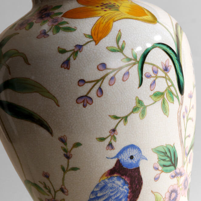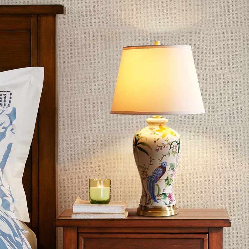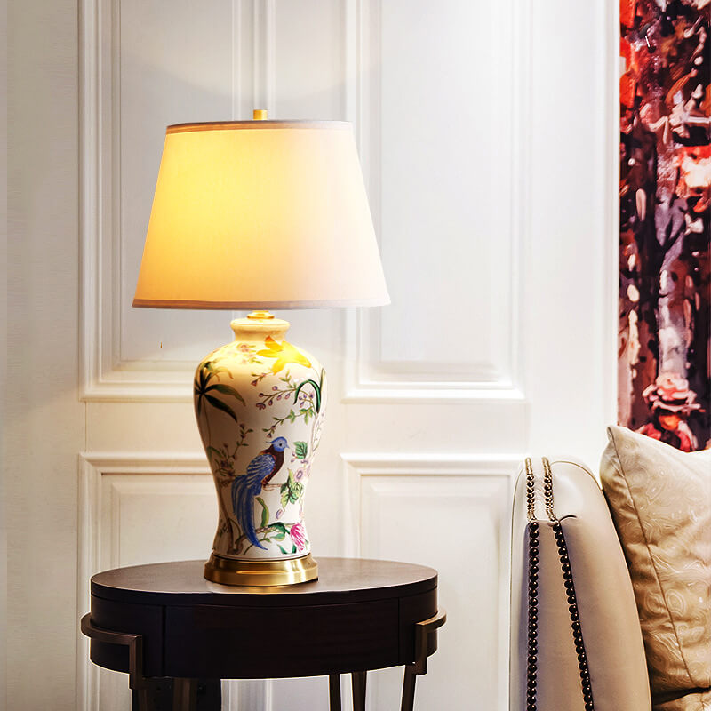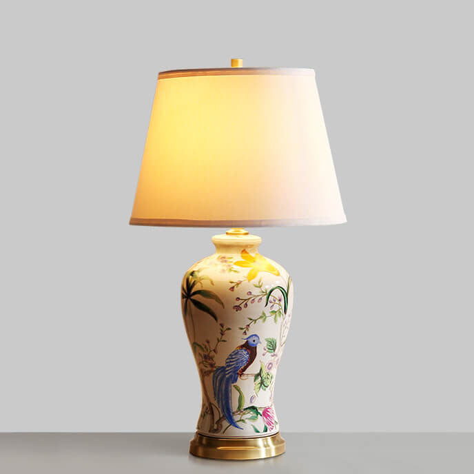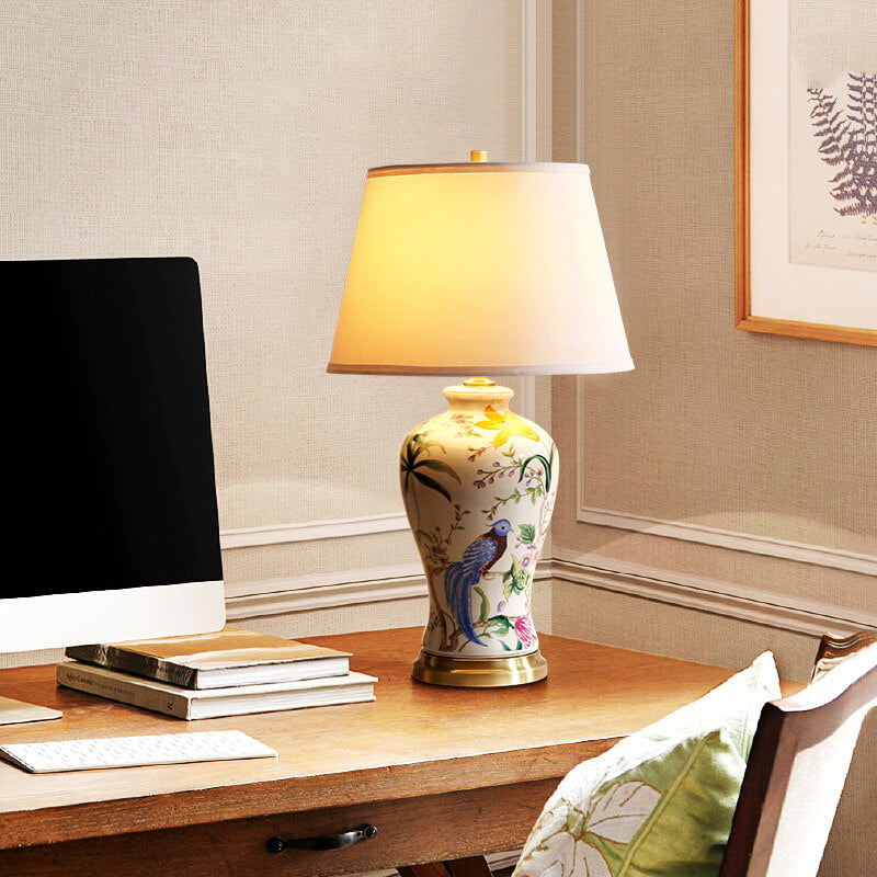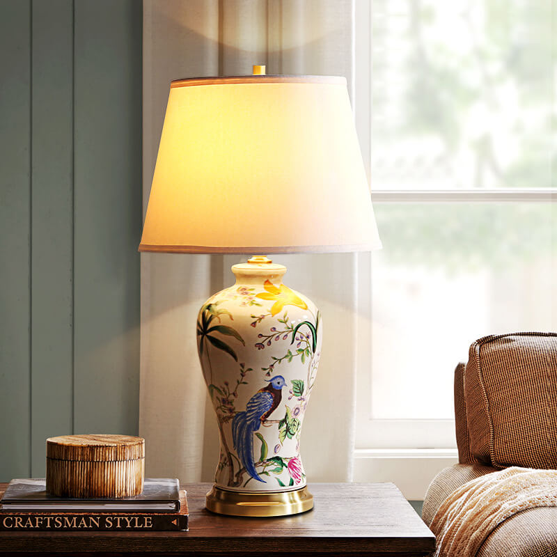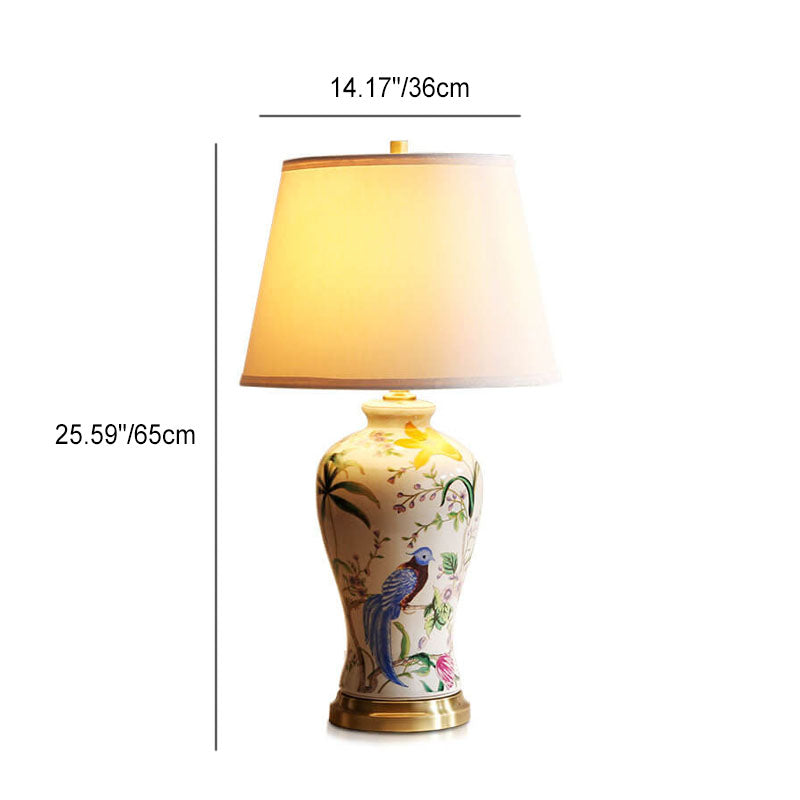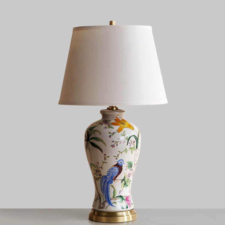 Traditional Chinese Bird & Flower Painted Ceramic Base Fabric Shade 1-Light Table Lamp For Home Office