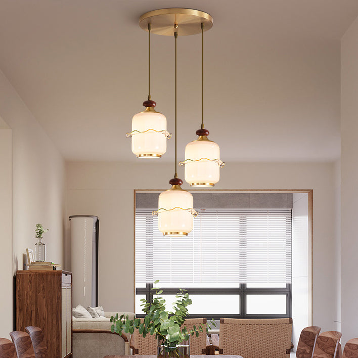 Traditional Chinese Brass Glass & Wood Cylindrical Wavy Edge Fixture 1/3/5-Light Pendant Light For Dining Room & Living Room