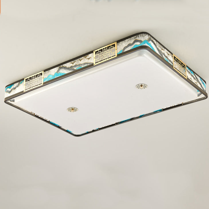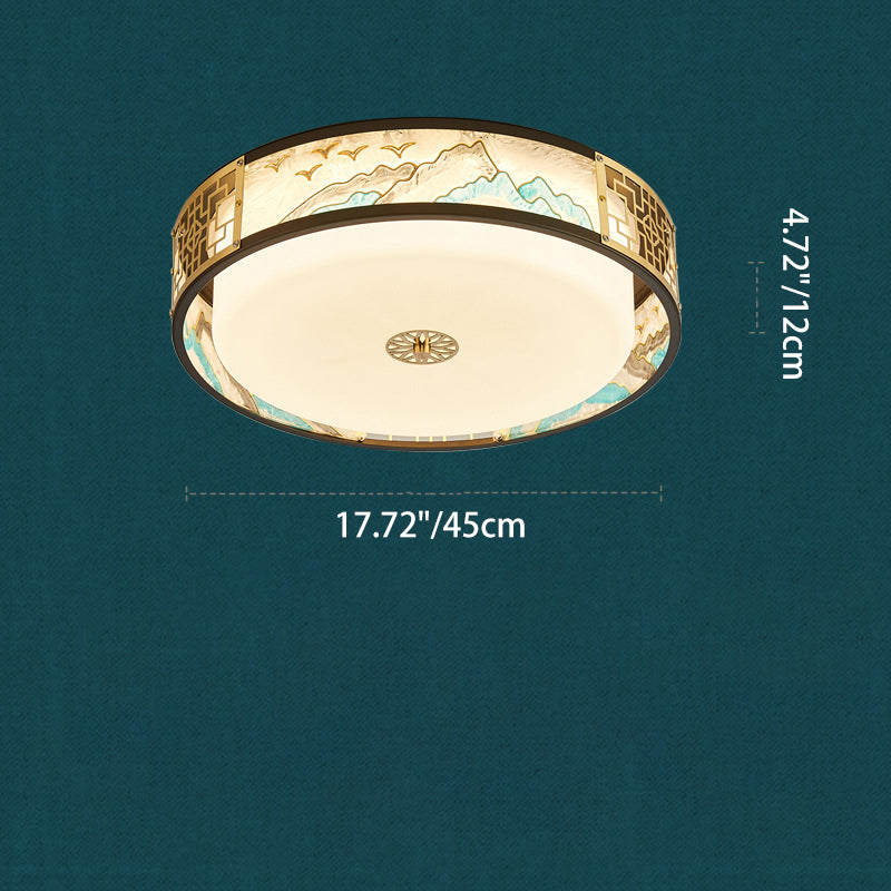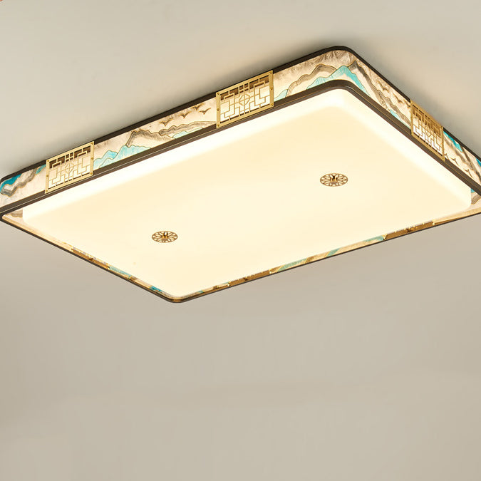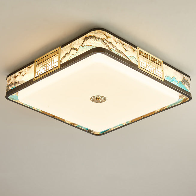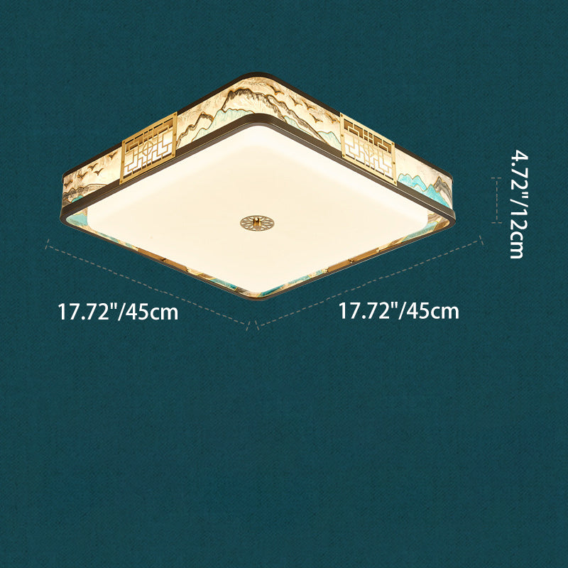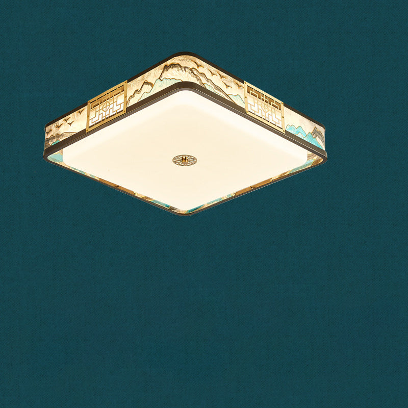 Traditional Chinese Copper Acrylic Enamel Painting Landscape Rectangular Square Round LED Flush Mount Ceiling Light For Bedroom