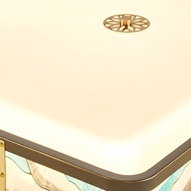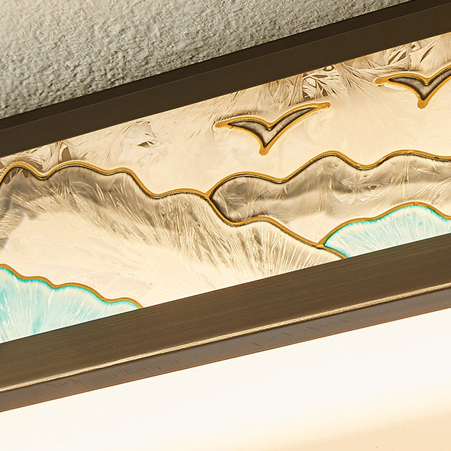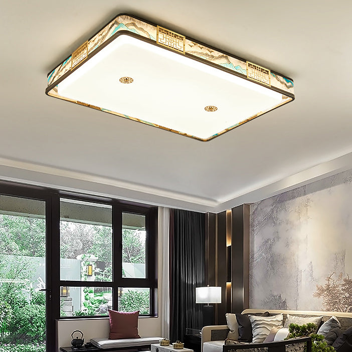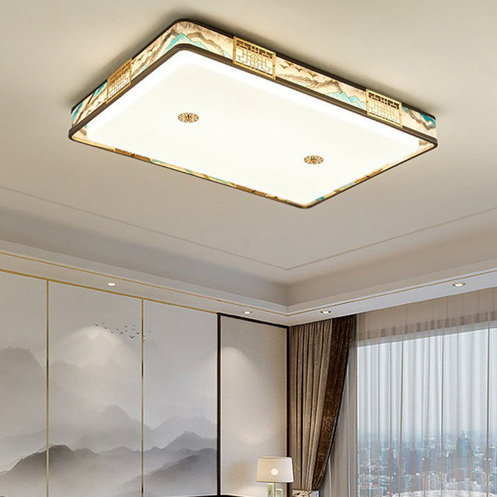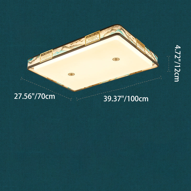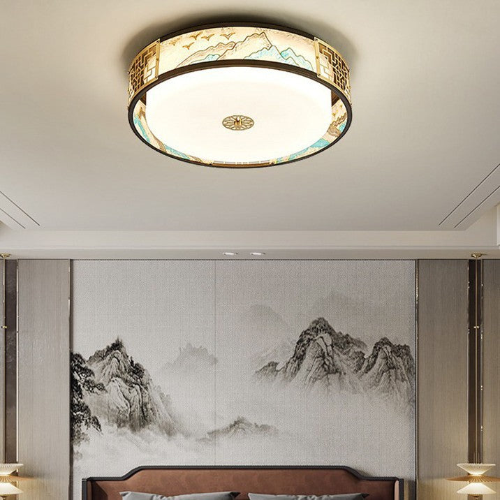 Traditional Chinese Copper Acrylic Enamel Painting Landscape Rectangular Square Round LED Flush Mount Ceiling Light For Bedroom