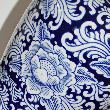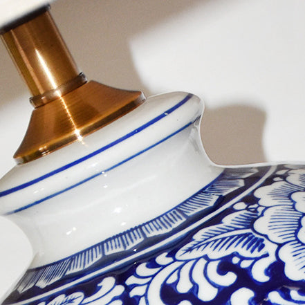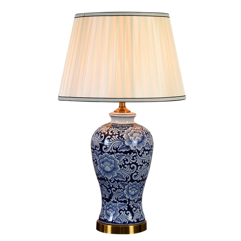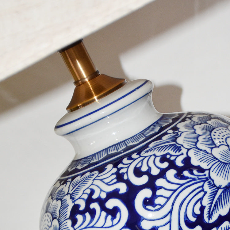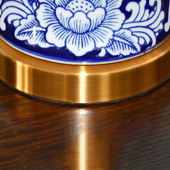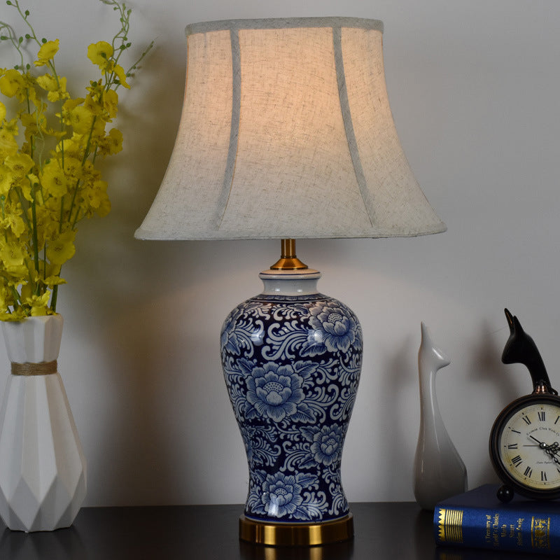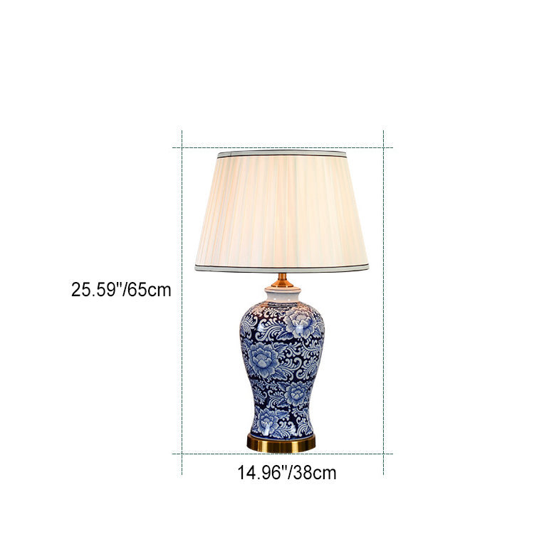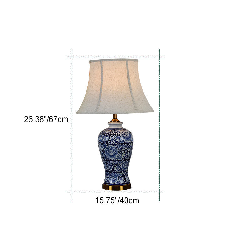 Traditional Chinese Fabric Shade Hand-Painted Celadon Base 1-Light Table Lamp For Living Room