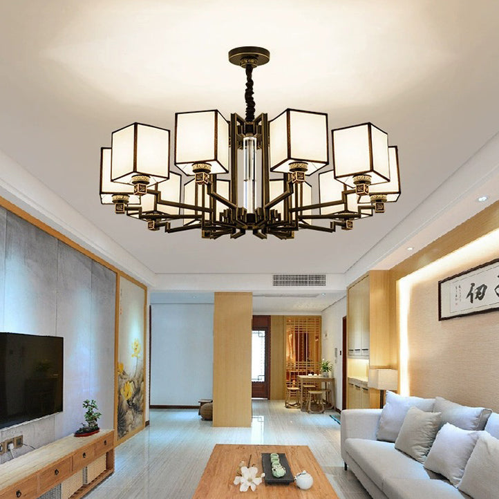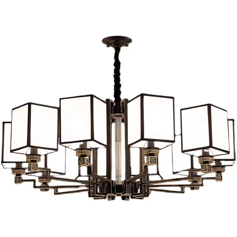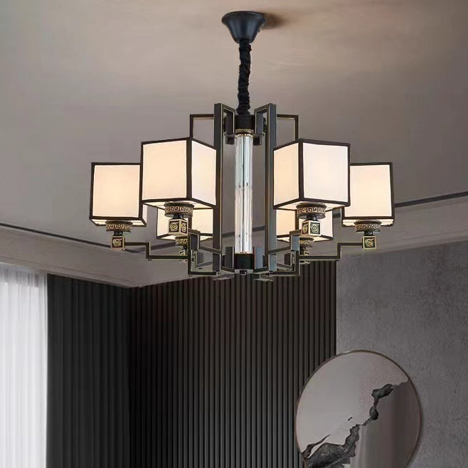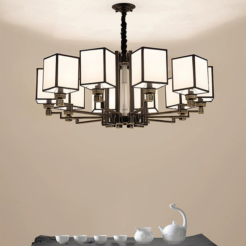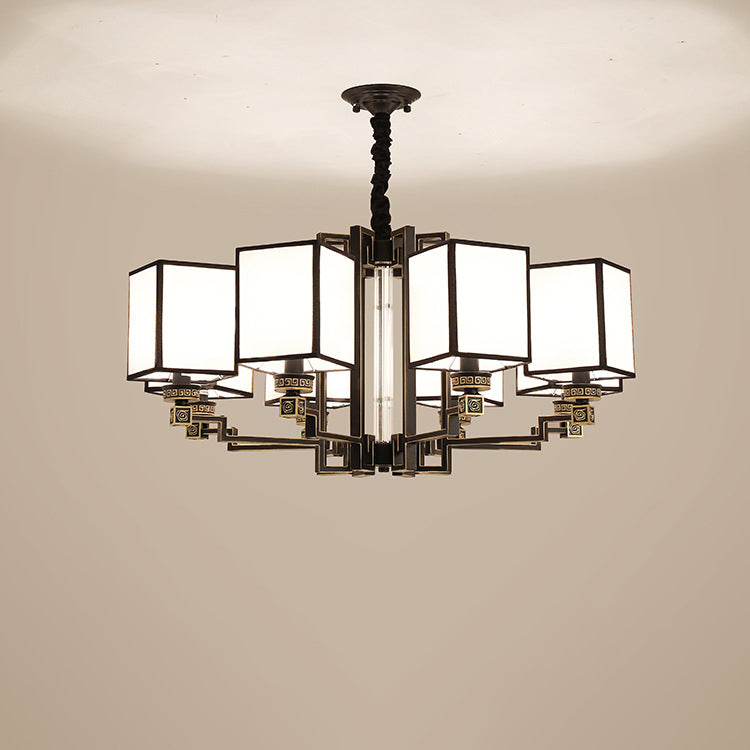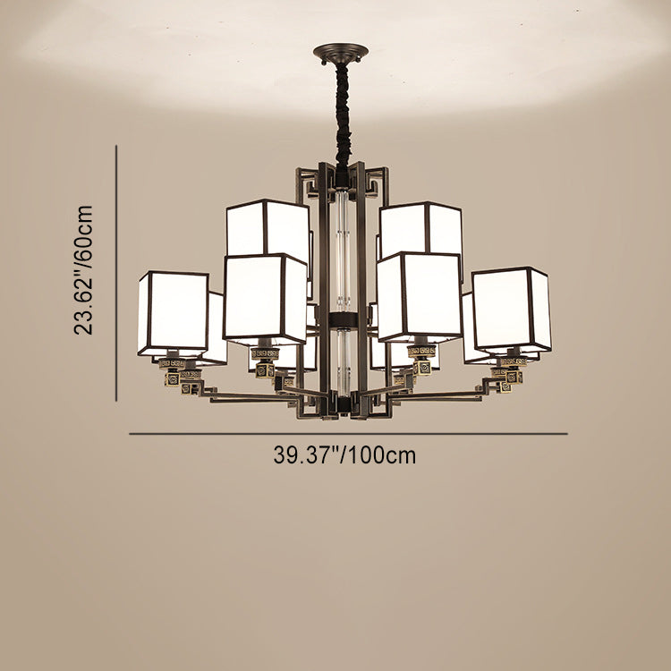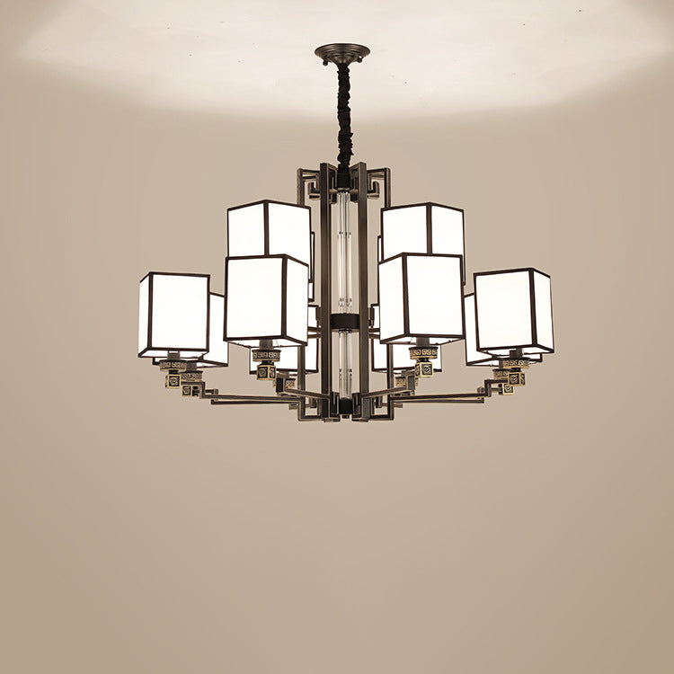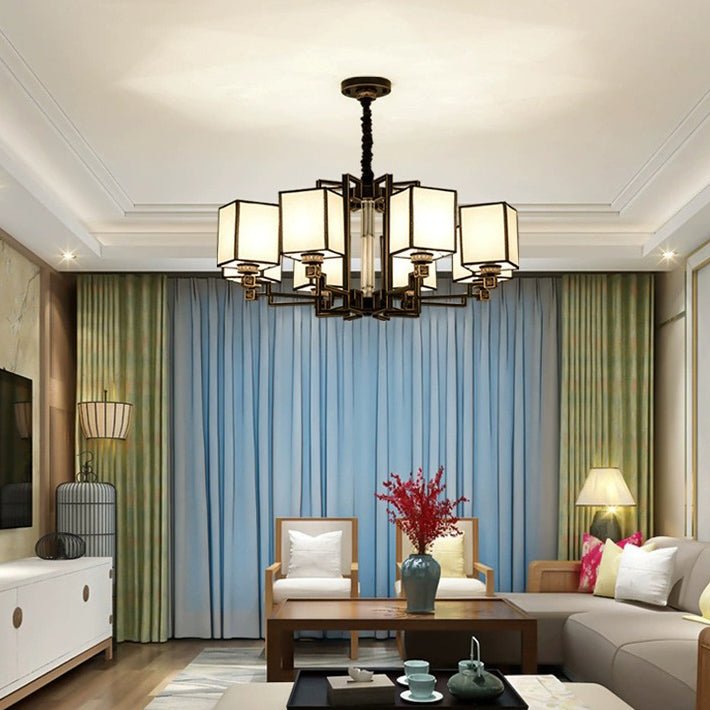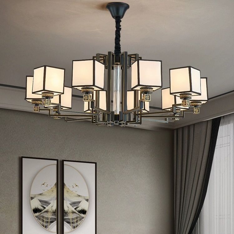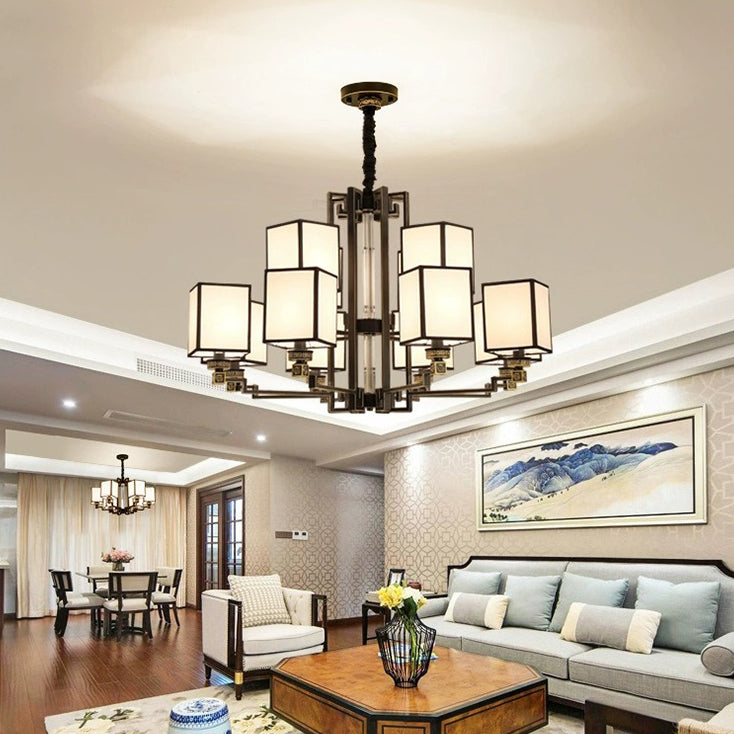 Traditional Chinese Iron Fabric Cubic Rectangular 3/6/8/10/12 Light Chandeliers For Living Room
