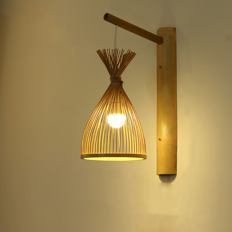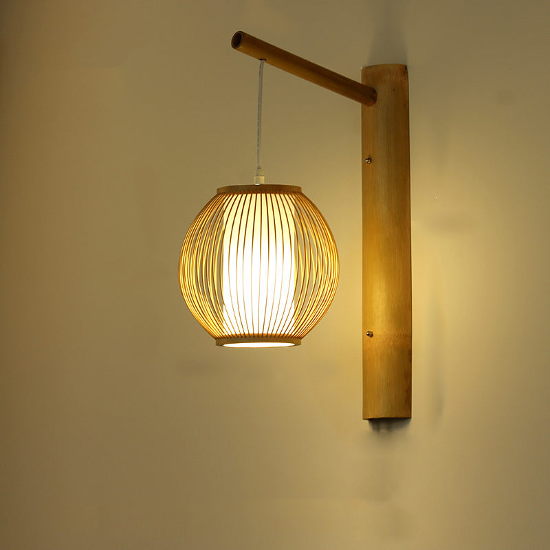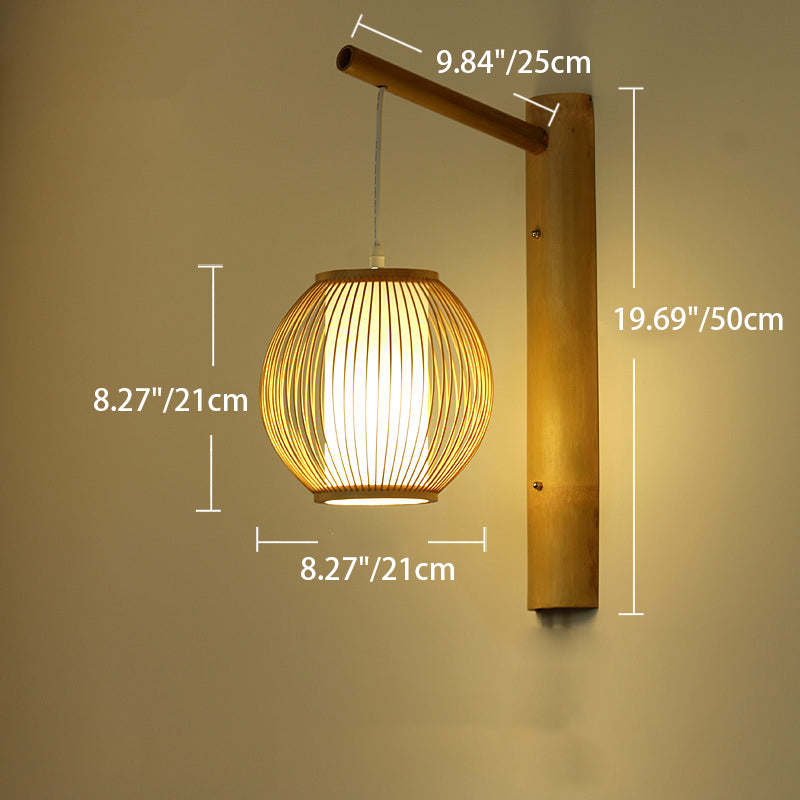 Traditional Chinese Lantern Braid Skeleton Bamboo Wood 1-Light Wall Sconce Lamp For Living Room