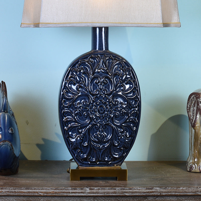 Traditional Chinese Oval Ceramic Fabric Lampshade Copper Base 1-Light Table Lamp For Living Room