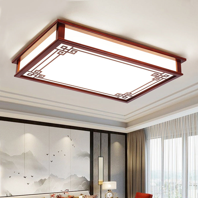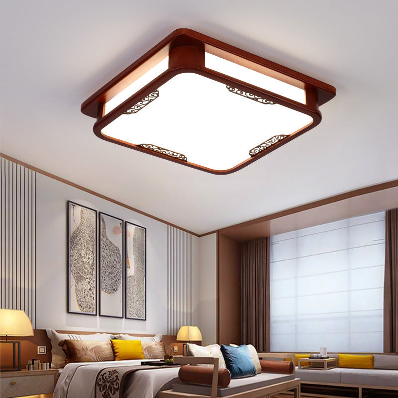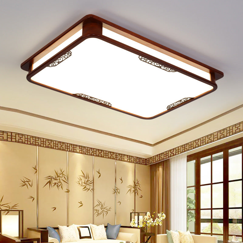 Traditional Chinese Pine Solid Wood Diffusion Plate Knot Square Rectangular LED Flush Mount Ceiling Light For Bedroom