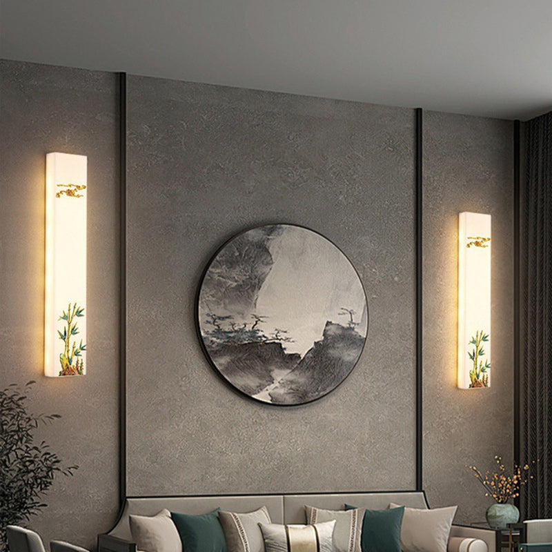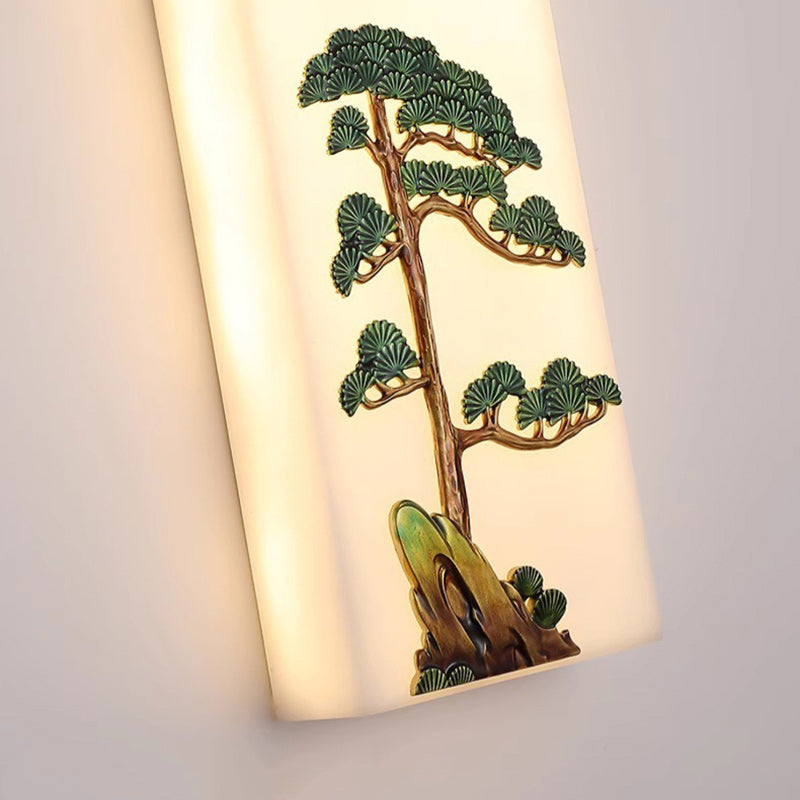 Traditional Chinese Resin Imitation Marble Zinc Alloy Enamel Rectangular Bamboo Flower Pine Tree LED Wall Sconce Lamp For Bedside
