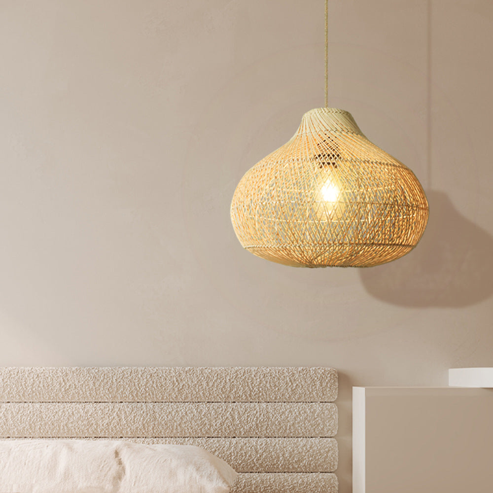Traditional Chinese Round Weaving Wood 1-Light Pendant Light For Dining Room