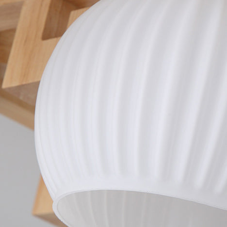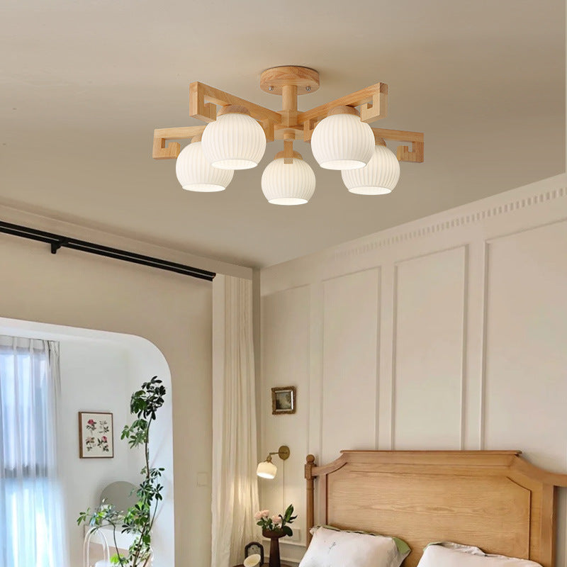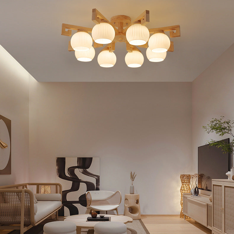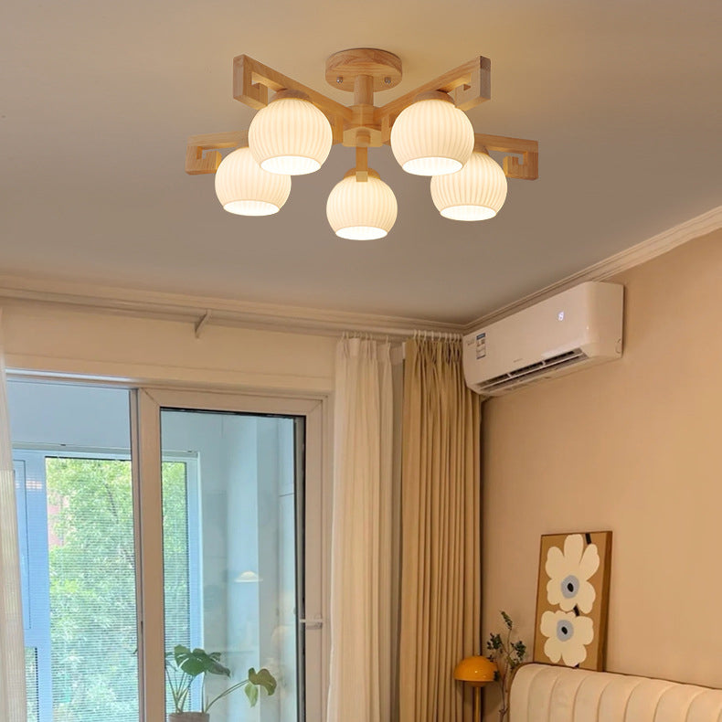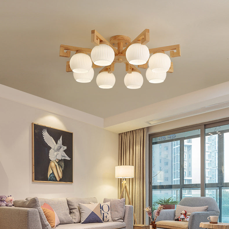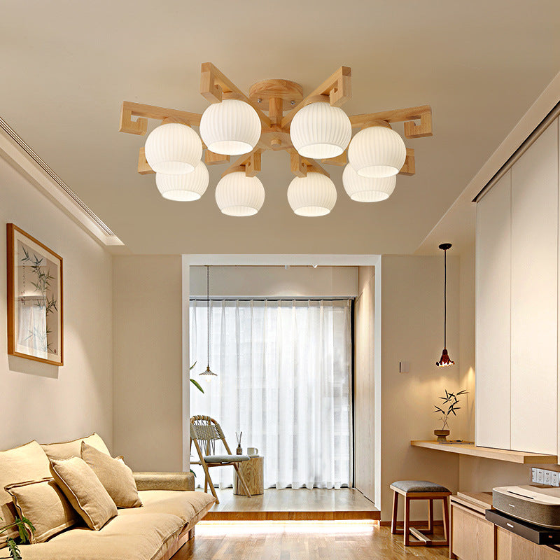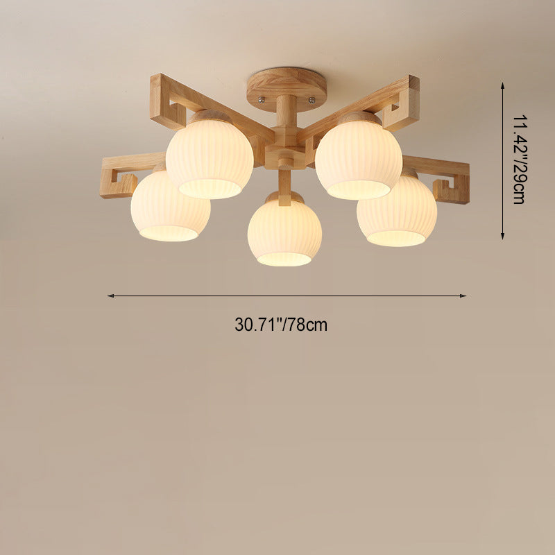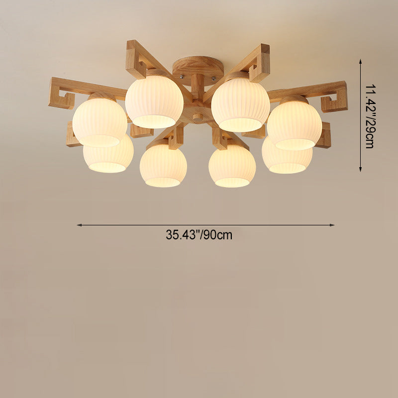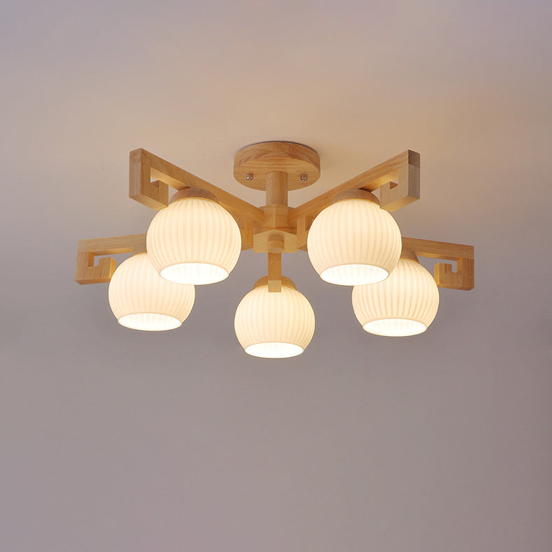 Traditional Chinese Solid Wood Striped Glass Round Globe Shade Branch 5/8 Light Chandeliers For Living Room