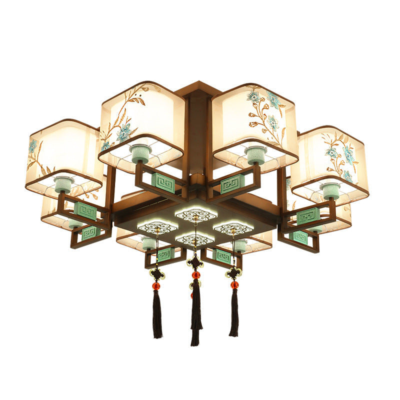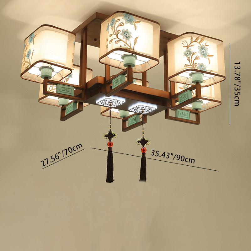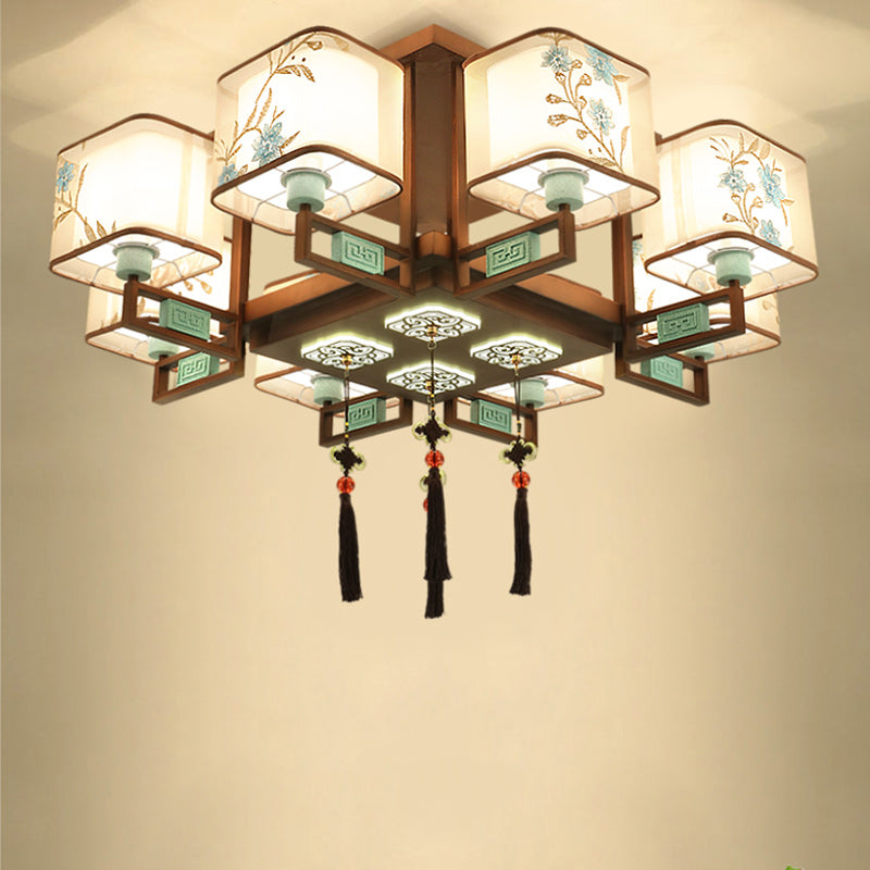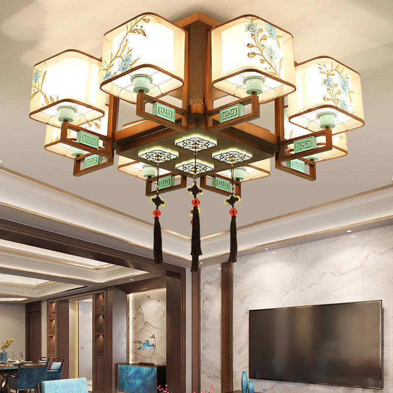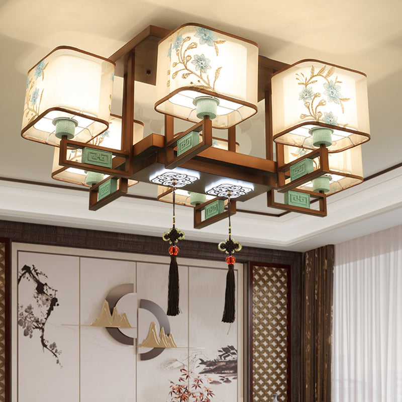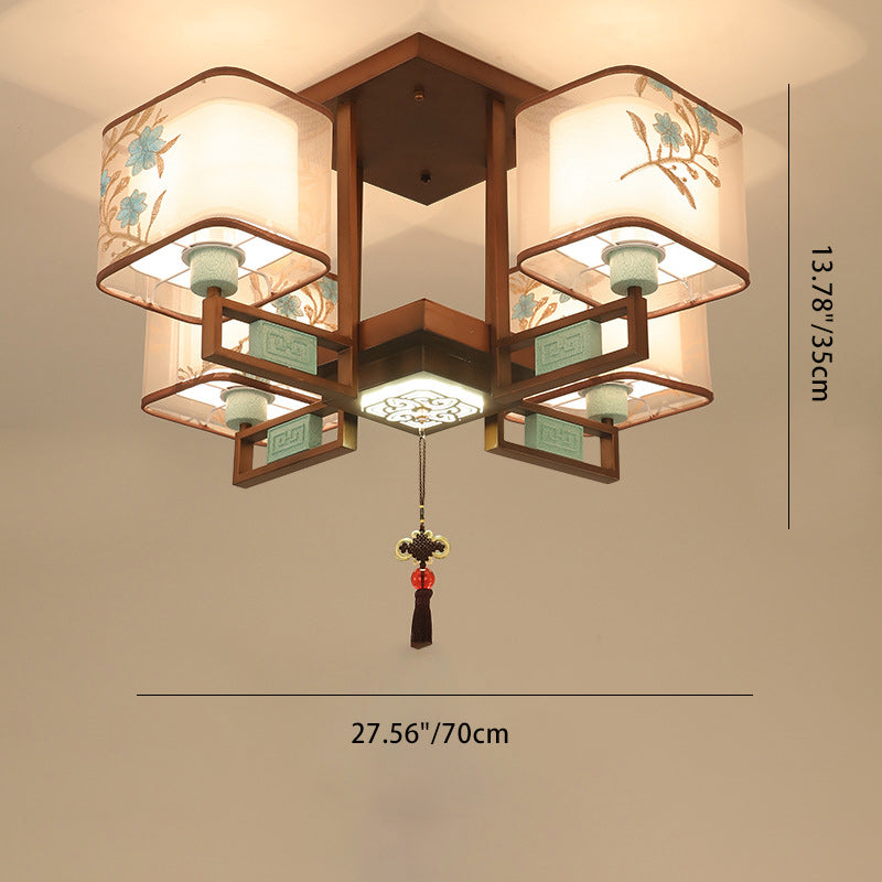 Traditional Chinese Square Fabric Pattern Embroidery Lampshade Iron 4/6/8 - Light Chandeliers For Living Room