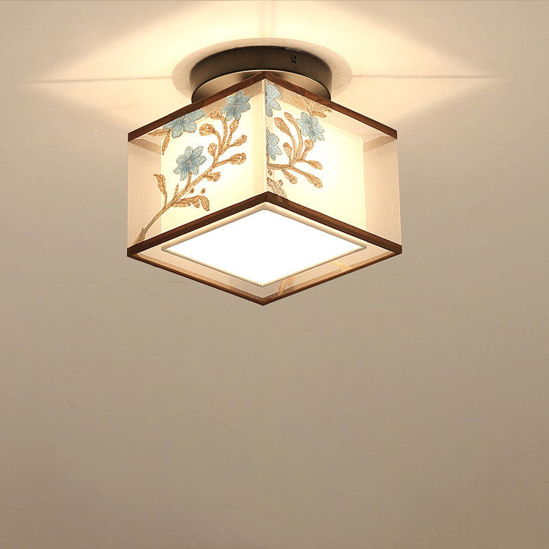 Traditional Chinese Square Iron Fabric 1-Light Semi-Flush Mount Ceiling Light For Hallway