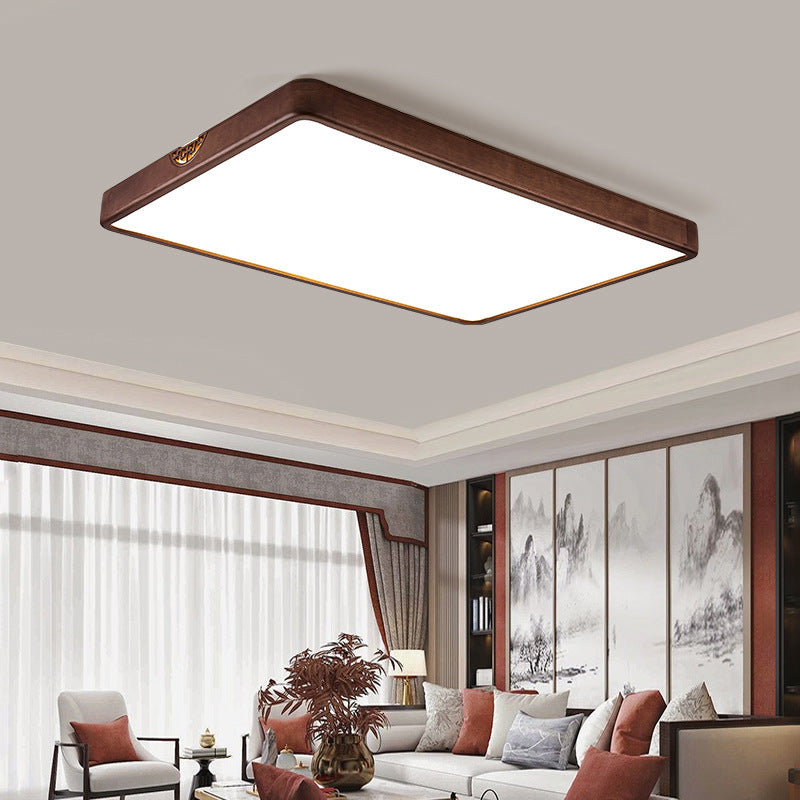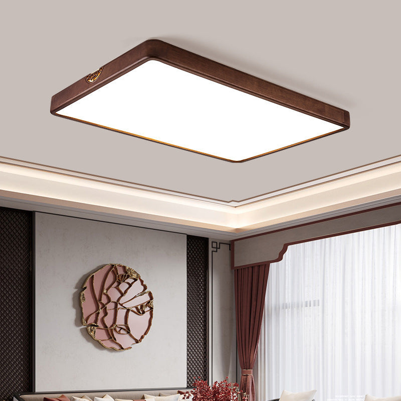 Traditional Chinese Square Rectangle Walnut Grain Rubber Wood Hardware PVC Shade LED Flush Mount Ceiling Light For Living Room