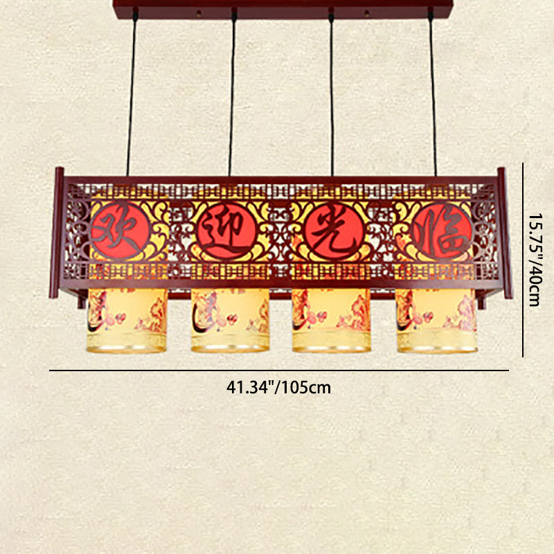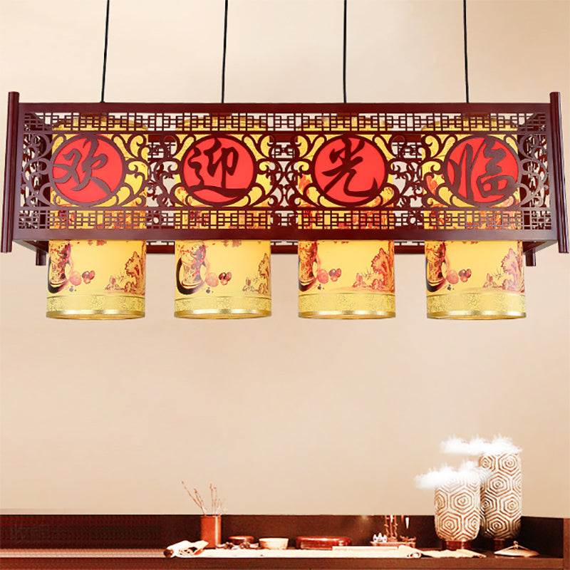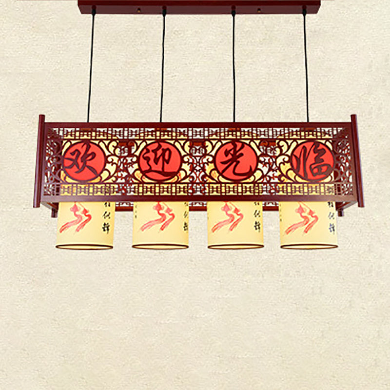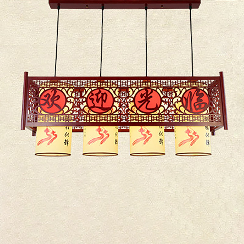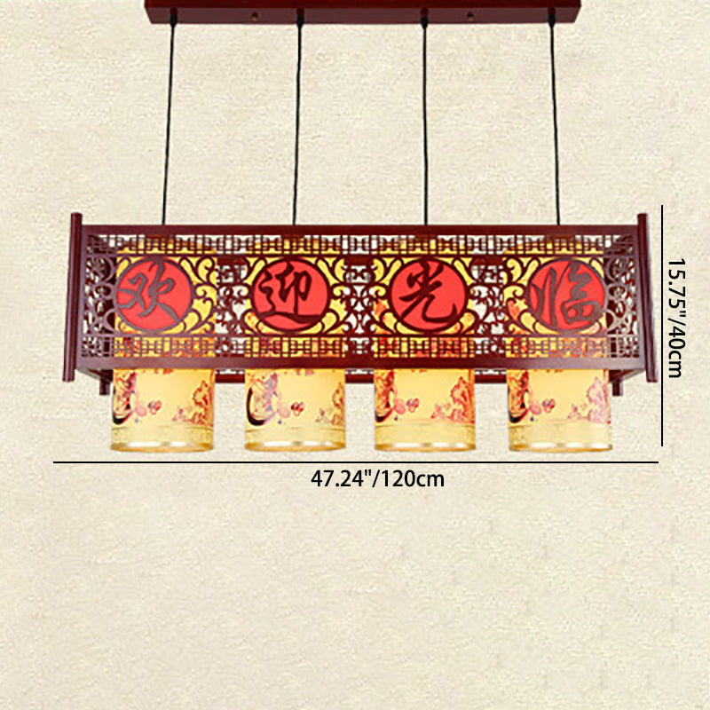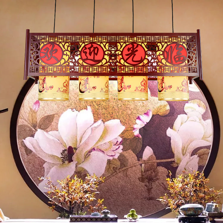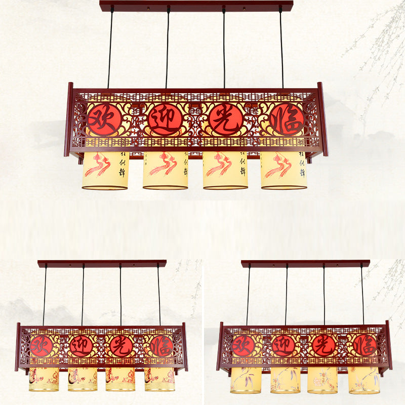 Traditional Chinese Wood PVC Imitation Sheepskin Rectangular Cylinder 4-Light Chandelier For Dining Room