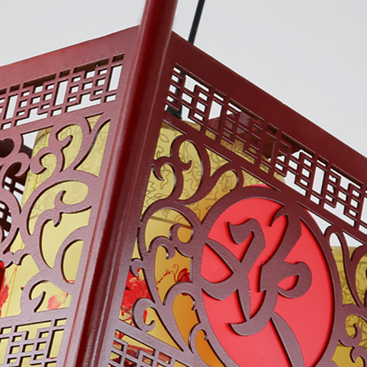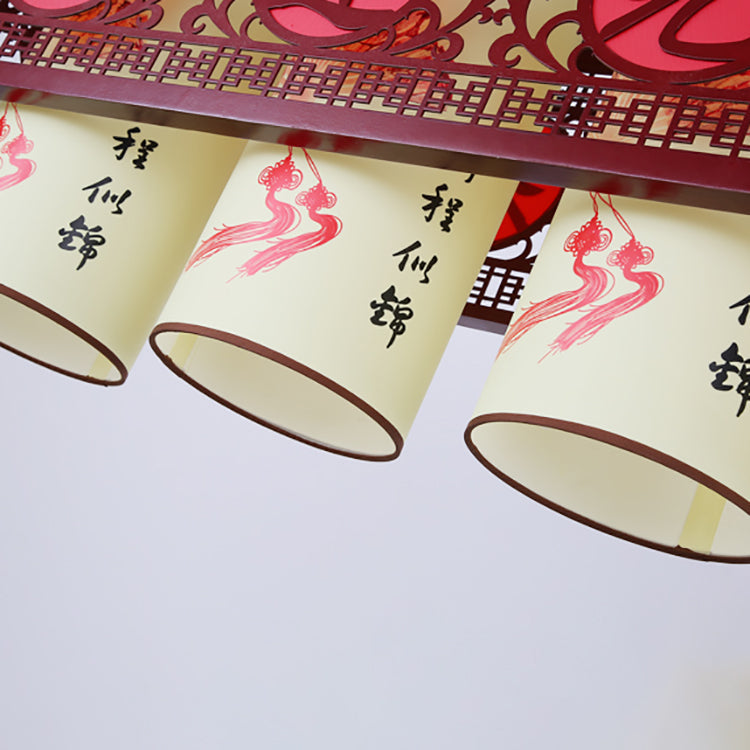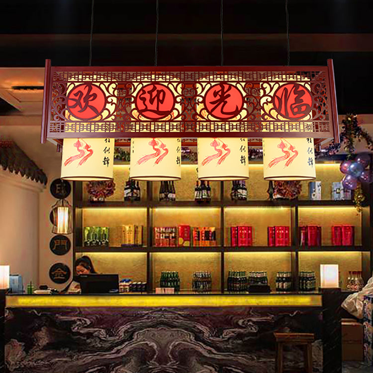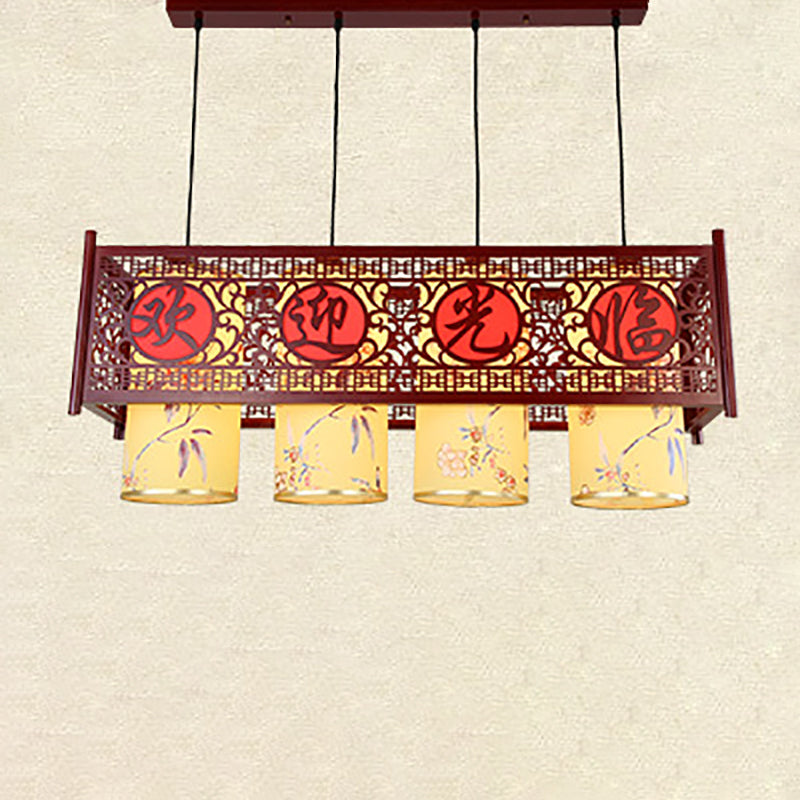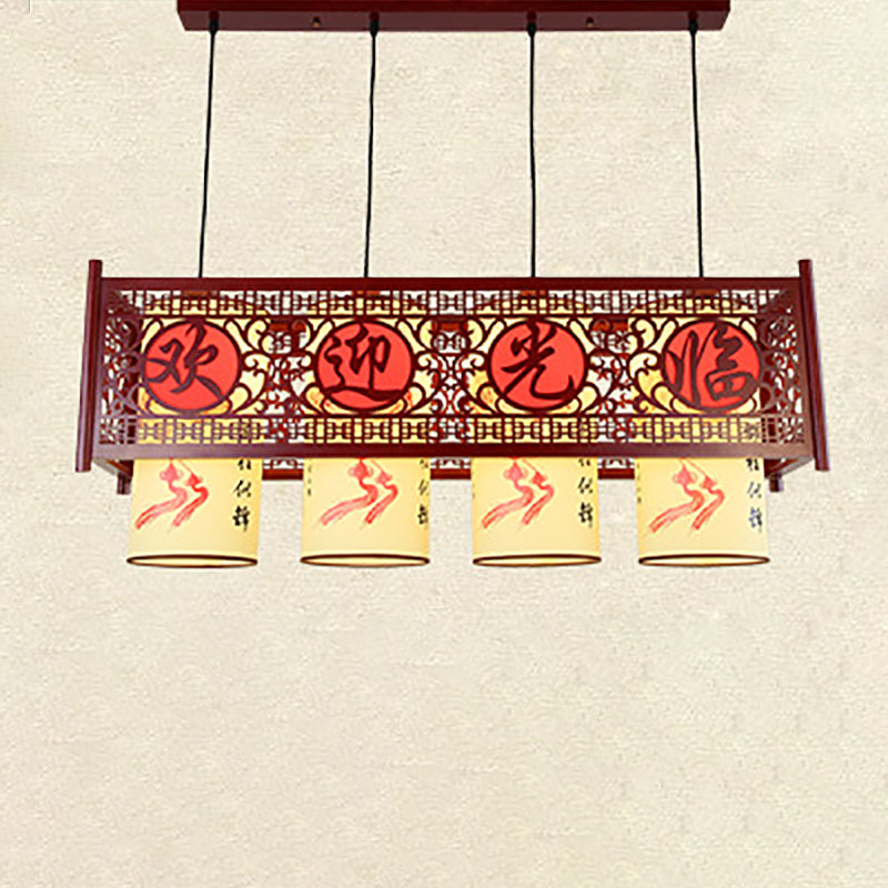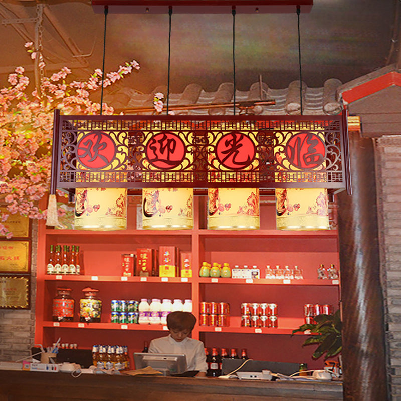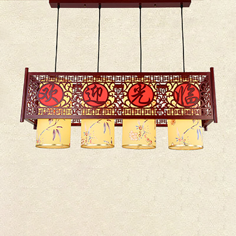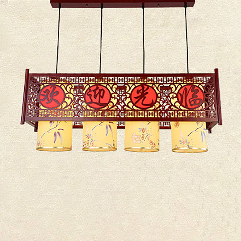 Traditional Chinese Wood PVC Imitation Sheepskin Rectangular Cylinder 4-Light Chandelier For Dining Room