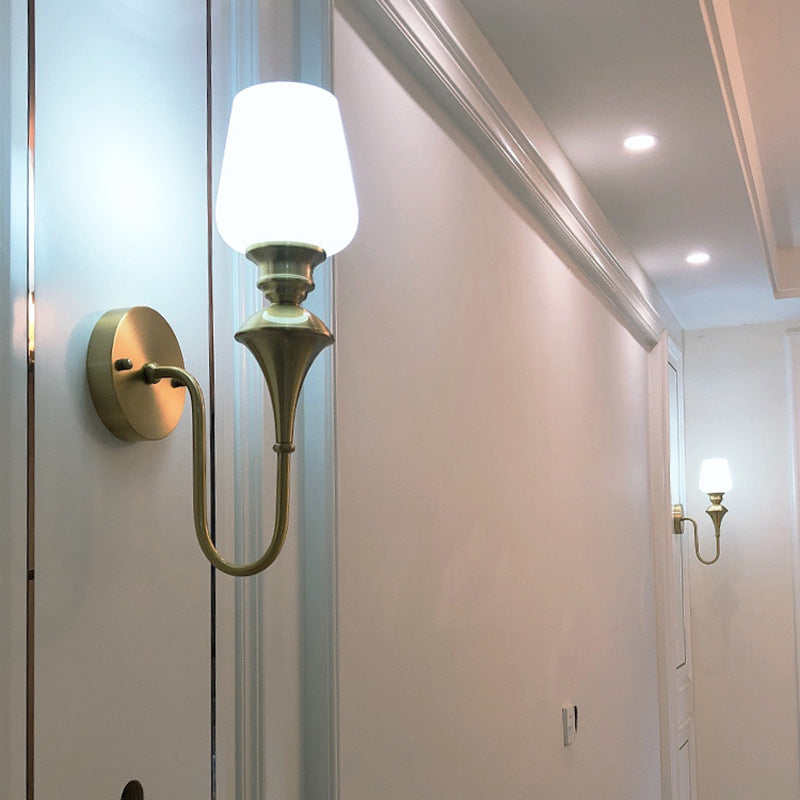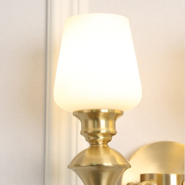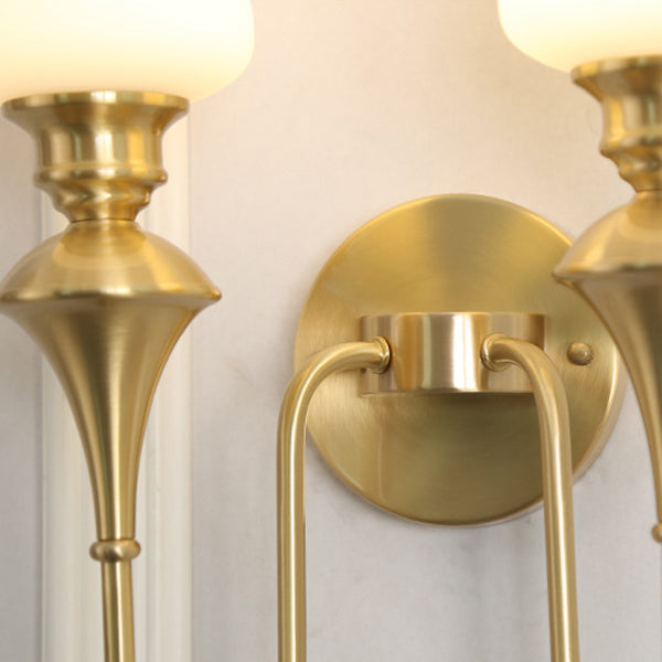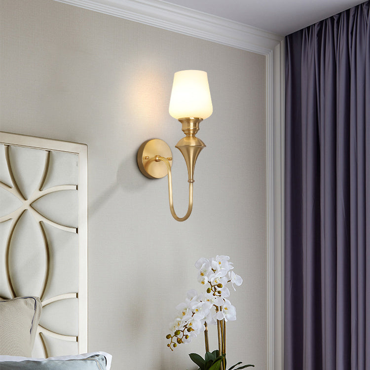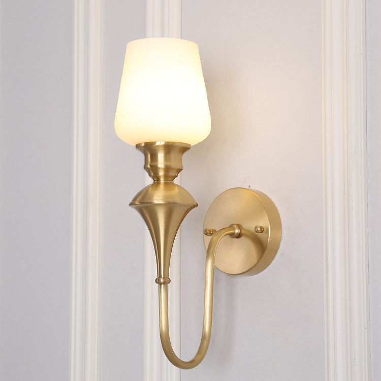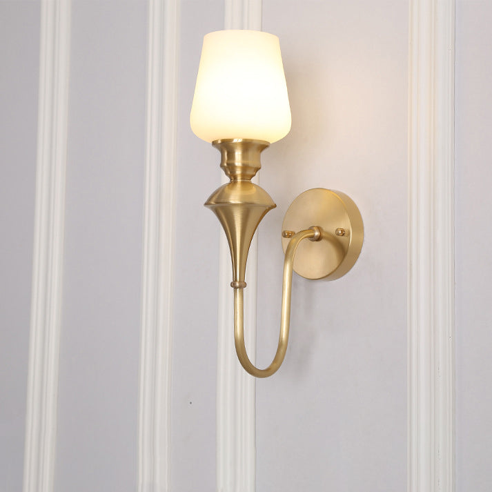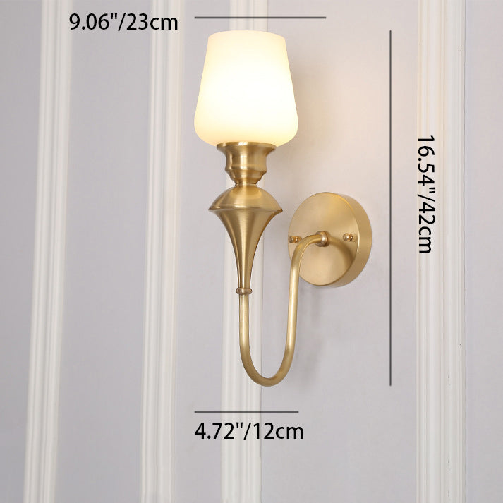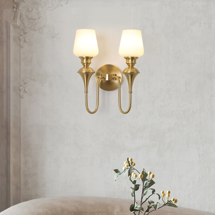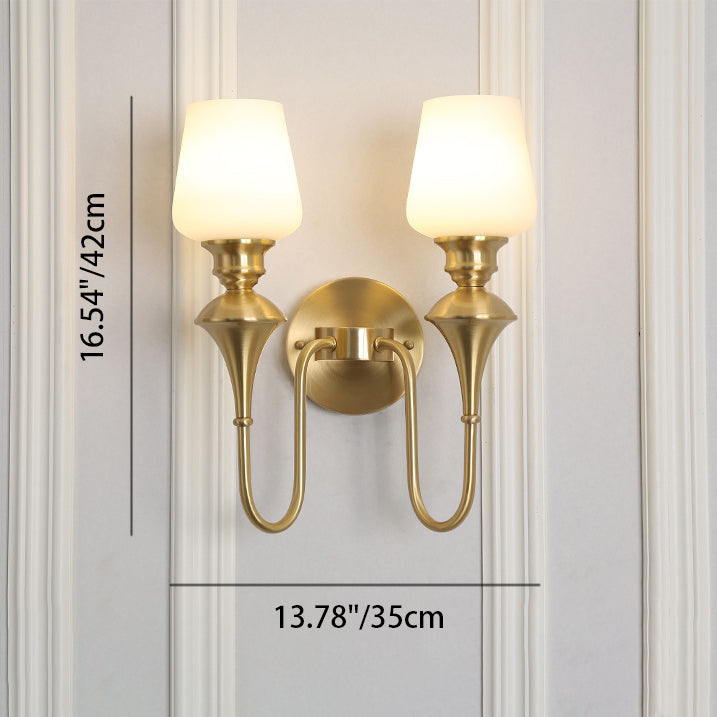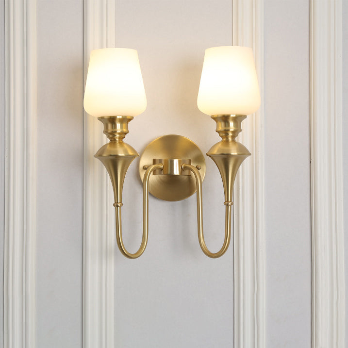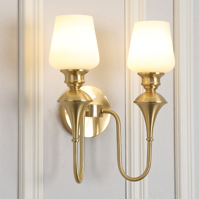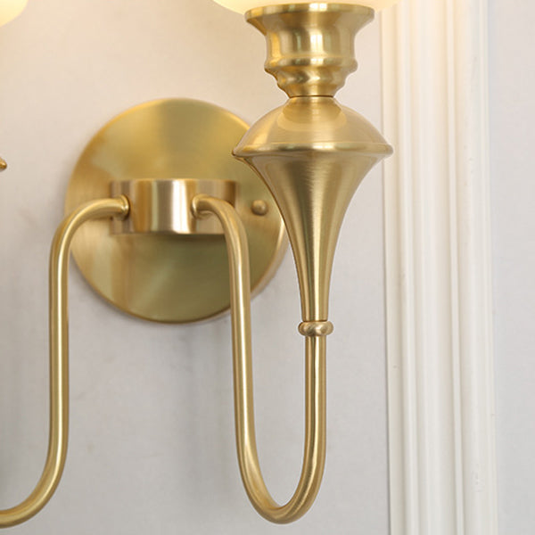 Traditional European Curved Rod Candle Holder Cup Shape Full Brass Frame Glass Shade 1/2 Light Wall Sconce Lamp For Living Room